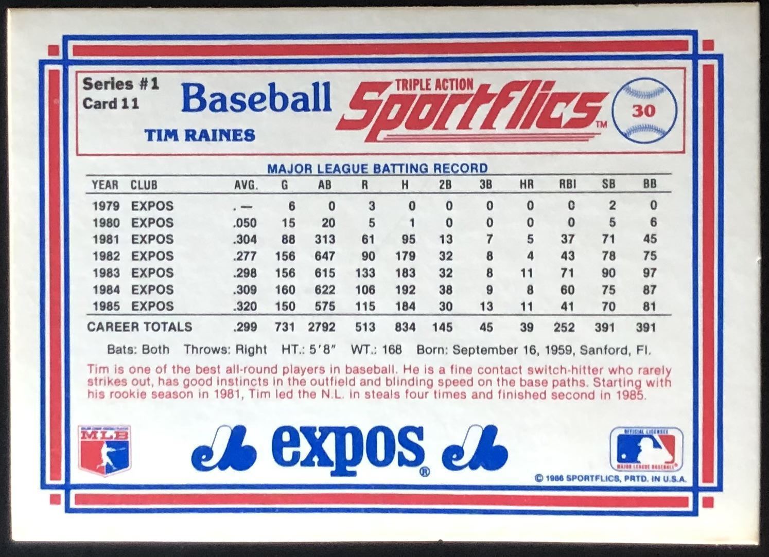 Lot 633 1986 SPORT FLICS TIM RAINES (HOF)