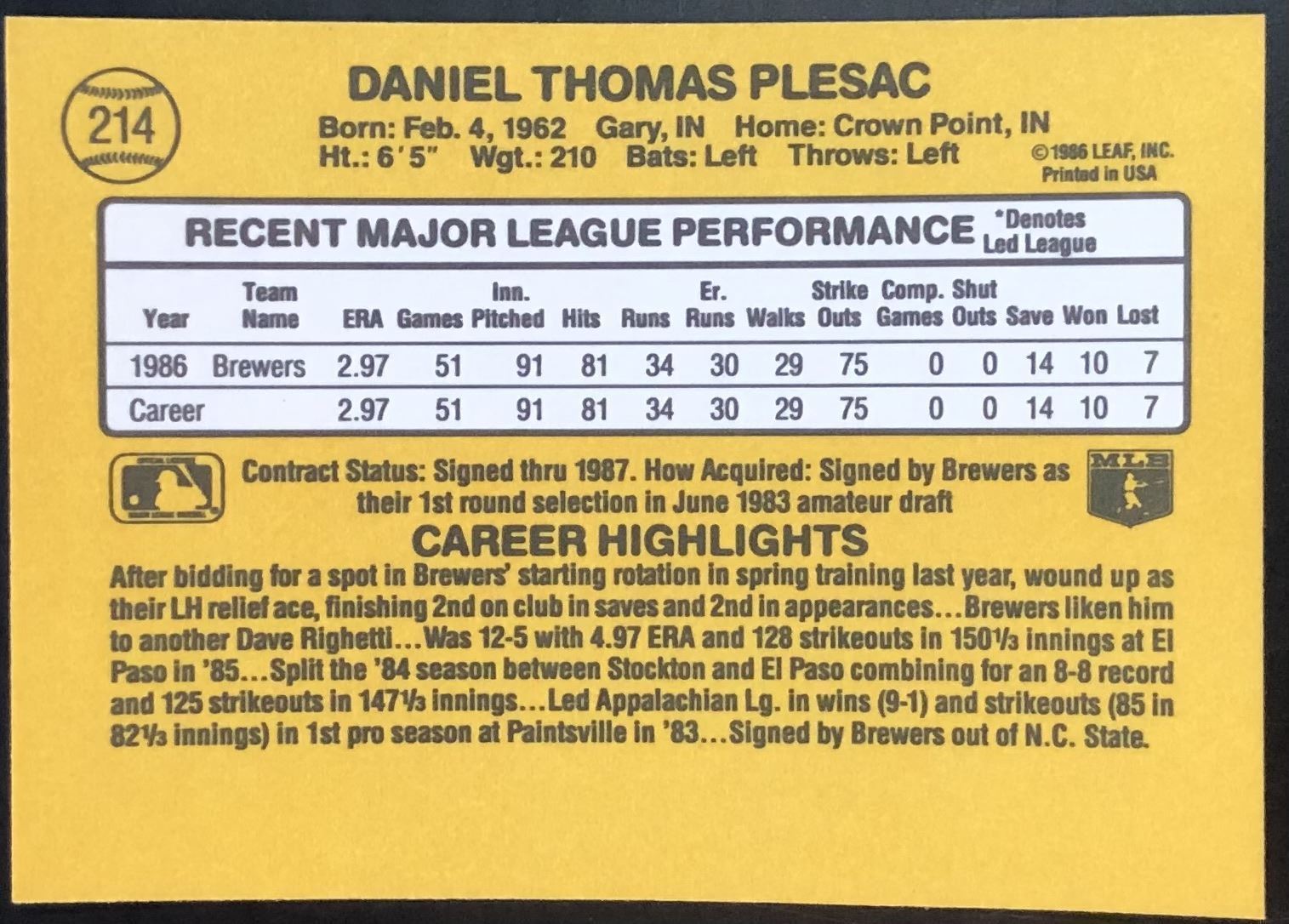 Lot 635 1987 DONRUSS DAN PLESAC ROOKIE CARD
