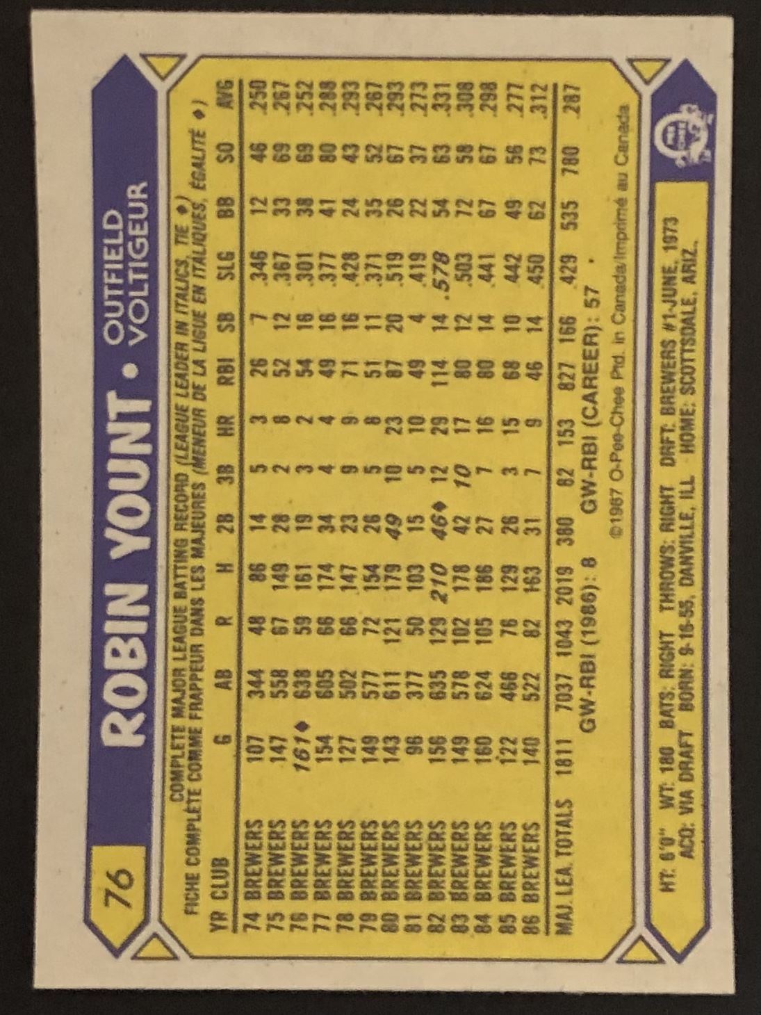 Lot 655 1987 O-PEE-CHEE ROBIN YOUNT (HOF)