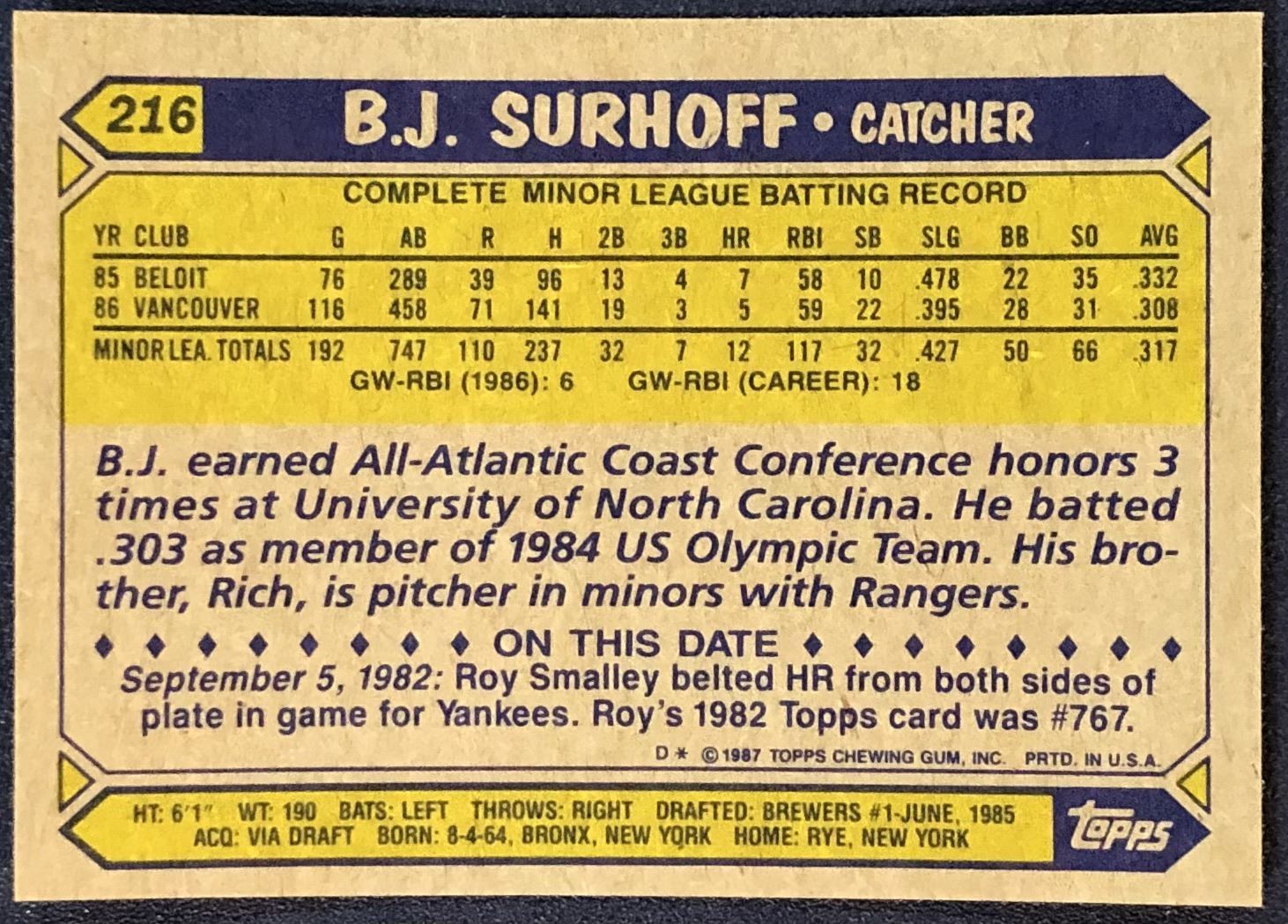 Lot 658 1987 TOPPS B.J. SURHOFF ROOKIE CARD