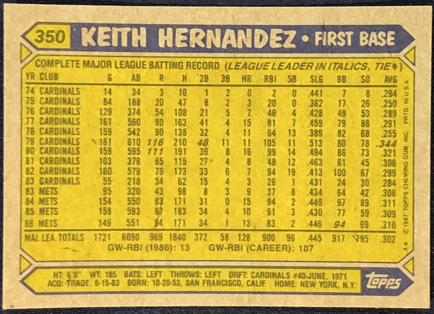 Lot 672 1987 TOPPS KEITH HERNANDEZ