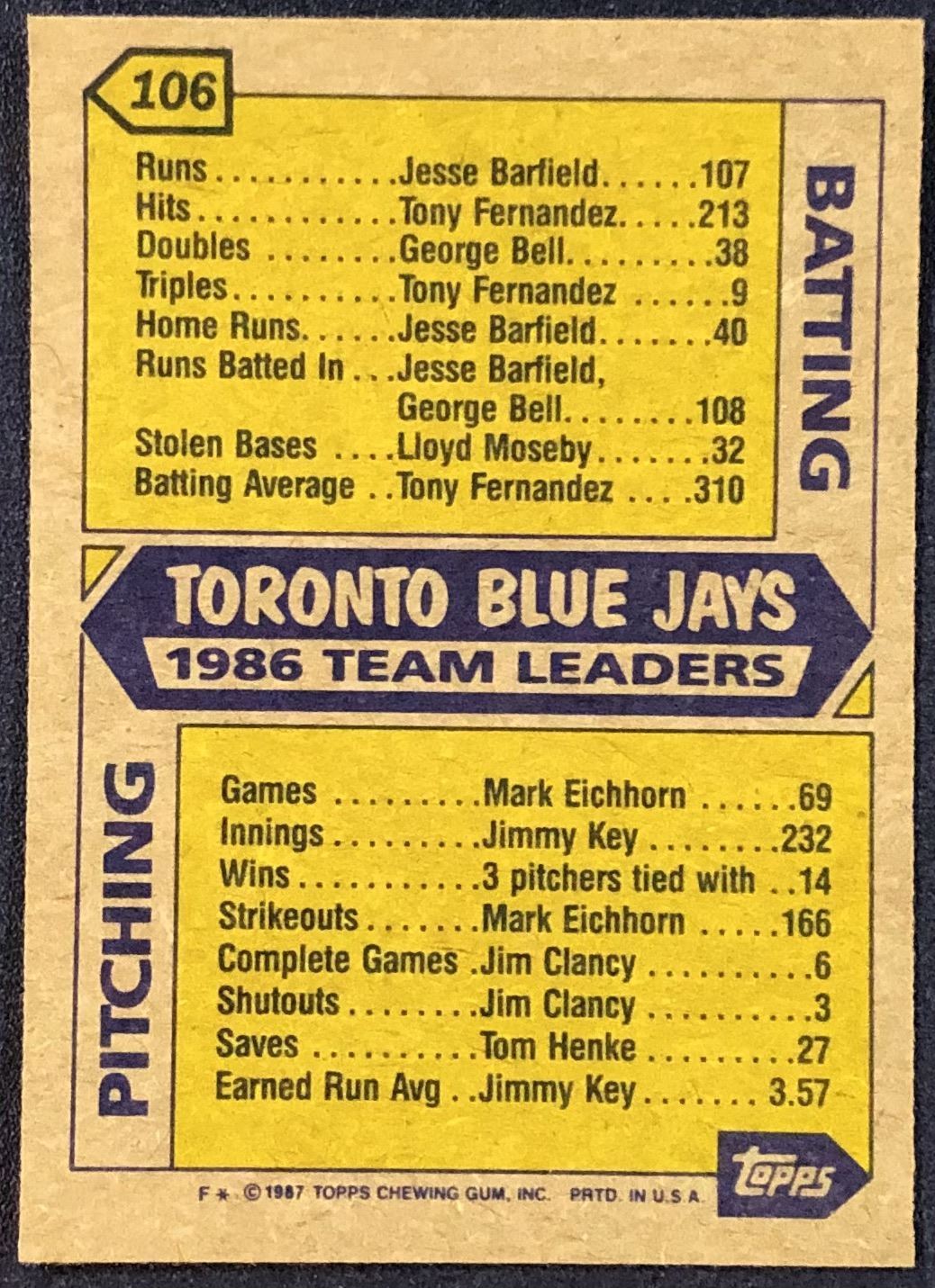 Lot 685 1987 TOPPS TORONTO BLUE JAYS
