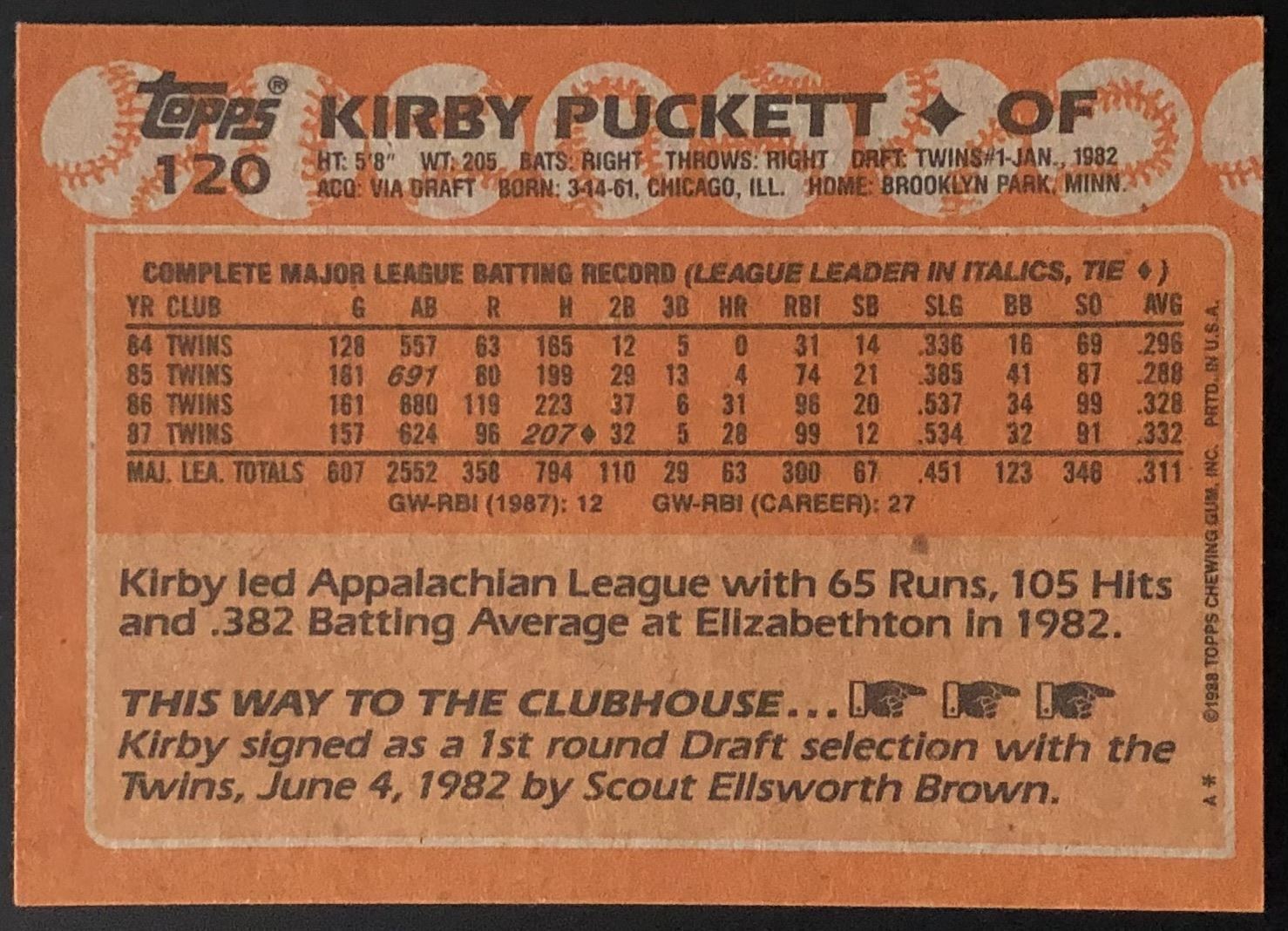 Lot 705 1988 TOPPS KIRBY PUCKETT (HOF)