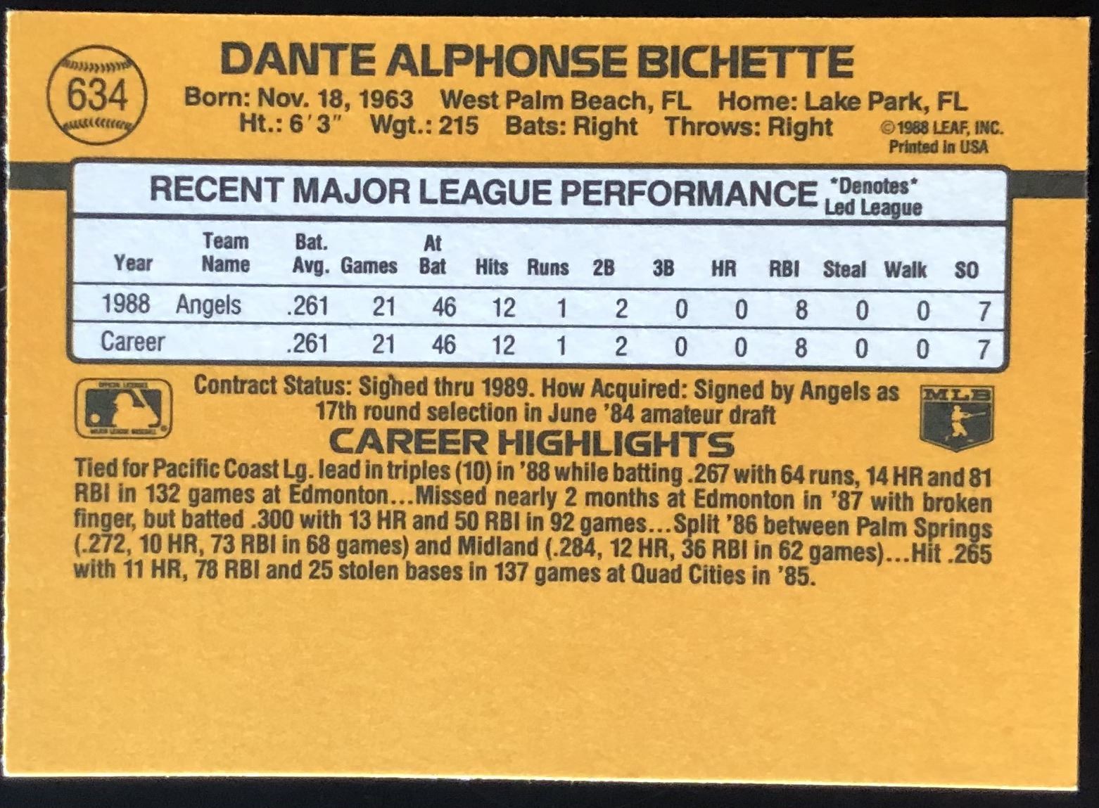 Lot 714 1989 DONRUSS DANTE BICHETTE ROOKIE CARD