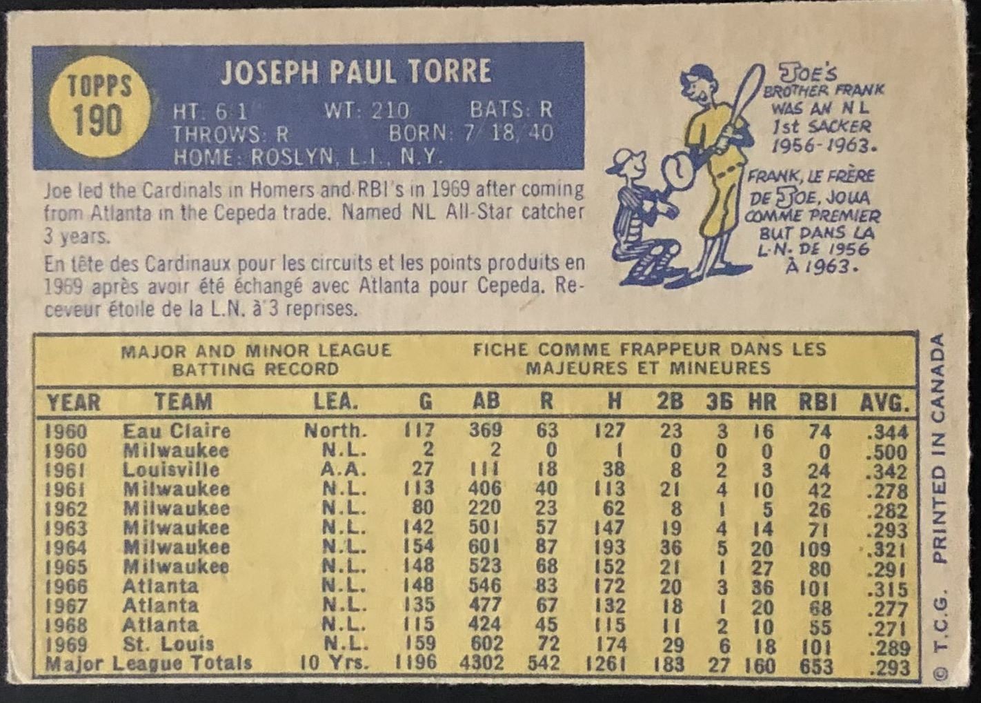 Card #190 MLB, baseball, vintage, OPC, hall of fame