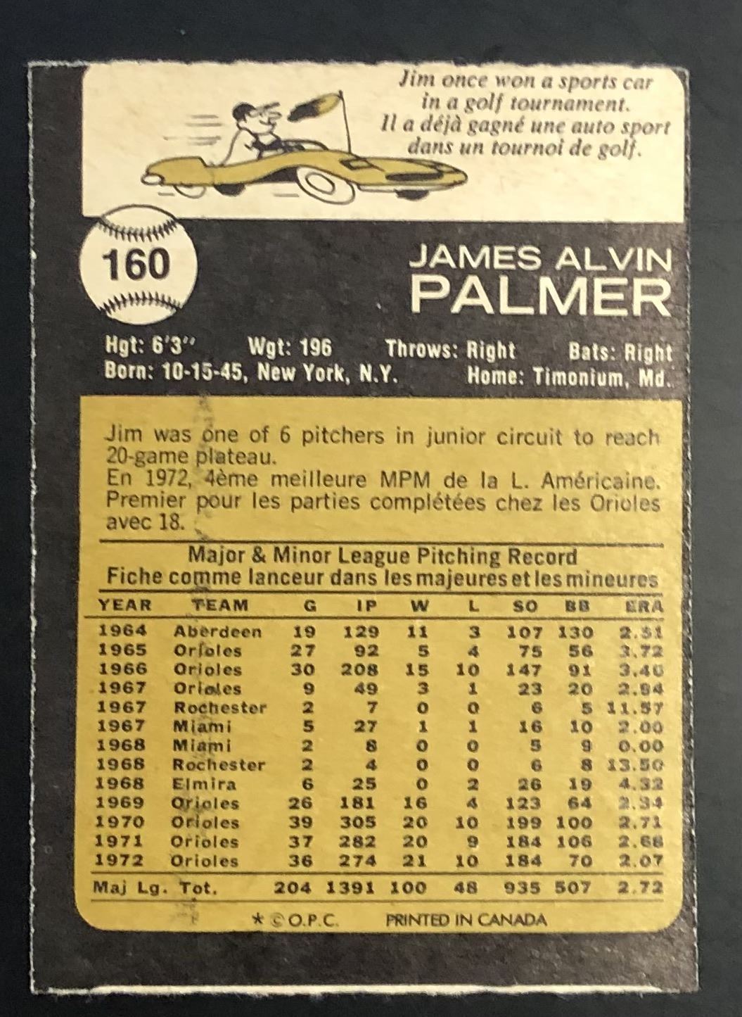 Lot 874 1973 O-PEE-CHEE JIM PALMER (HOF)