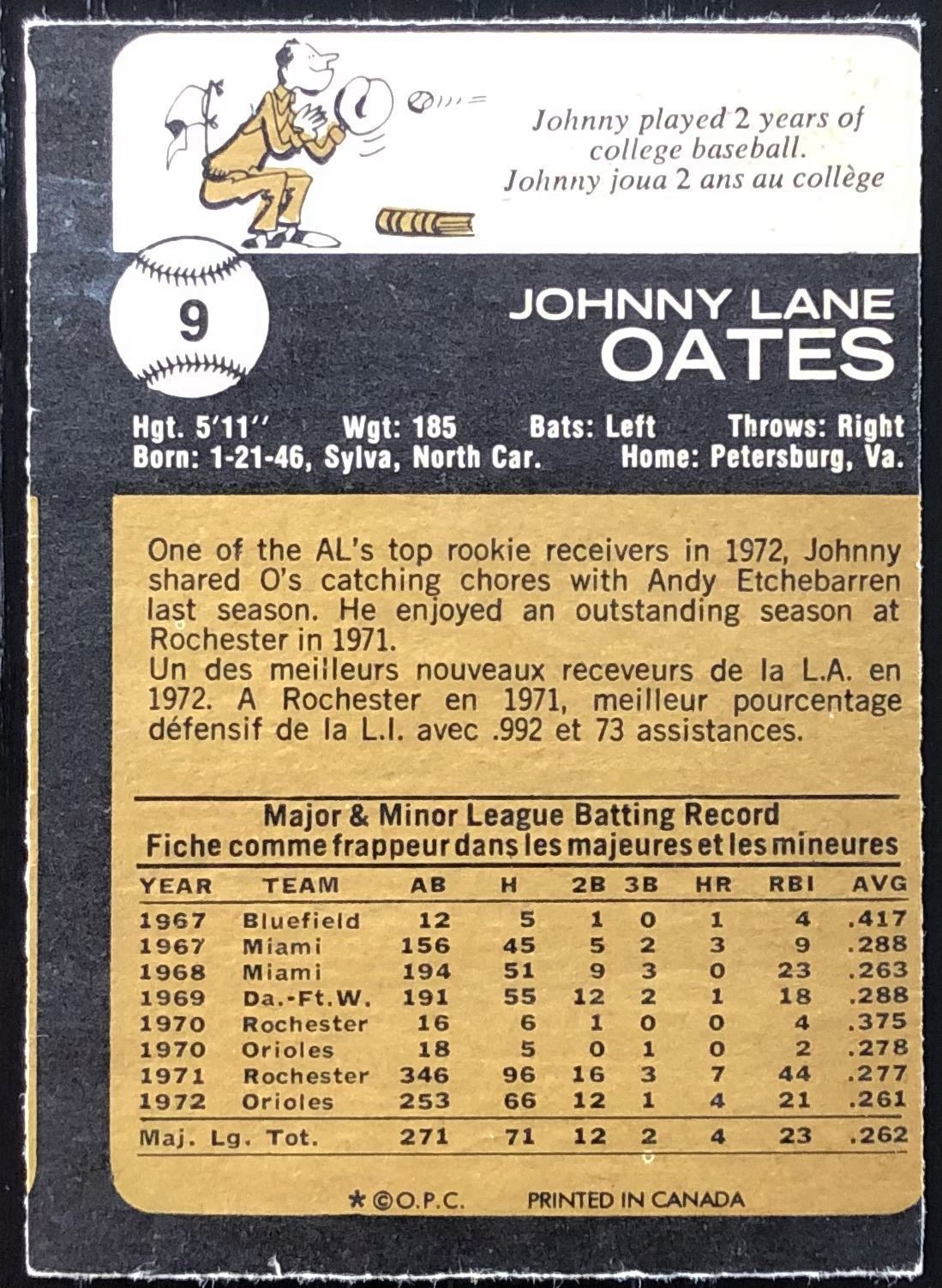 Lot 875 1973 O-PEE-CHEE JOHNNY OATES ROOKIE CARD