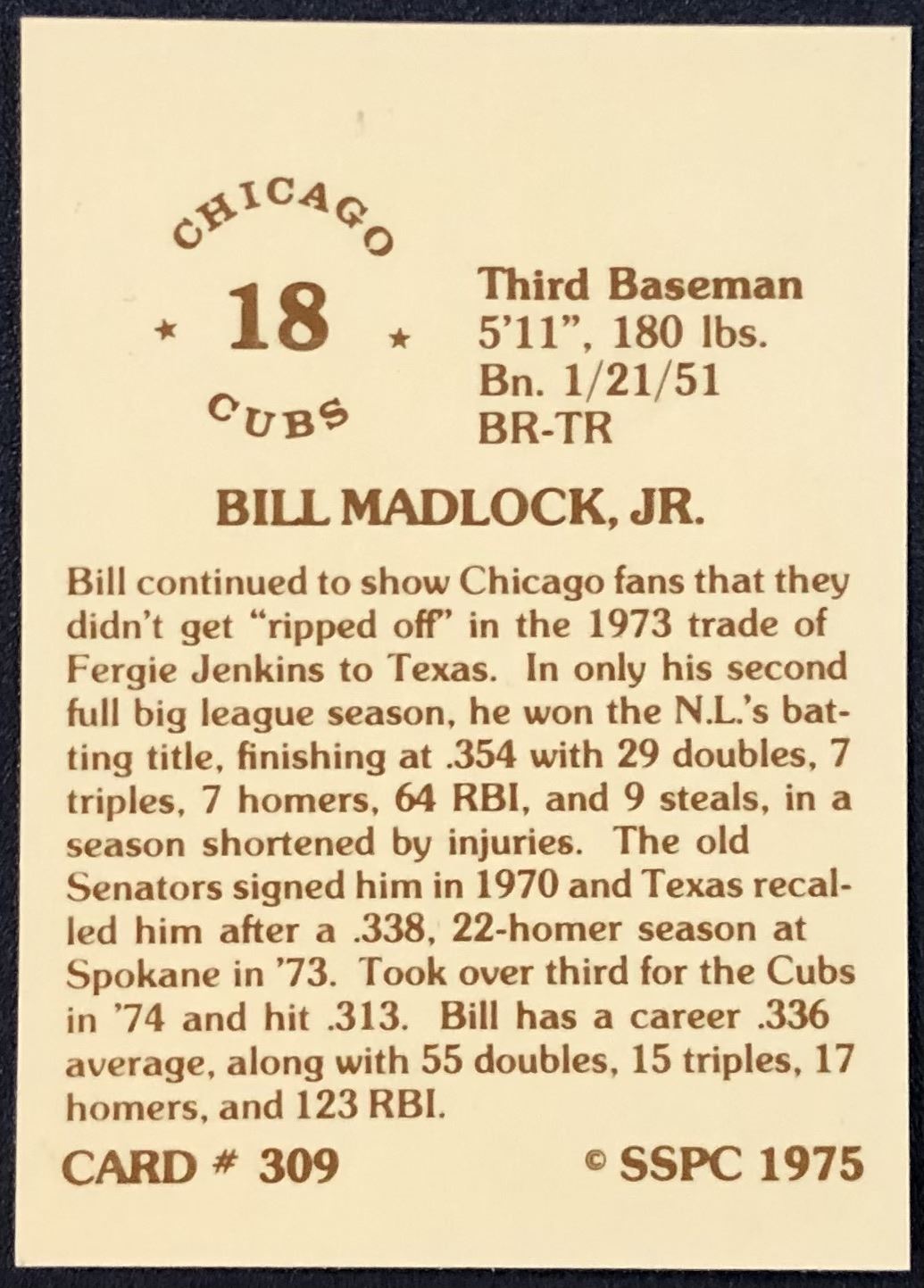 Lot 882 1975 SSPC BASEBALL BILL MADLOCK