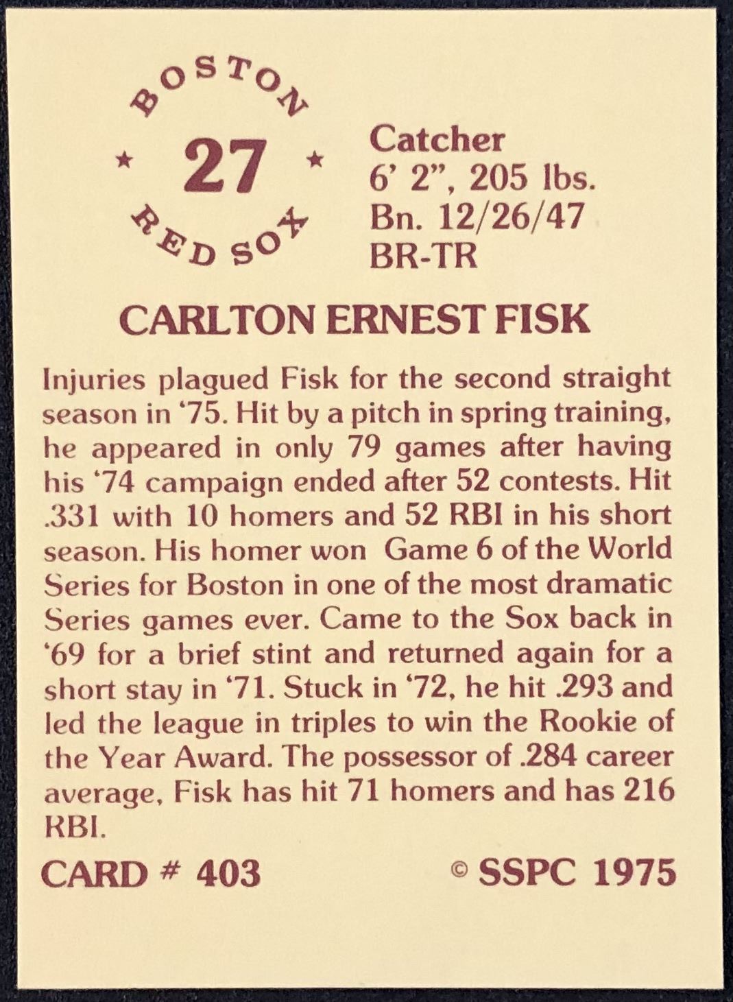 Lot 888 1975 SSPC BASEBALL CARLTON FISK (HOF)