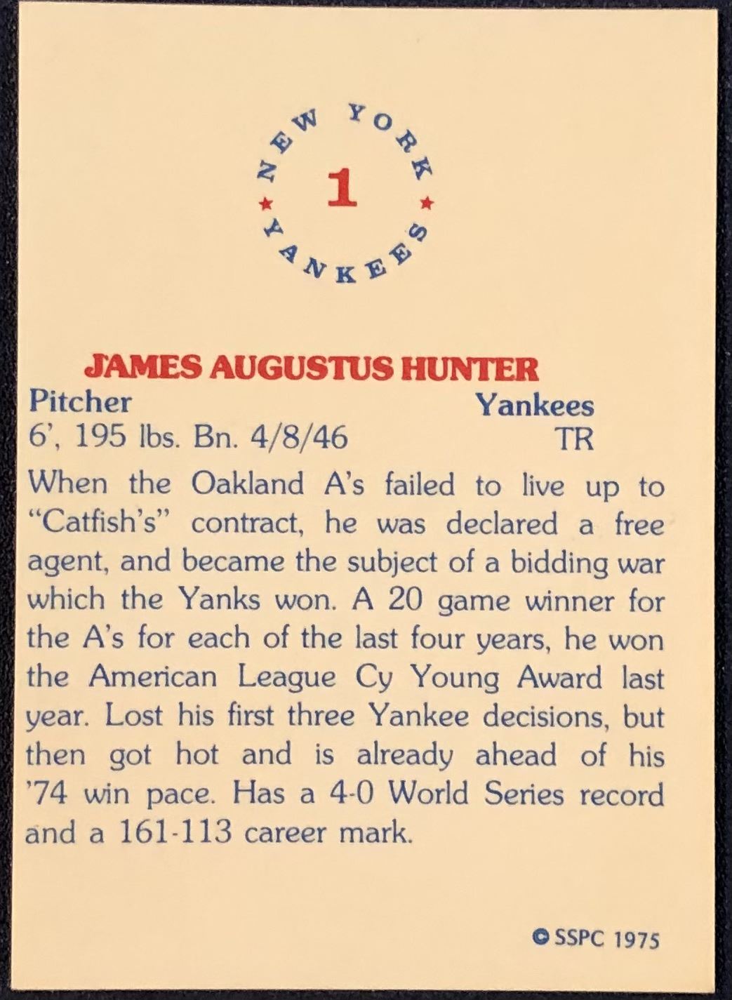 Lot 889 1975 SSPC BASEBALL CATFISH HUNTER (HOF)