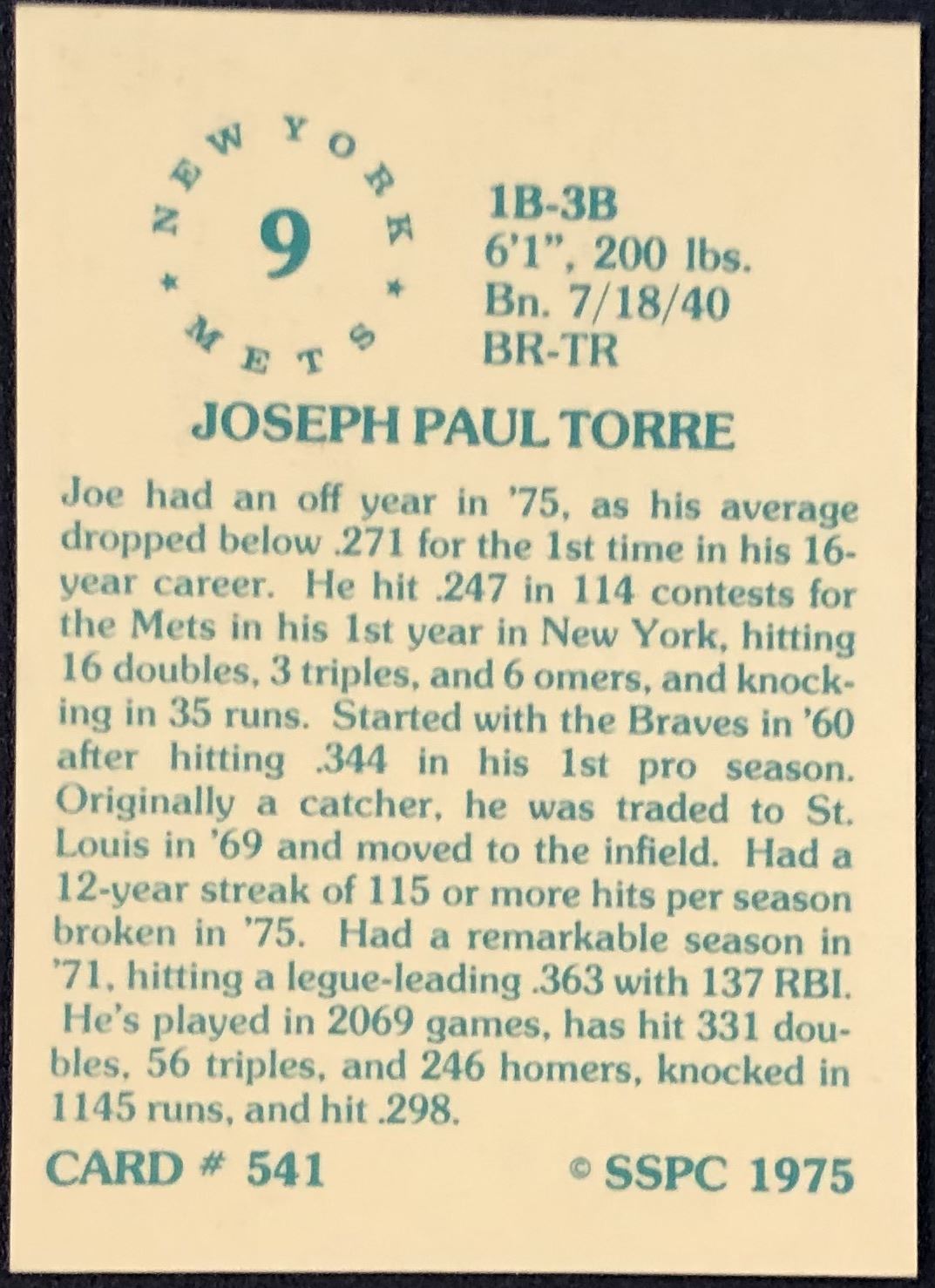 Lot 902 1975 SSPC BASEBALL JOE TORRE (HOF)