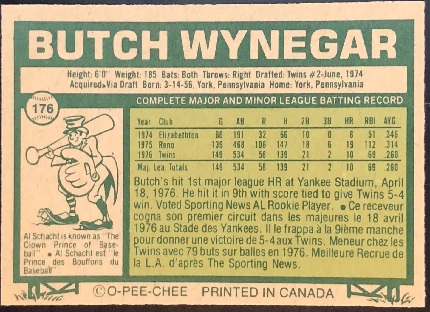 Lot 924 1977 O-PEE-CHEE BUTCH WYNEGAR ROOKIE CARD