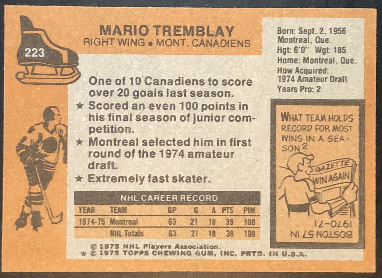 Lot 972 1975-76 NHL TOPPS MARIO TREMBLAY ROOKIE CARD