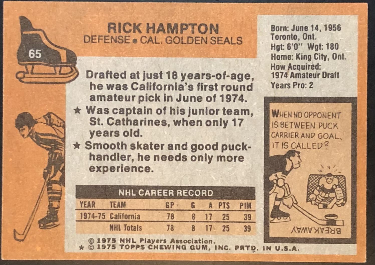 Lot 974 1975-76 NHL TOPPS RICK HAMPTON ROOKIE CARD