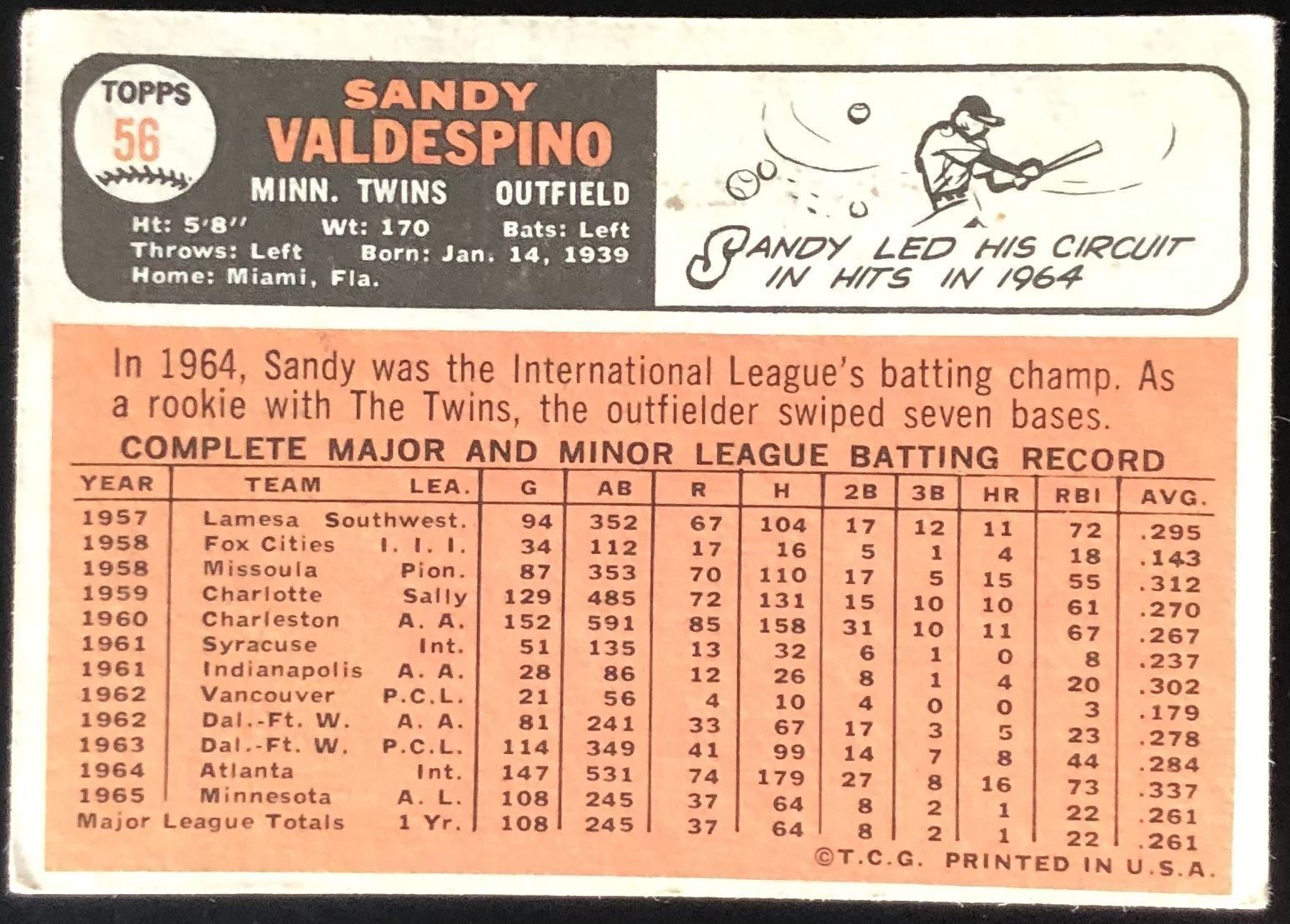 Lot 1011 1966 TOPPS SANDY VALDESPINO ROOKIE CARD