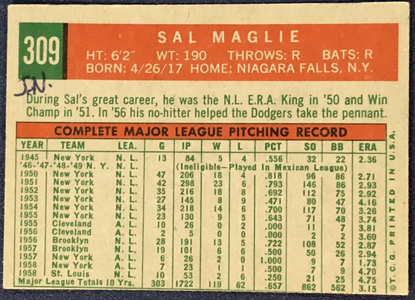 Card #309 (ink on back) MLB, baseball, vintage