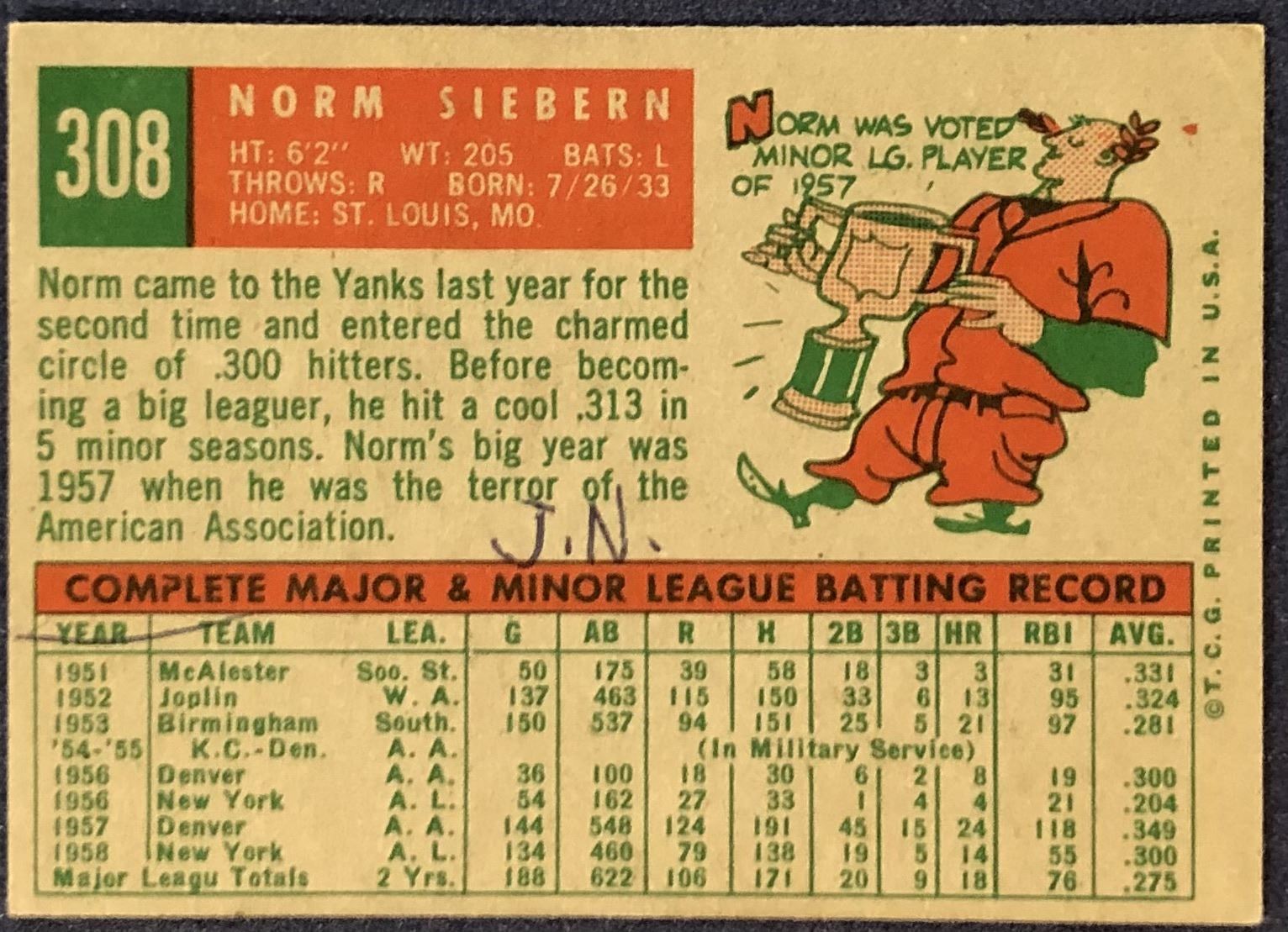 Lot 1052 1959 TOPPS GREYBACK NORM SIEBERN