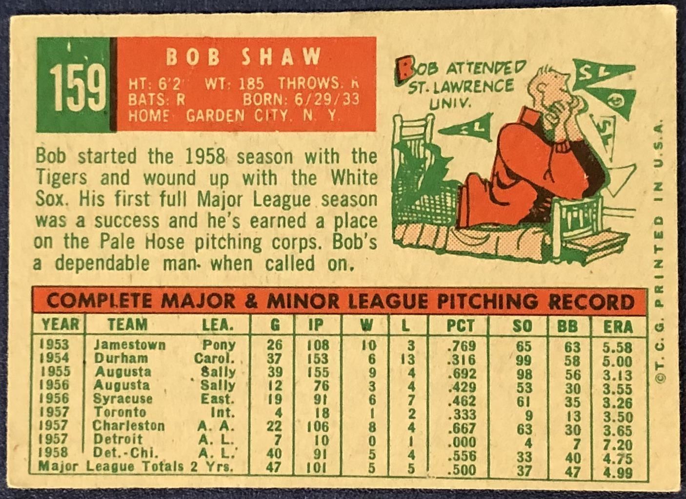 Lot 1055 1959 TOPPS GREYBACK BOB SHAW ROOKIE CARD