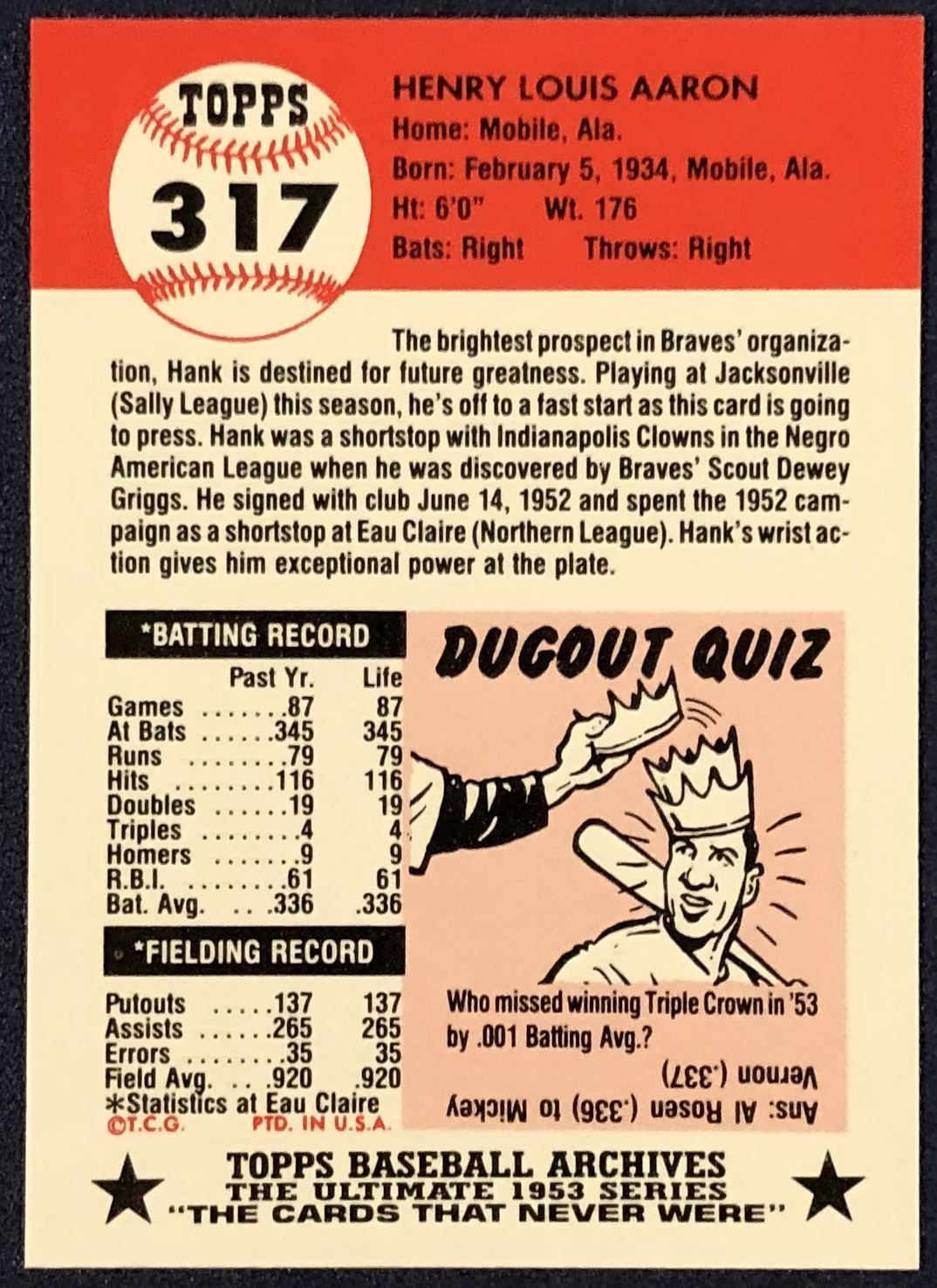 Lot 1134 1991 TOPPS ARCHIVES (1953) HANK AARON (HOF)