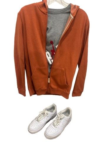 Incoming- Eddie’s (Ramon Reed) screen warned Air Jordan gray short sleeve shirt with white and red logo size 12 to 13 years kids size large, orange cat and Jack zip front hoodie size 12 to 14 child size large. Also includes his Nike white monochromatic Air Force low tops size 10. Includes a costume department wardrobe tag.