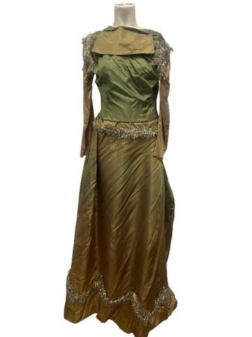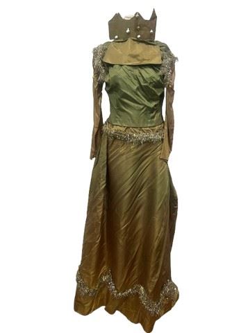 The Night Before (2015) - custom made for a background character, green Tata skirt oversized in the waist, with matching long sleeve corset style top with zipper in the back and gold sleeves. Decorated with golden silver, tinsel and golden silver ornaments, mini ornaments. Comes with a custom-made crown, matching the costume with mini silver and gold ornaments. Unfinished.