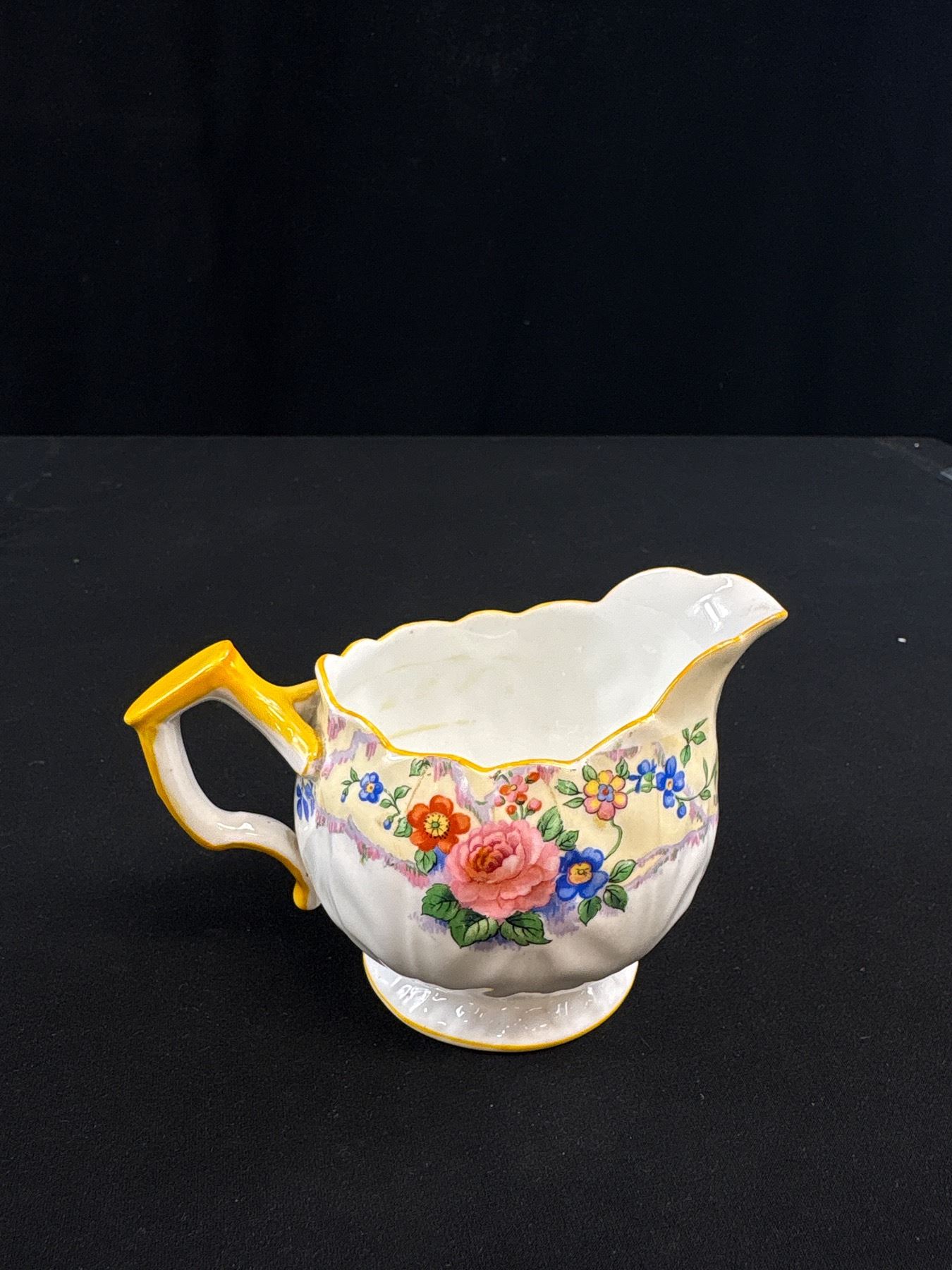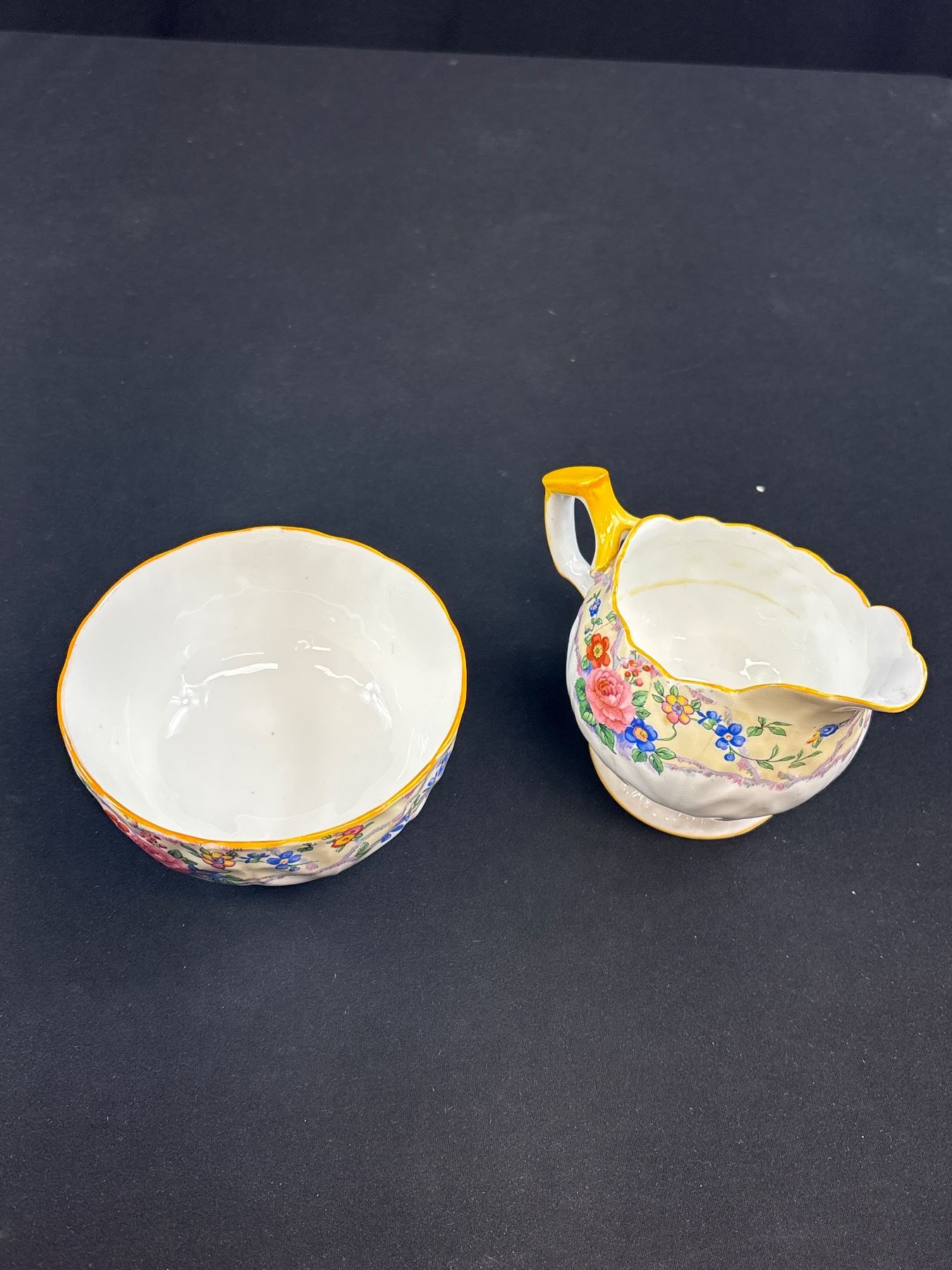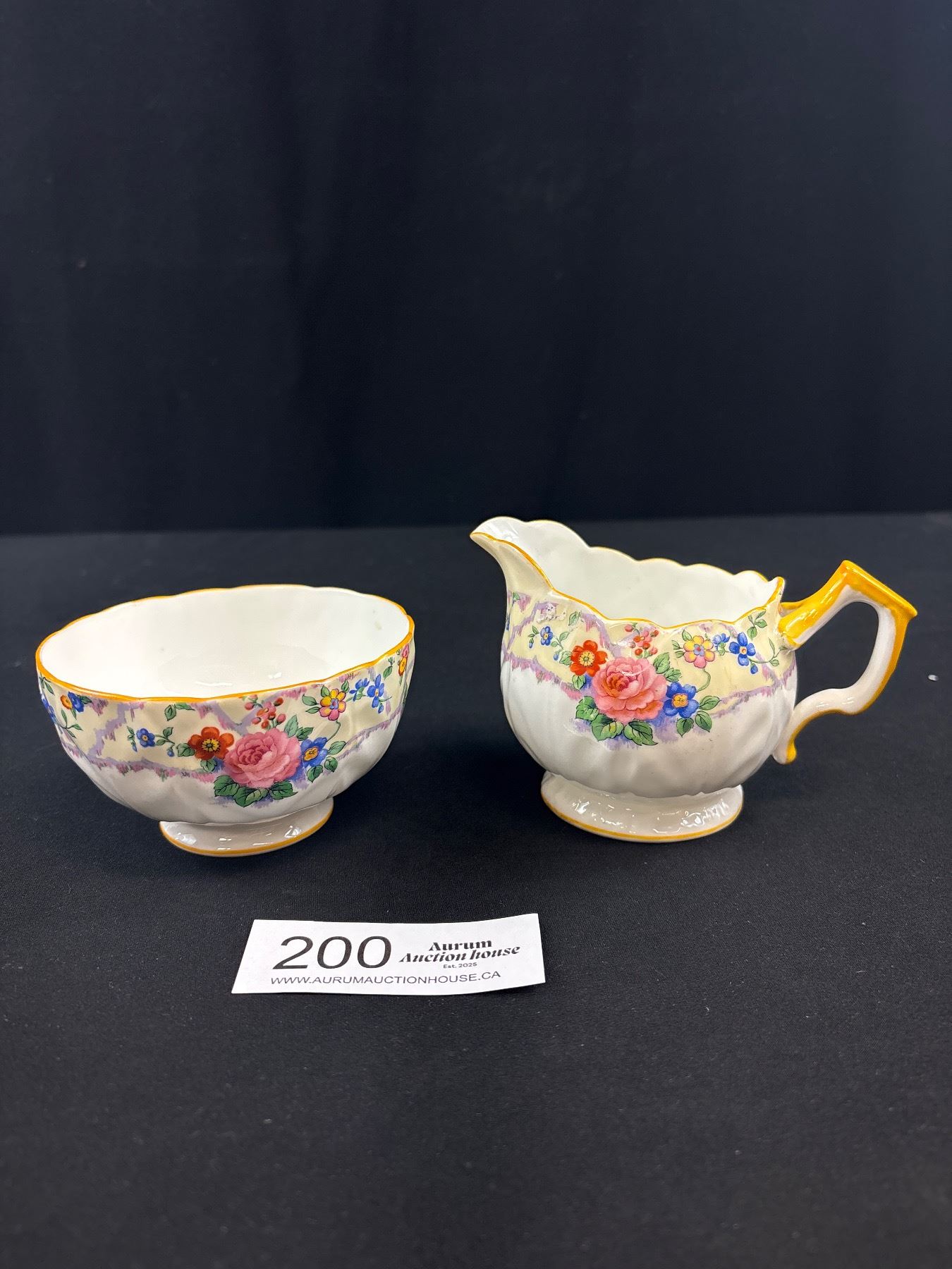 Lot 200 Very Nice Vintage Bone China Aynsley Cream and Sugar Set Yellow Band with Pink Roses and Wildflower