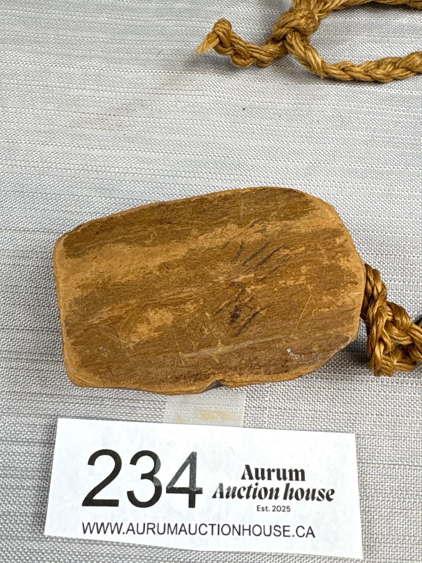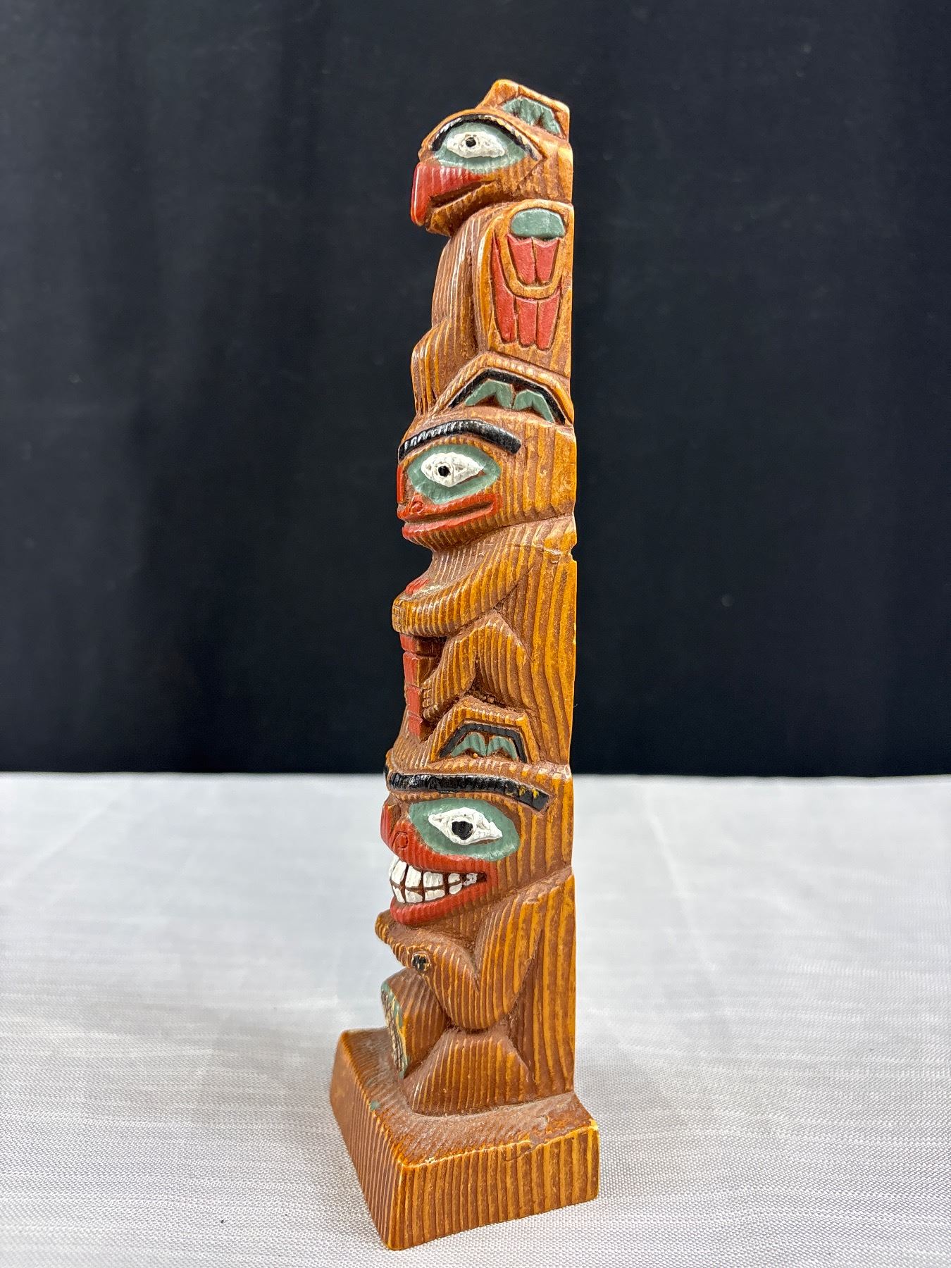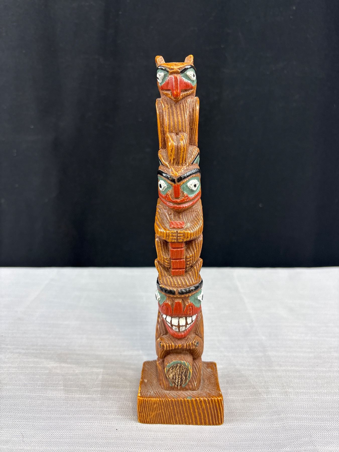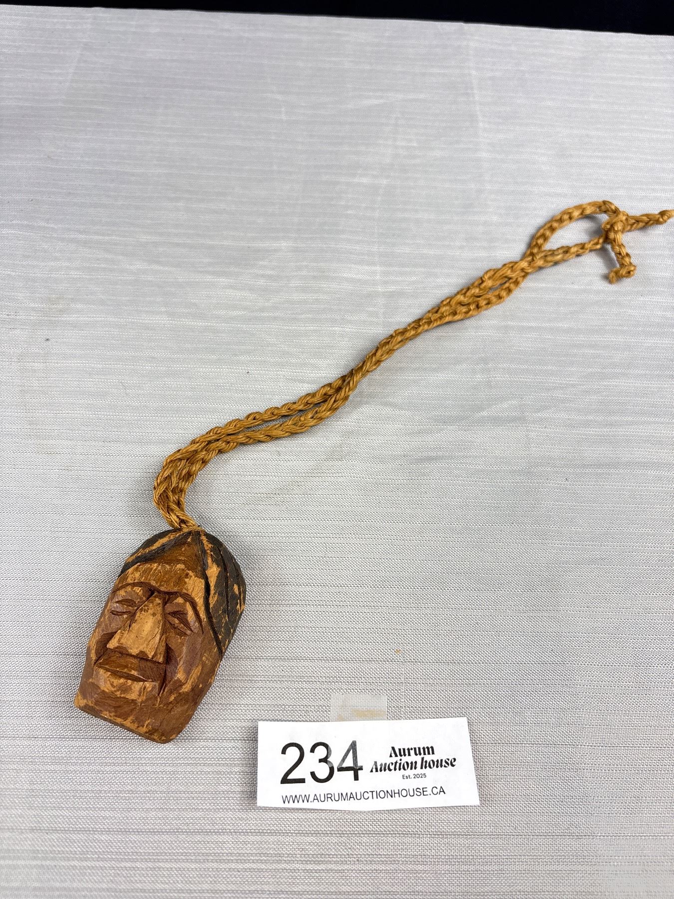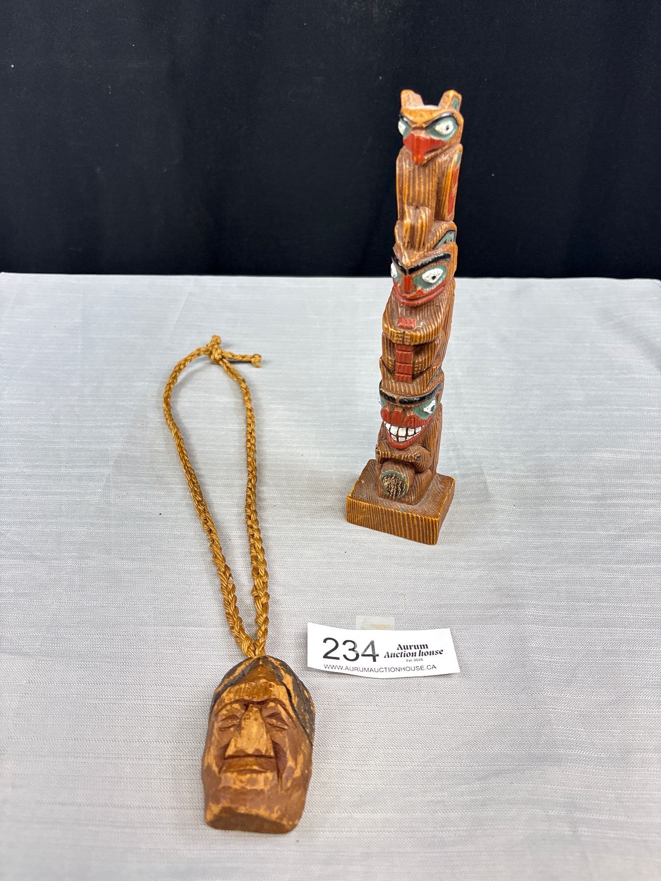 Lot 234 Vintage Native Lot Carved Head on Rope Necklace and 9" Tall Totem Pole