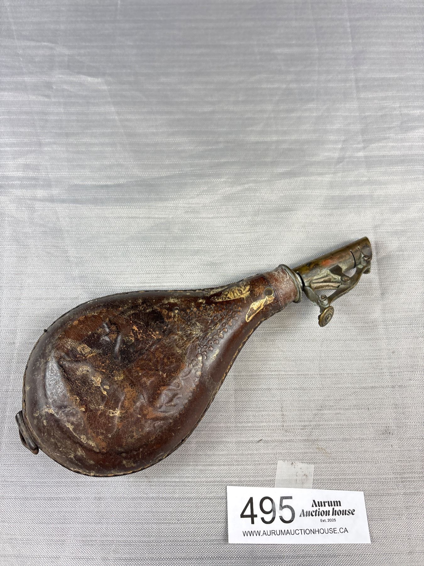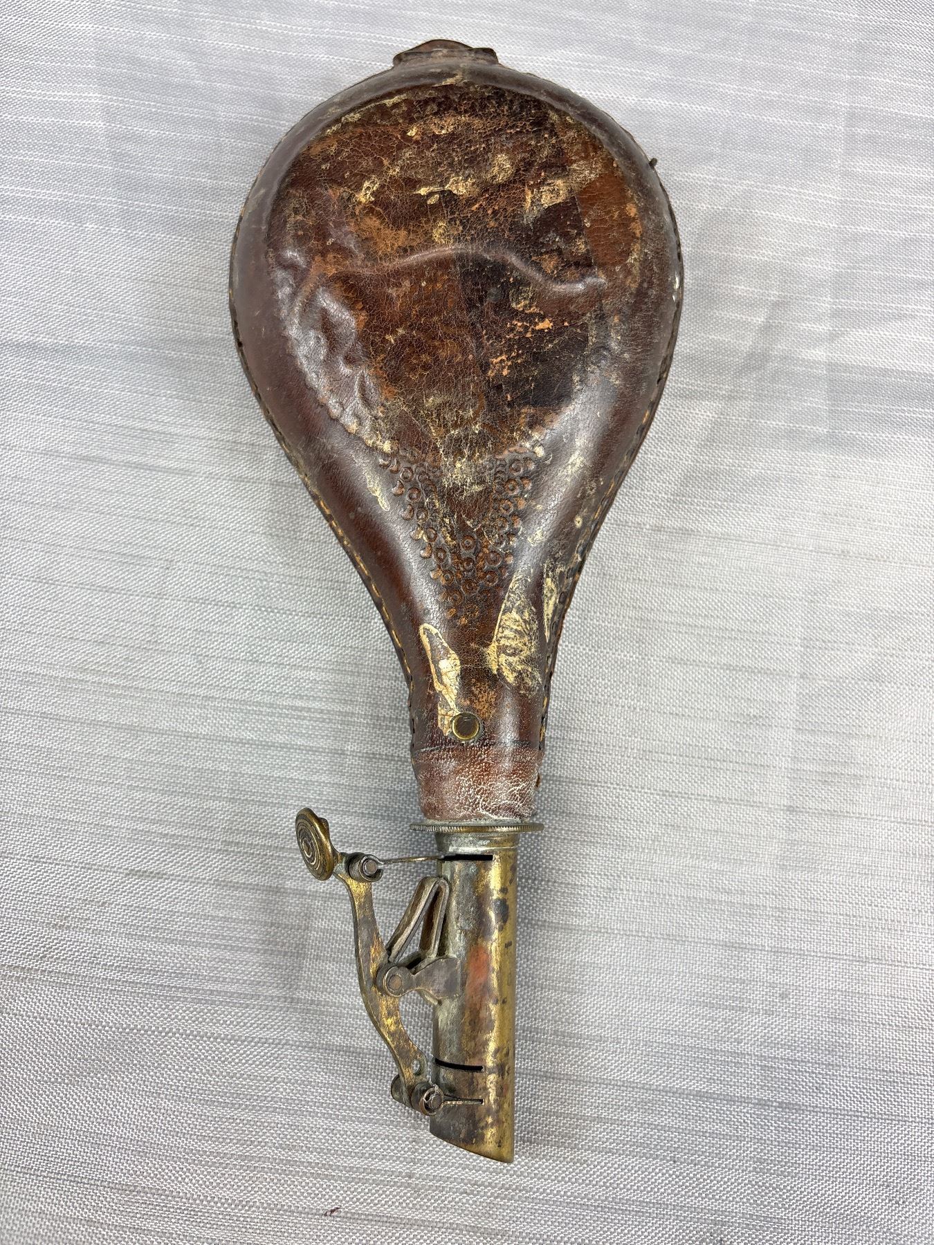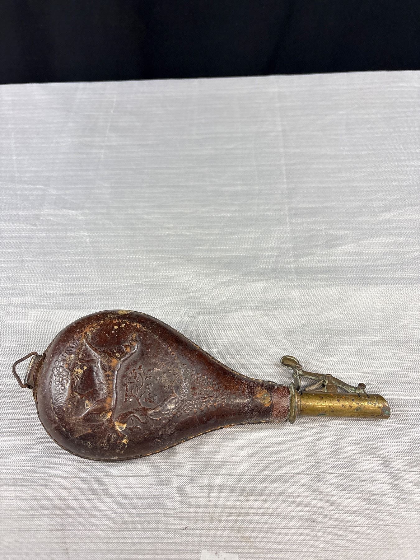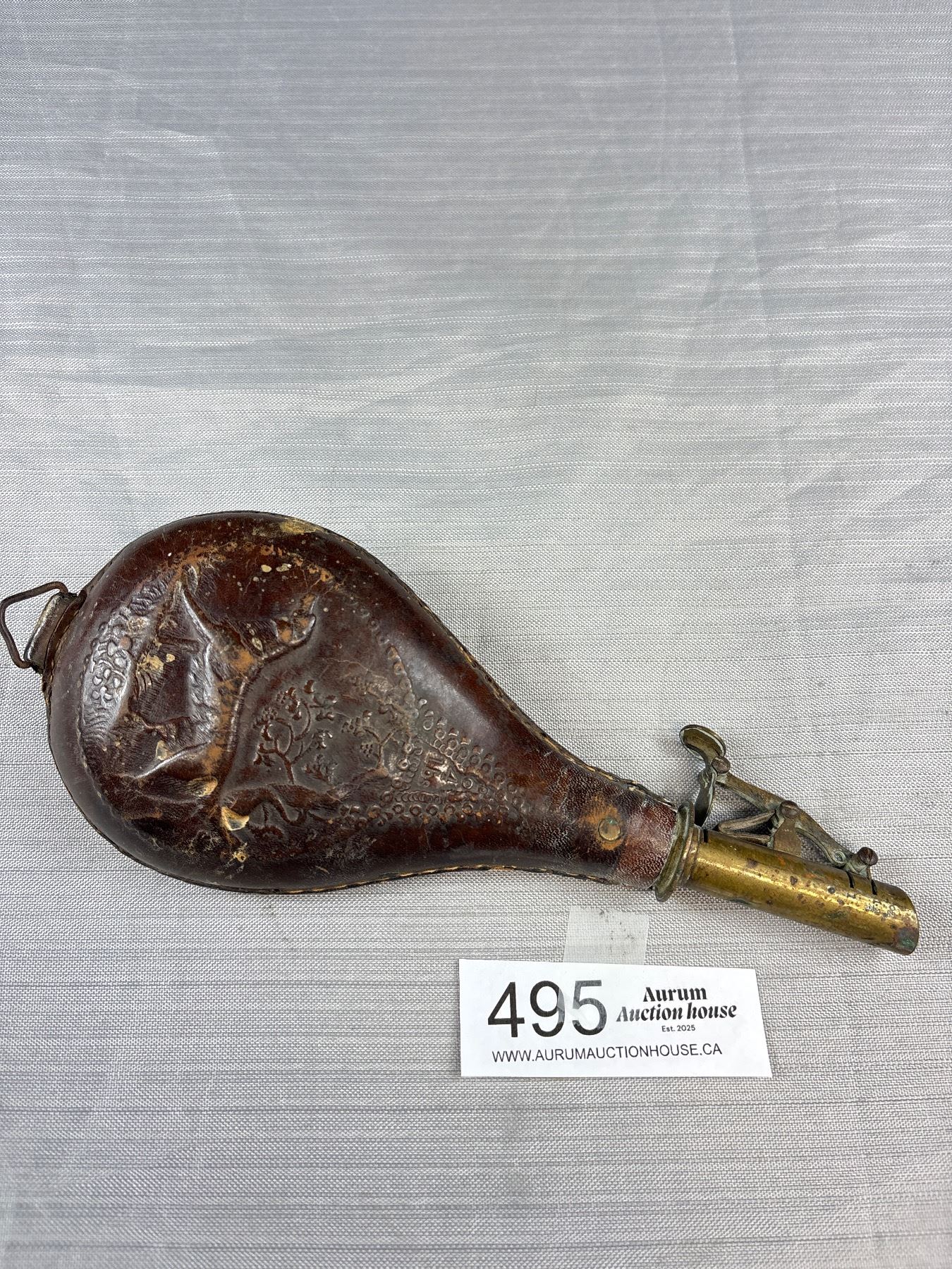 Lot 495 Antique Leather and Brass Powder Flask with Dog Embossed