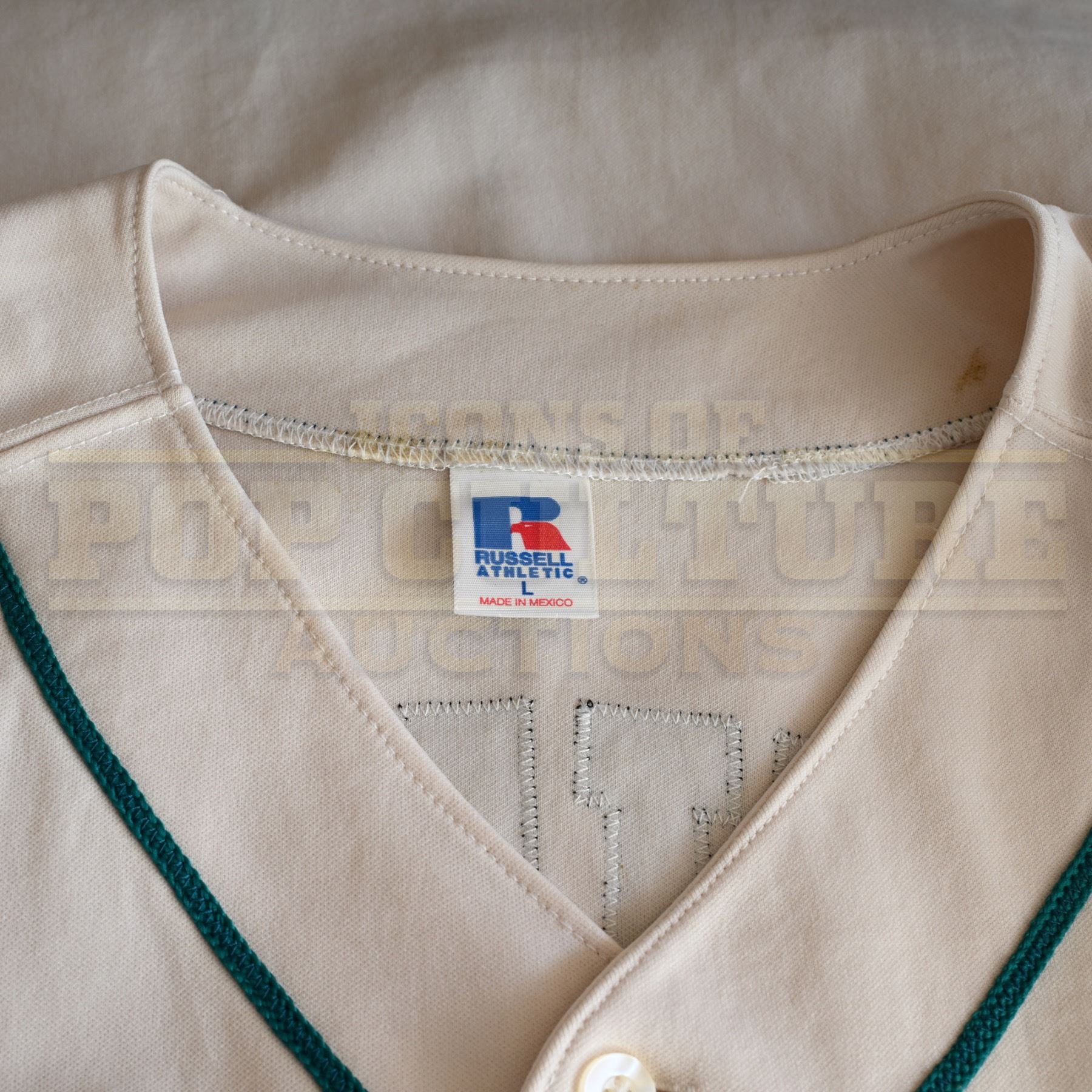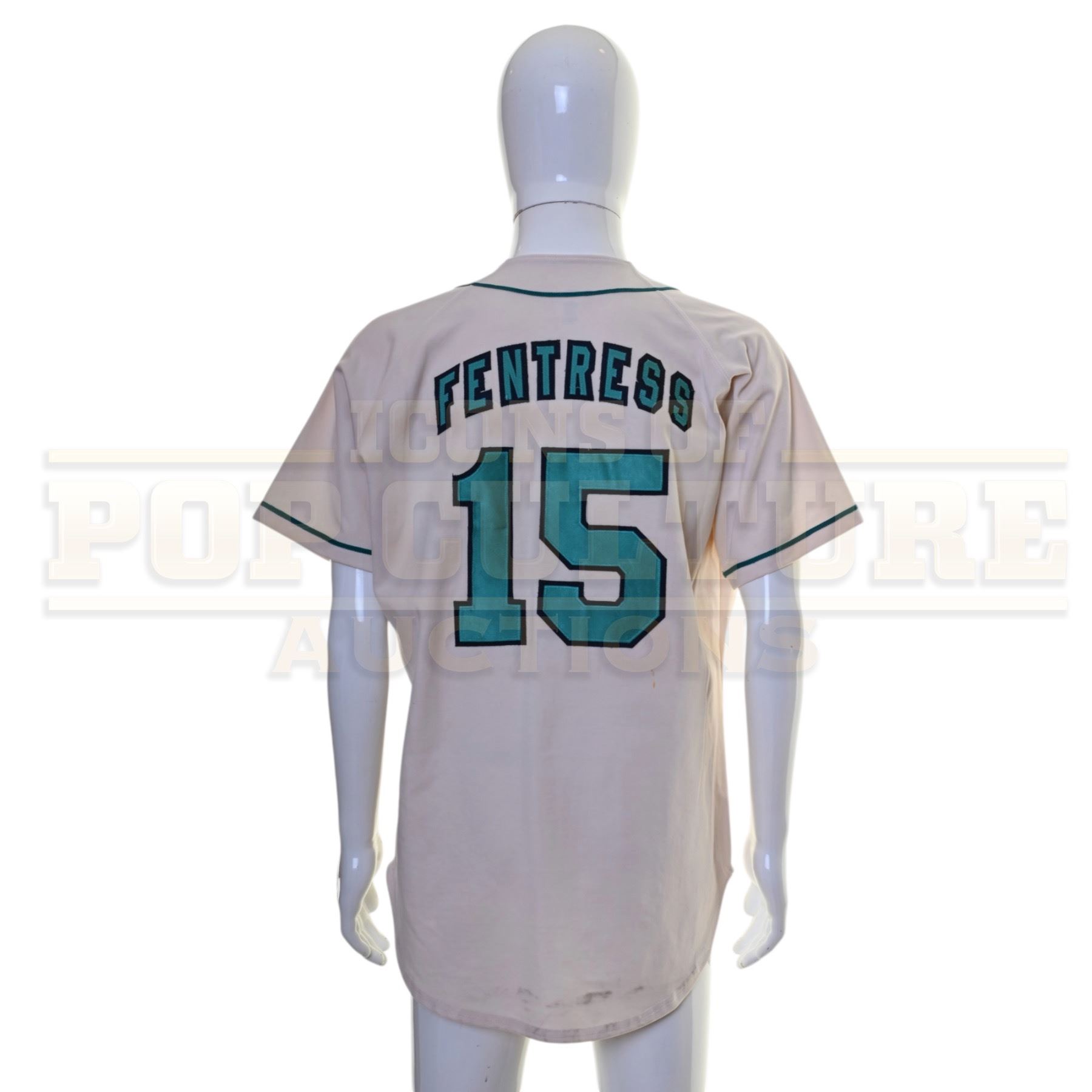 This jersey was acquired by the production for use by various actors as members of the “Robbins” baseball team in the episode titled “Butterfingers”. The button front jersey features the “Robbins” team logo on the chest and “Fentress” and the number “15” on the back.