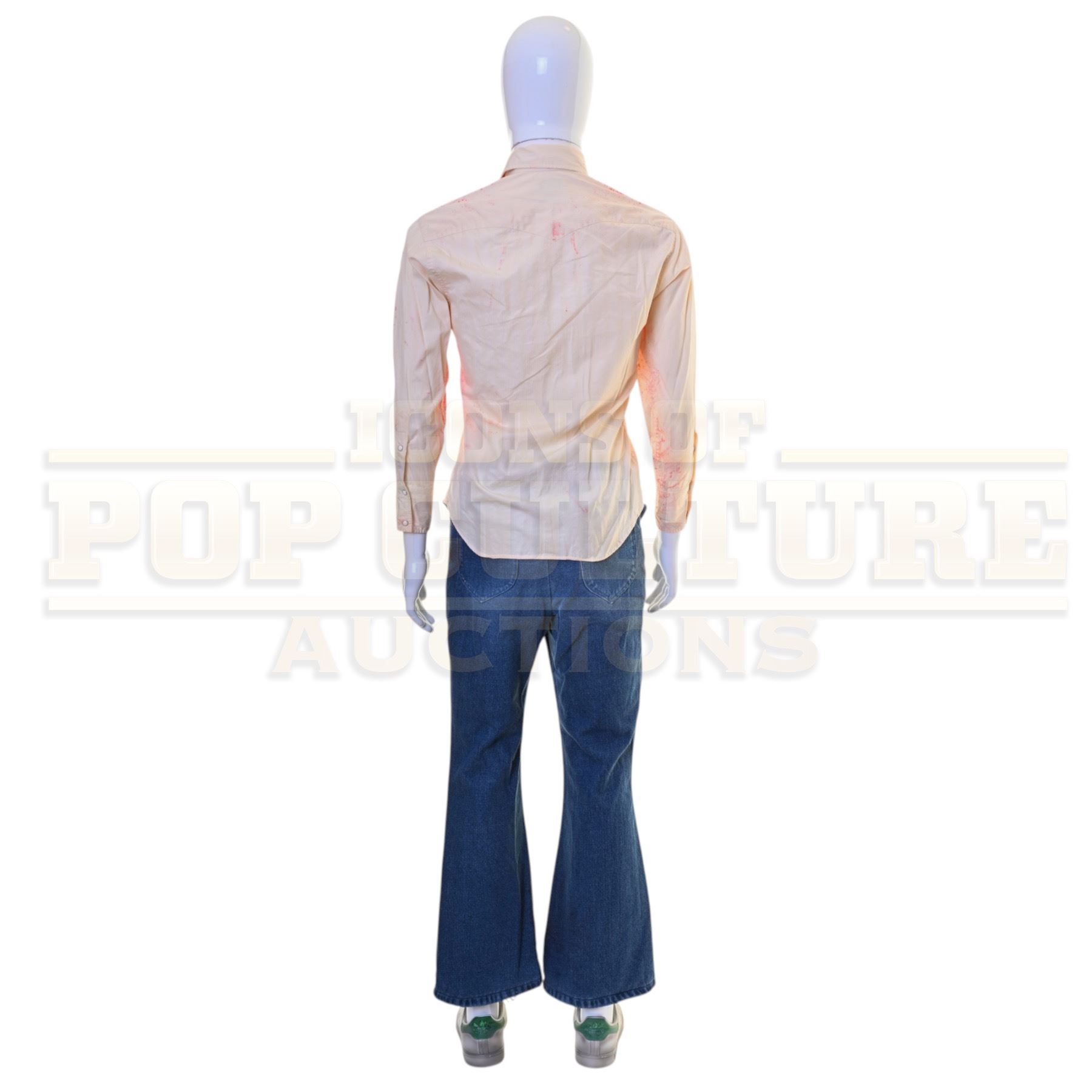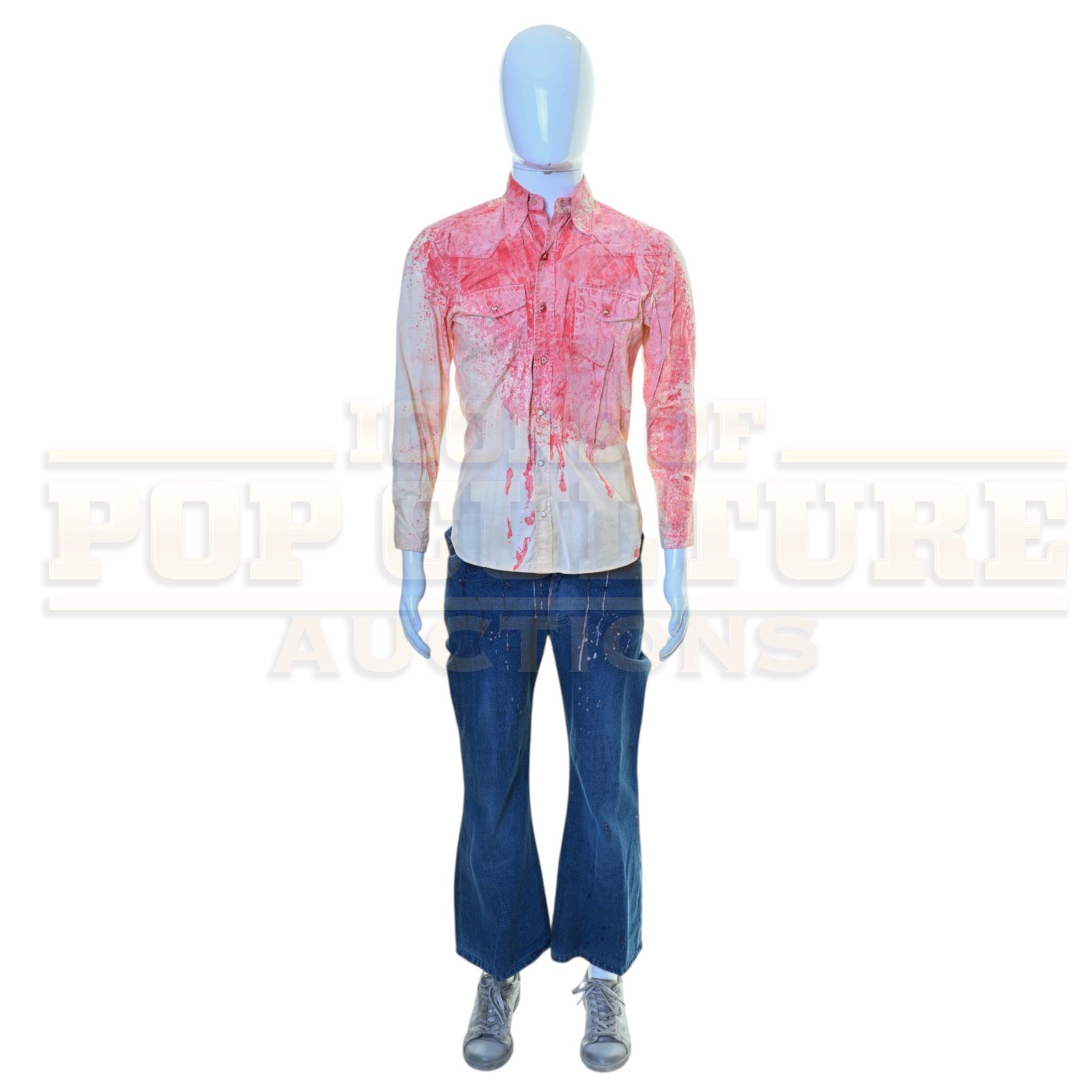 This is an original costume acquired by the production of the film "Saturday Night". This costume is not a replica; it is an actual piece acquired by the production for use by Gabriel LaBelle as “Lorne Michaels”. The costume is distressed with studio blood staining and consists of a long sleeve snap front shirt, a pair of denim jeans and a pair of sneakers.