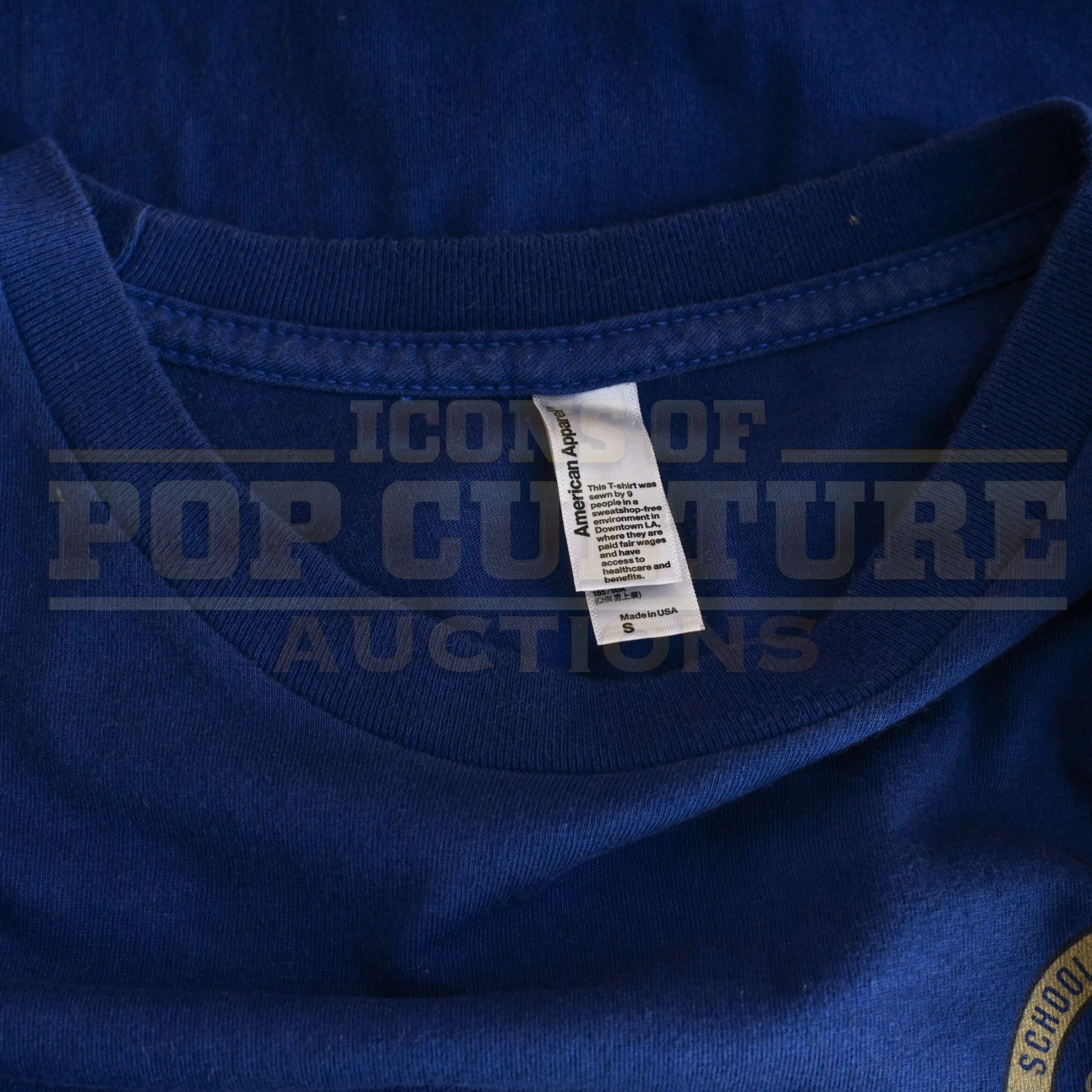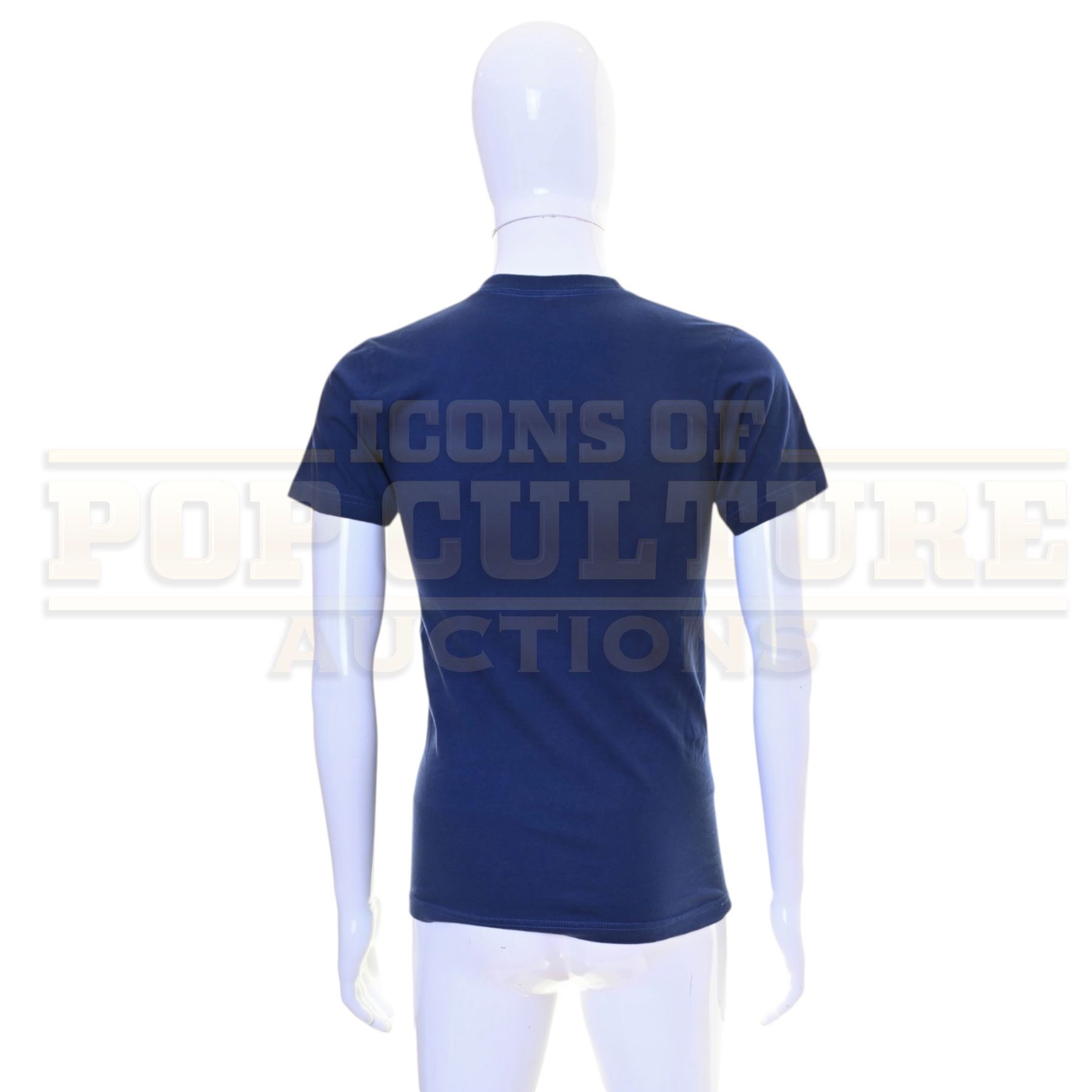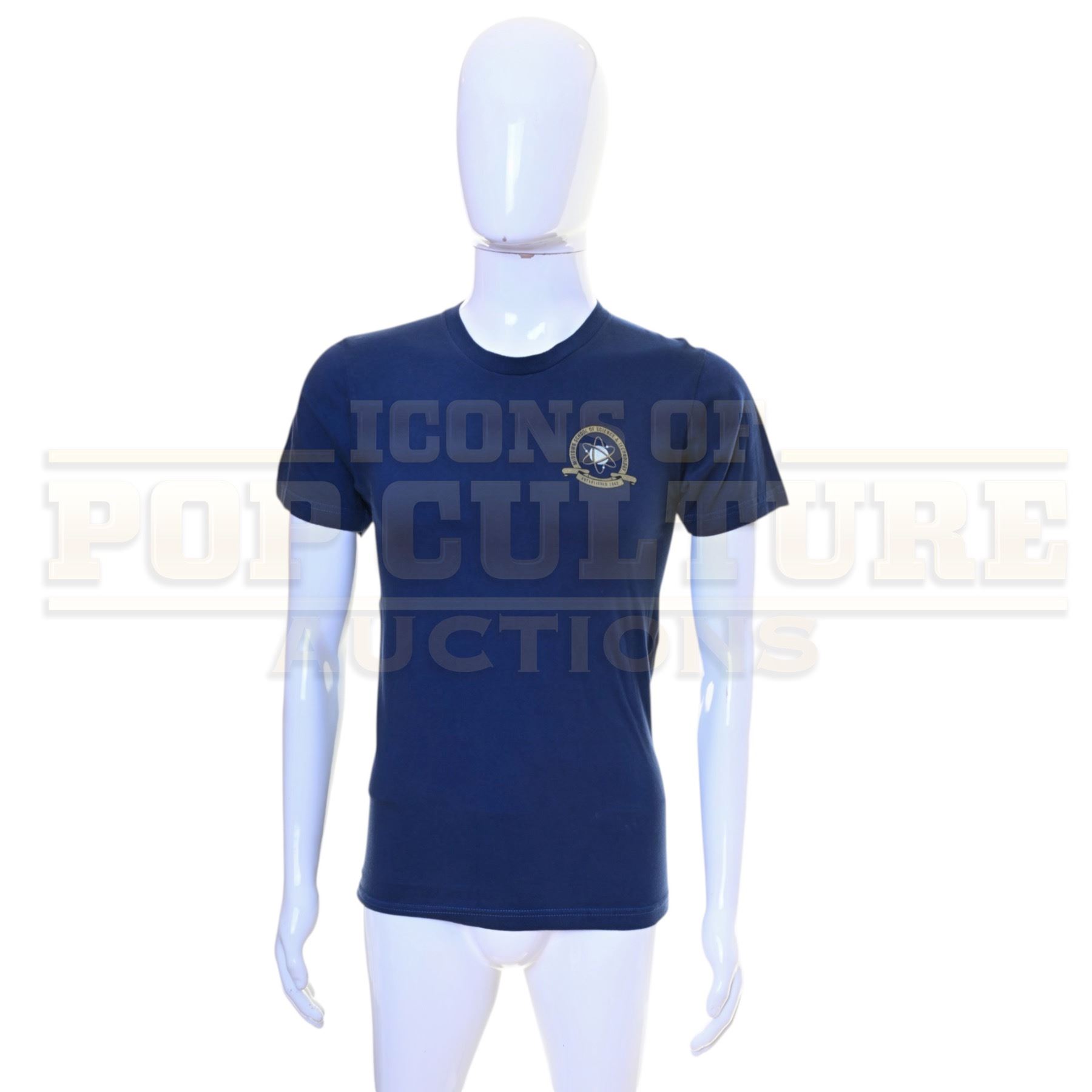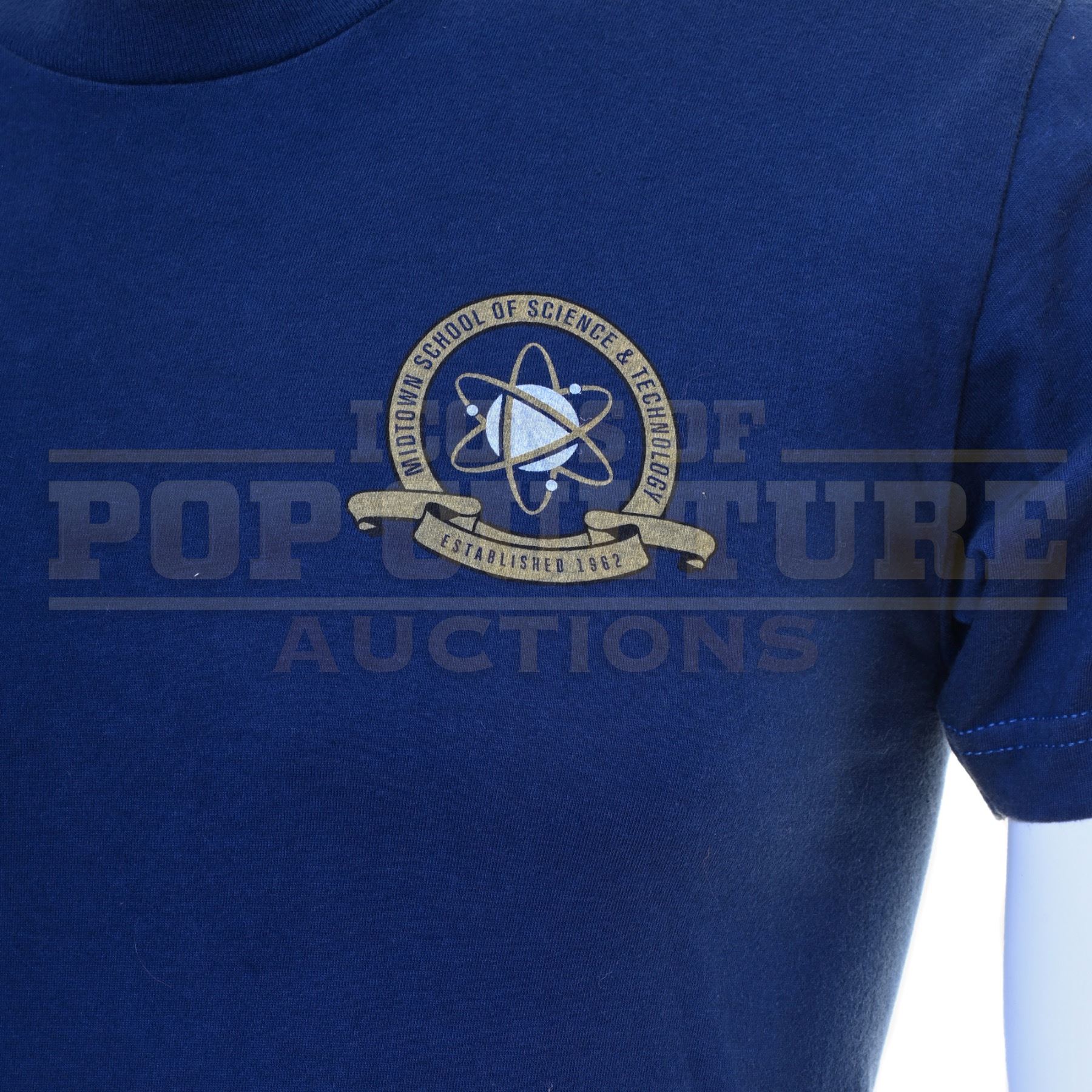 Original shirt acquired and custom-modified for use by various actors during the production of Marvel Studios’ Spider-Man: Homecoming (2017). This blue t-shirt features a left chest graphic reading “Midtown School of Science & Technology,” the fictional high school attended by Peter Parker in the film.