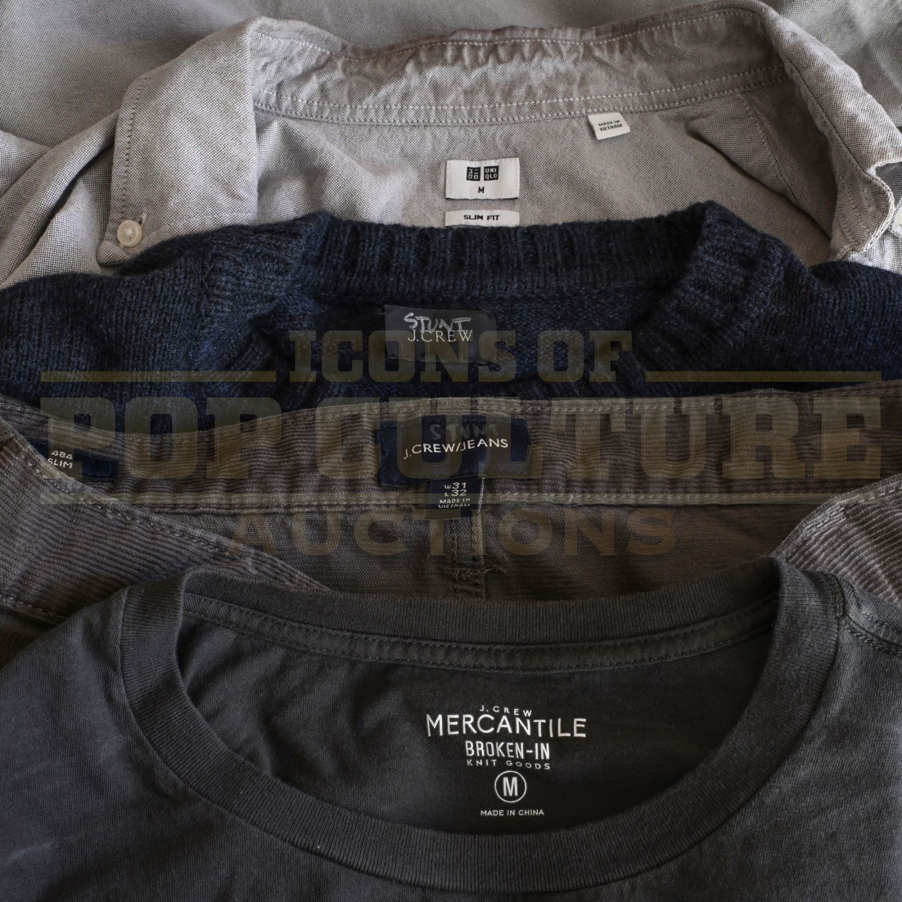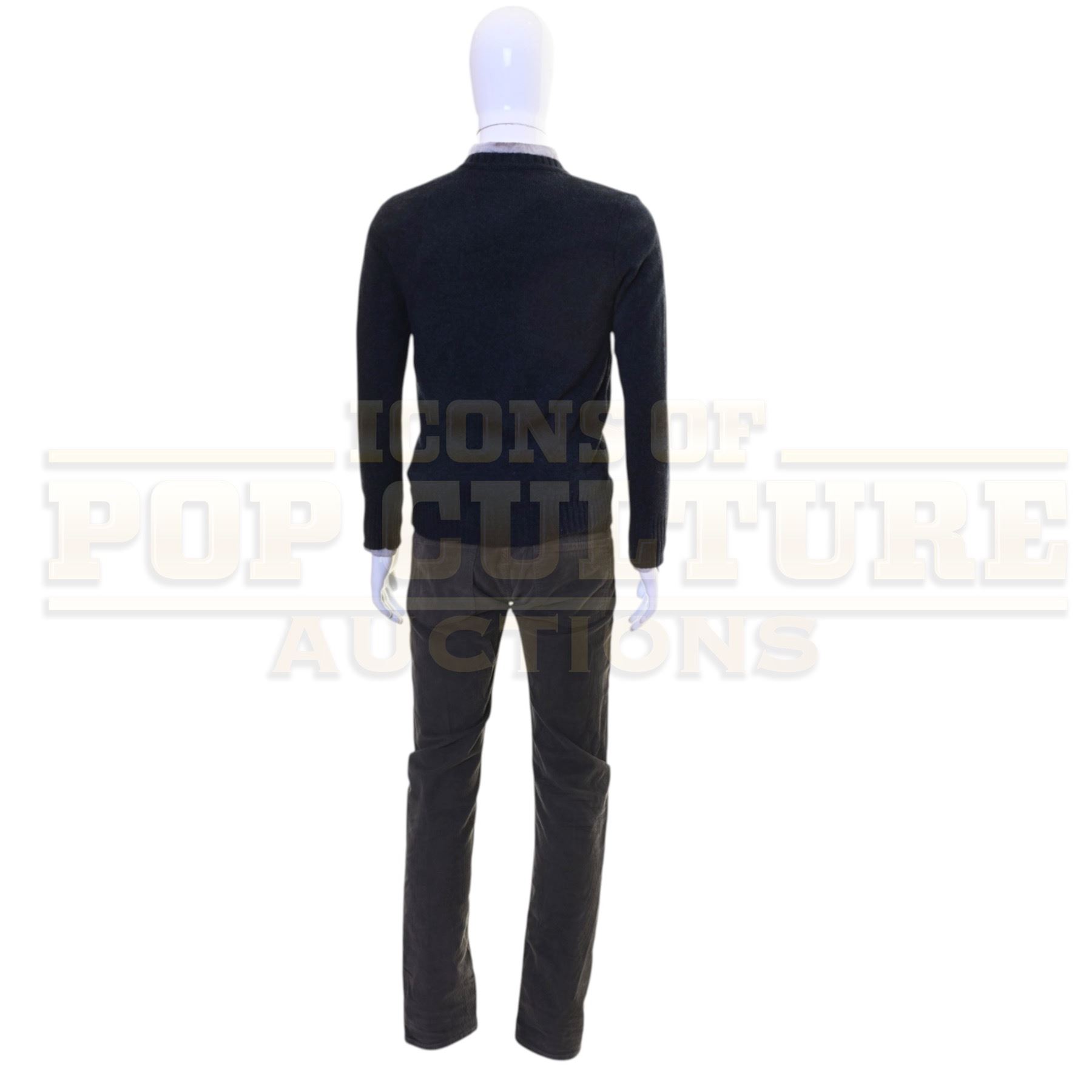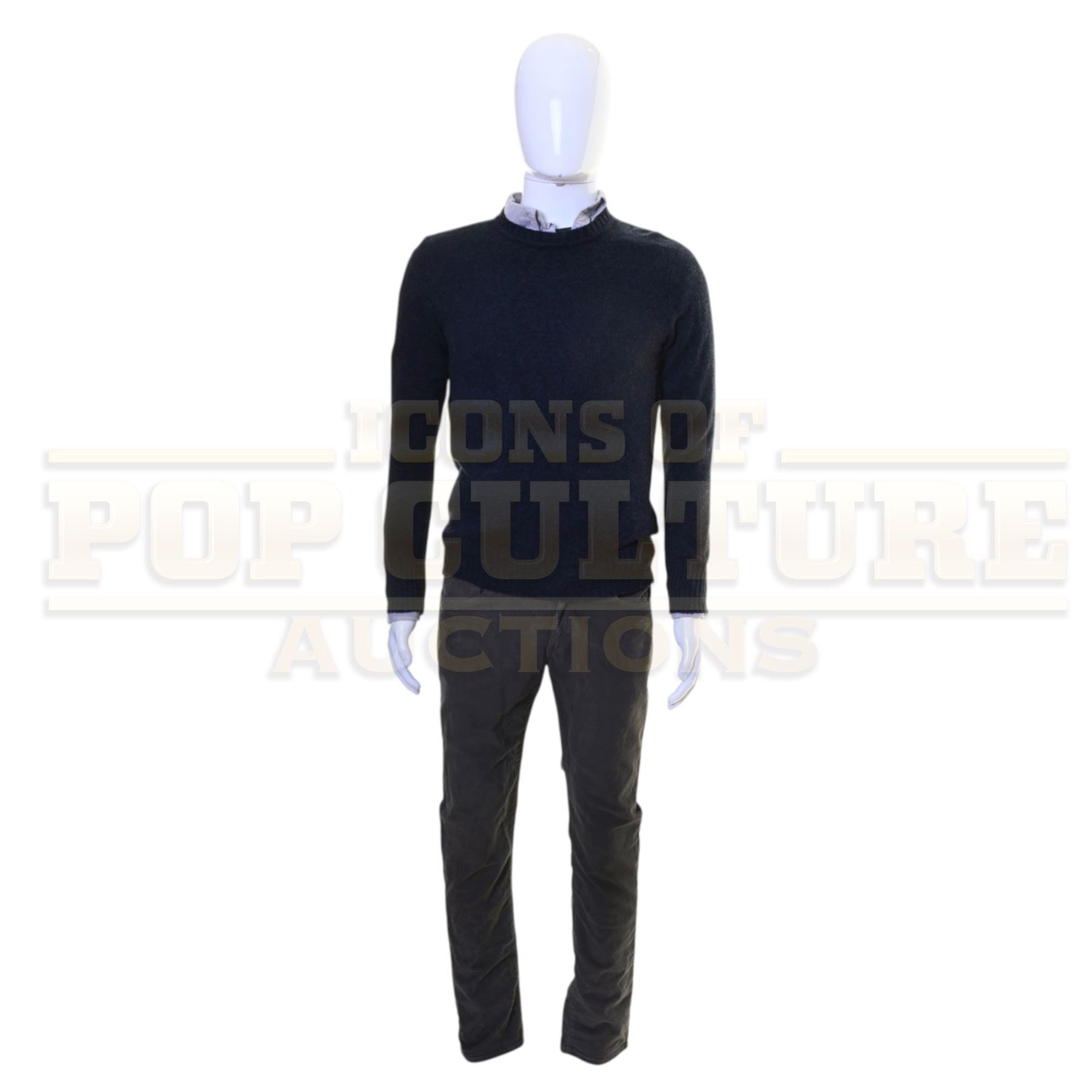 This is an original costume acquired by the production of the film "Zombieland: Double Tap". This costume is not a replica; it is an actual piece acquired by the production for use by Jesse Eisenberg and/or his stunt double as “Columbus”. The costume consists of a long sleeve button front shirt, a blue sweater, a t-shirt and a pair of pants.