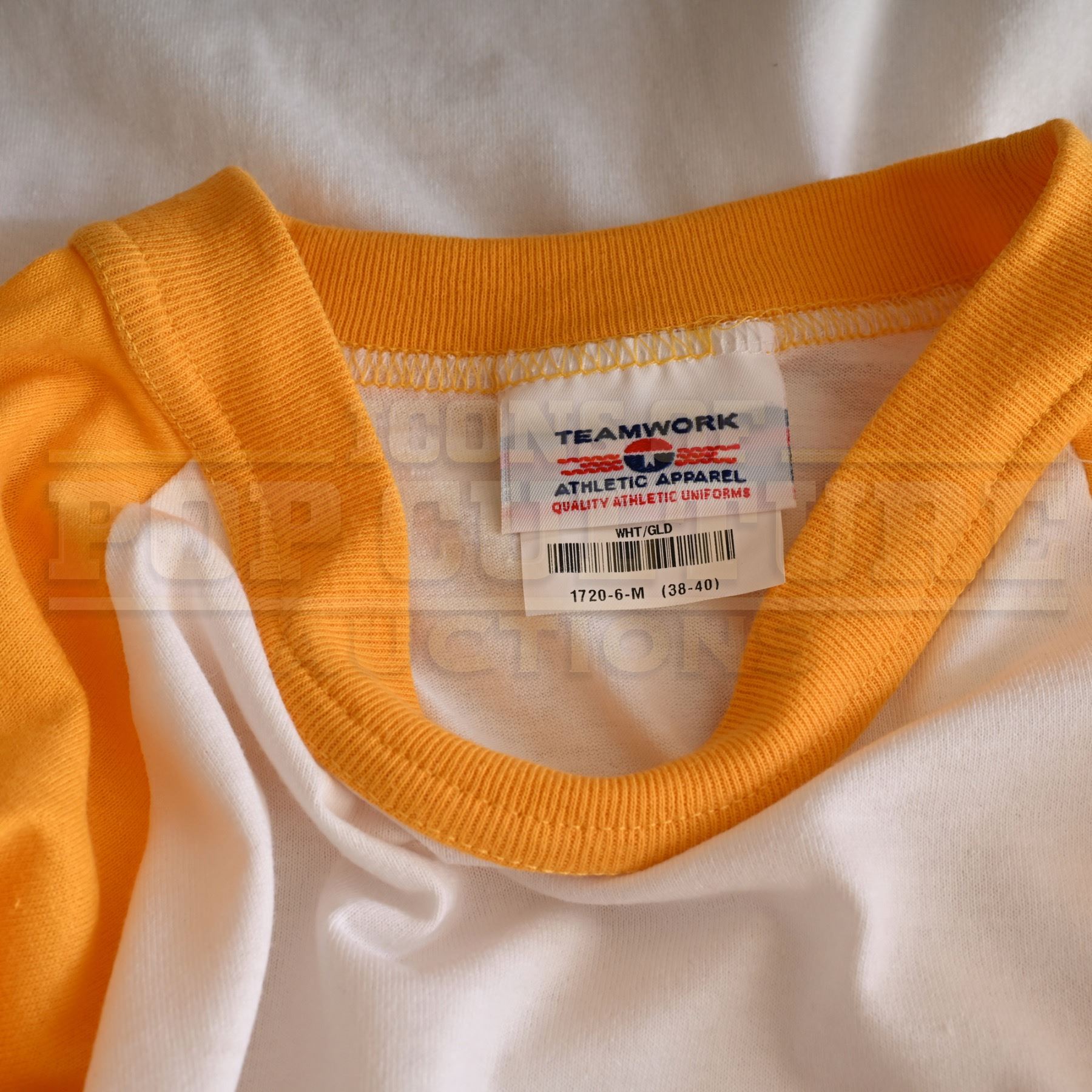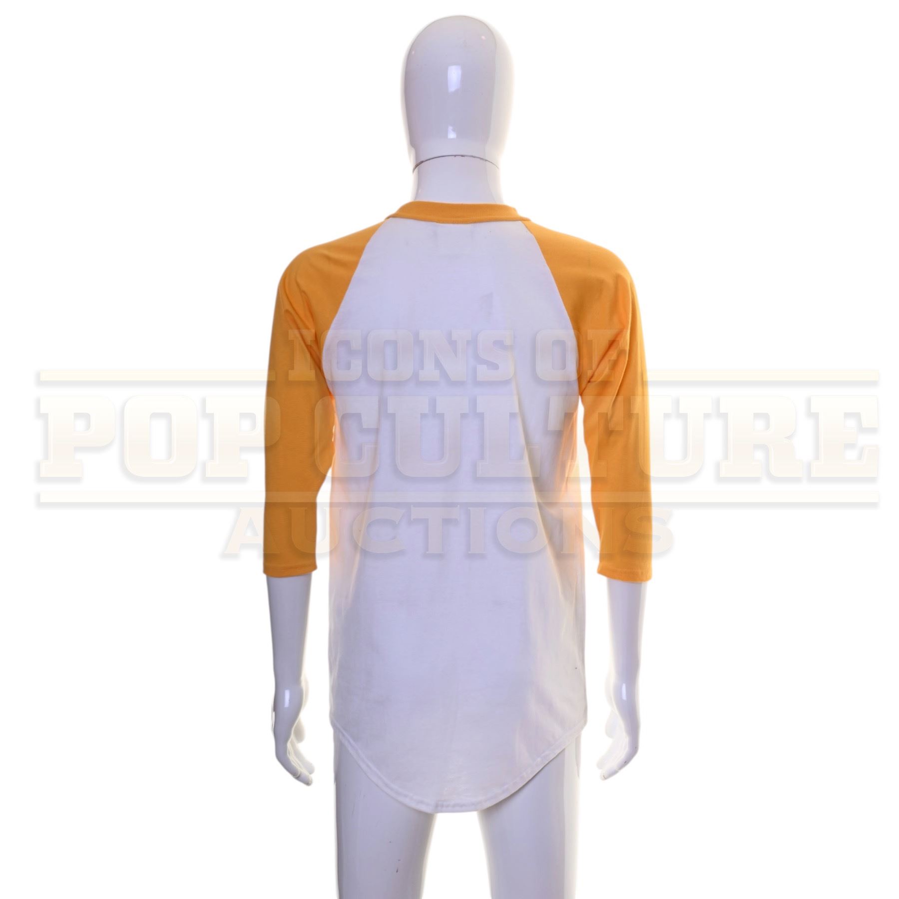 This shirt was acquired by the production for use by Jay Baruchel as “Jay Baruchel”. The short sleeve yellow and white t-shirt features the silver graphic “Zombie vs. Shark” on the chest. This version of the shirt was intended to be used during filming of the scenes in heaven. These scenes were deleted from the film, but are featured in the film’s deleted scenes.