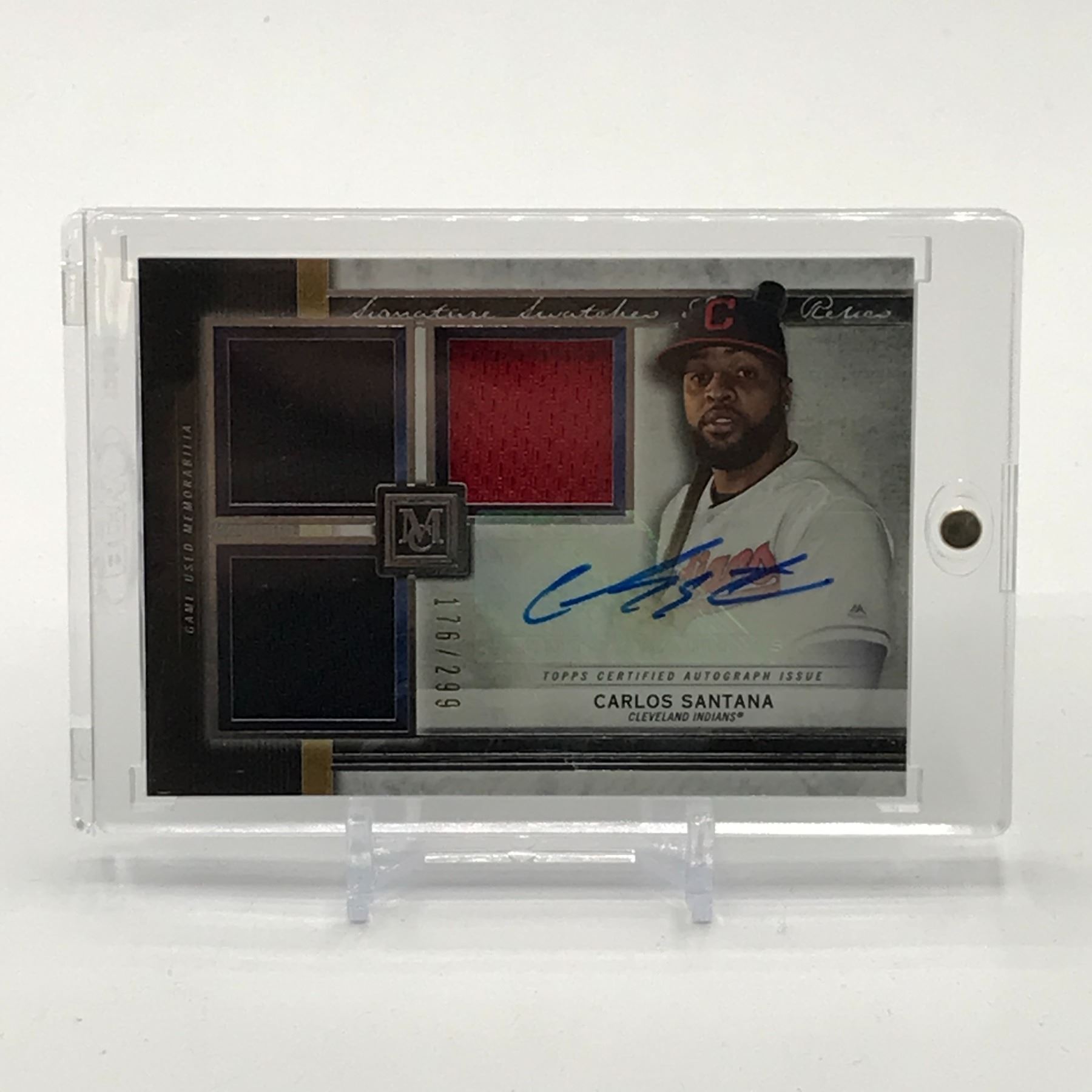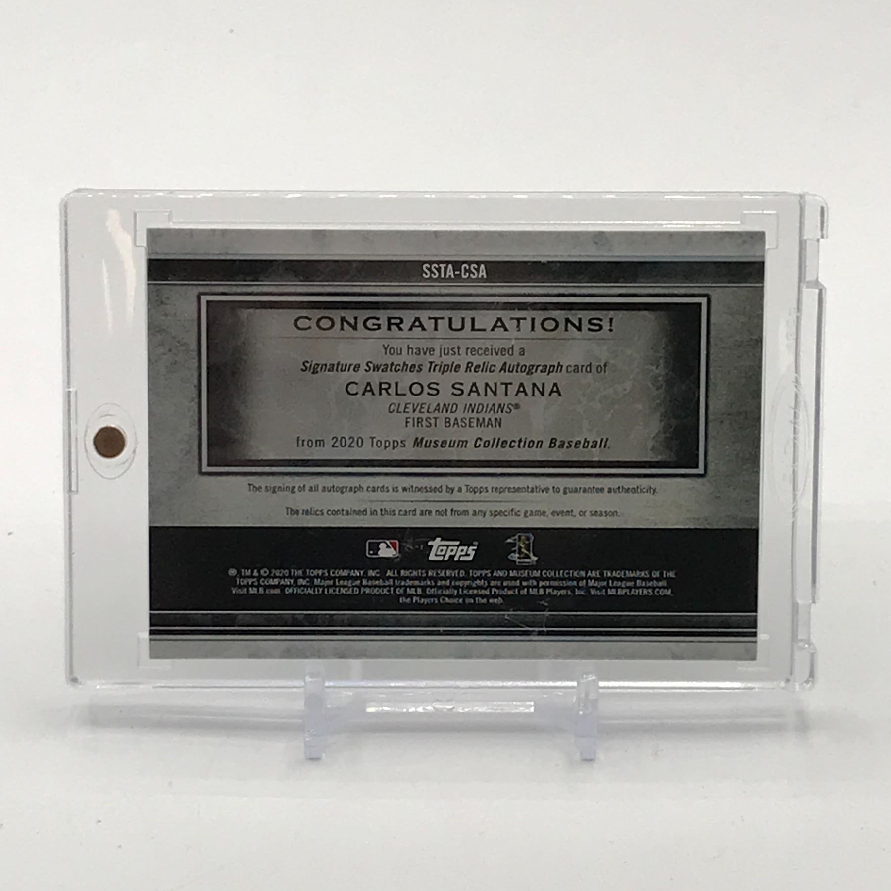Lot 176 2020 TOPPS MUSEUM COLLECTION BASEBALL CARLOS SANTANA SIGNED TRIPLE PATCH TRASING CARD 176/299