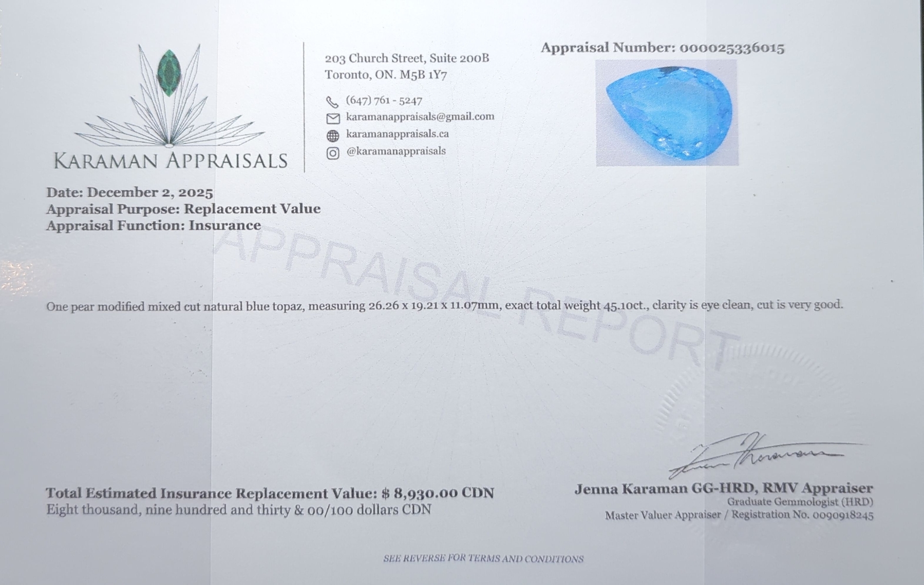 45.1 ct Certified Royal Blue Topaz gemstone Estimated Value ($8,930 Appraisal)