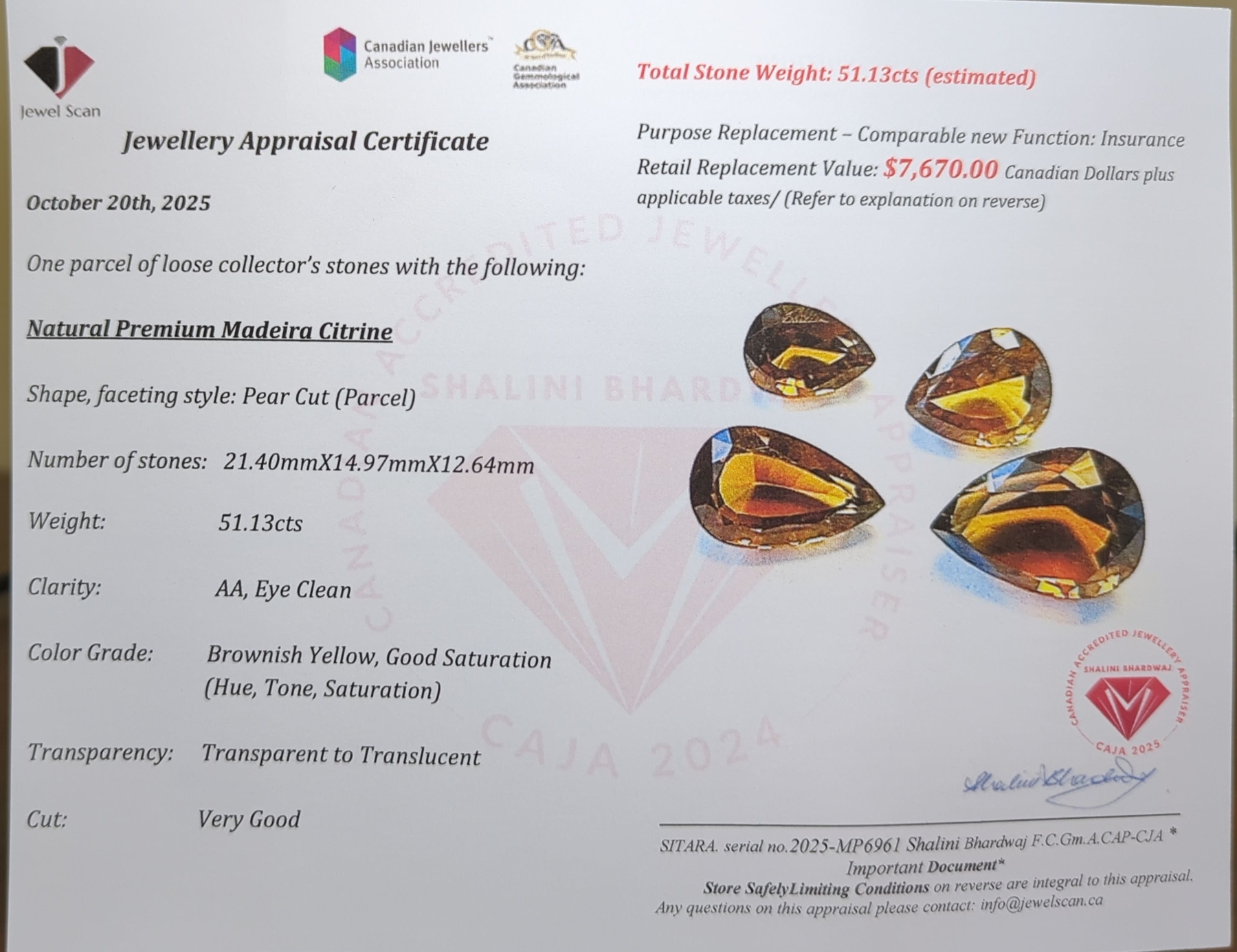 Lot 8 Madeira Citrine gemstone Parcel 51.13 ct Certified Value ($7,670 Appraisal)