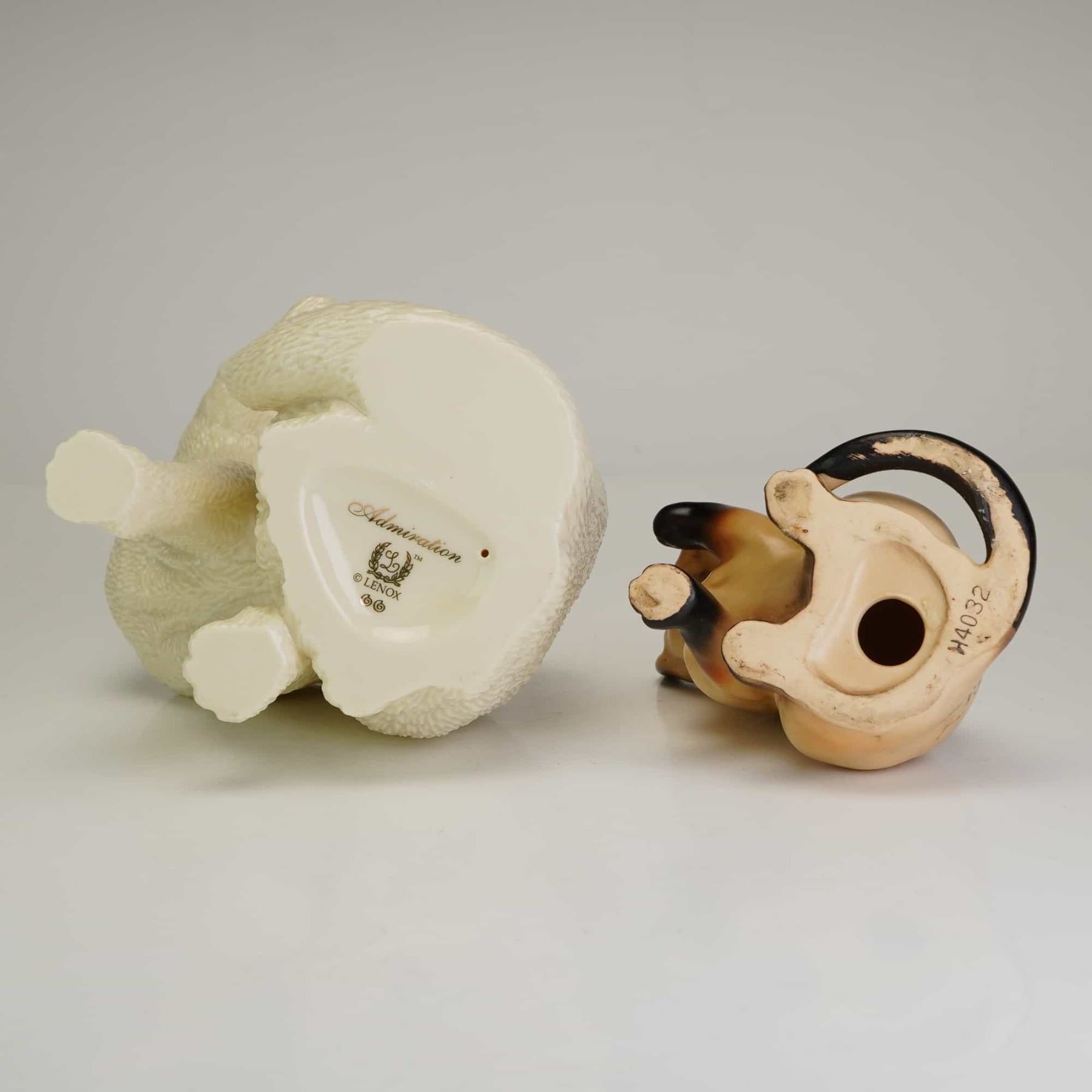 The Lenox figurine is crafted from matte-finish bisque porcelain, depicting a seated cat with finely detailed textured fur, blue eyes, and a pink nose. The base is marked with the gold Lenox hallmark, the collection name Admiration in script, and two green hand-painted decorator marks. The Siamese figurine is a Lefton model H4032, composed of glazed ceramic in a seated pose with its right front paw raised.