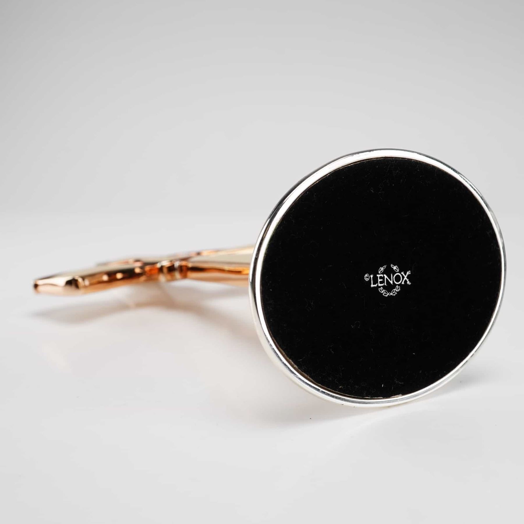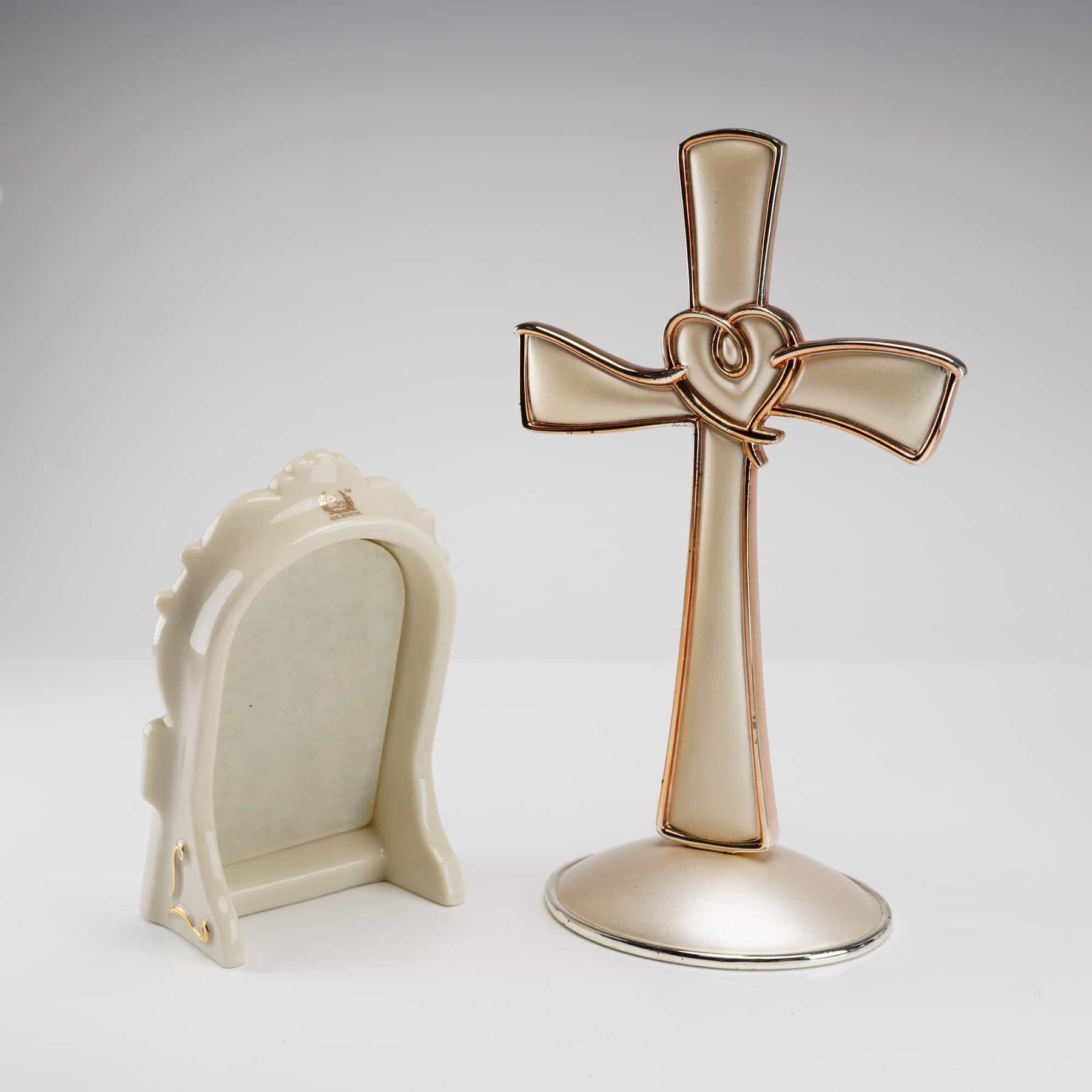 This contemporary two-piece dresser top grouping from Lenox features a standing cross and a decorative mirror. The cross, identified as part of the Forevermore collection representing faith, hope, and love, is constructed from fine ivory porcelain accented with a rose gold-toned metal satin finish wirework trim and an entwined heart motif at the center. It stands upon a domed pedestal base with a silver-toned metal rim and is marked LENOX on the black felt underside. The accompanying arched mirror is crafted from fine ivory porcelain with hand-applied gold gilt scrollwork and a stylized shell crest. The reverse bears the gold Lenox laurel wreath trademark.