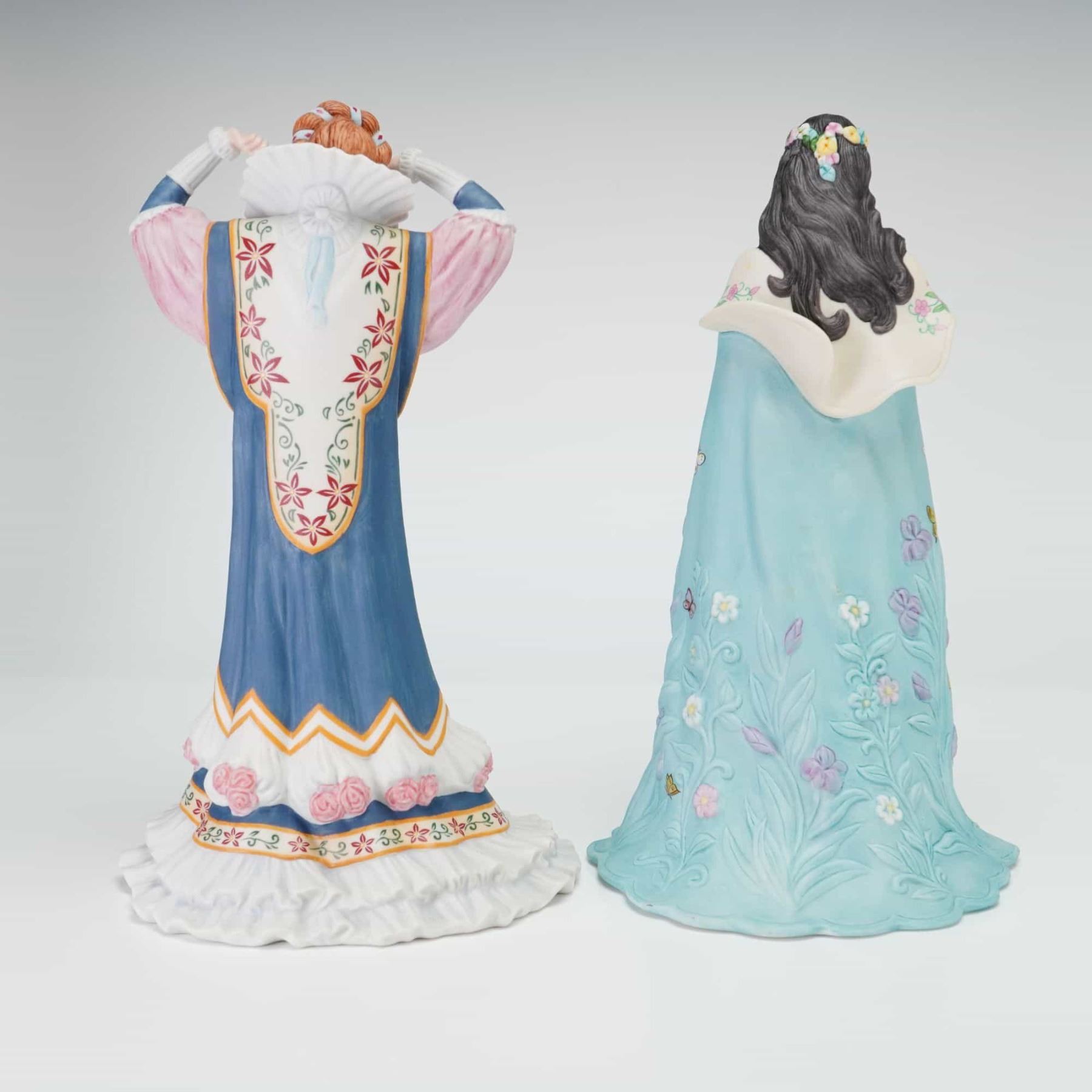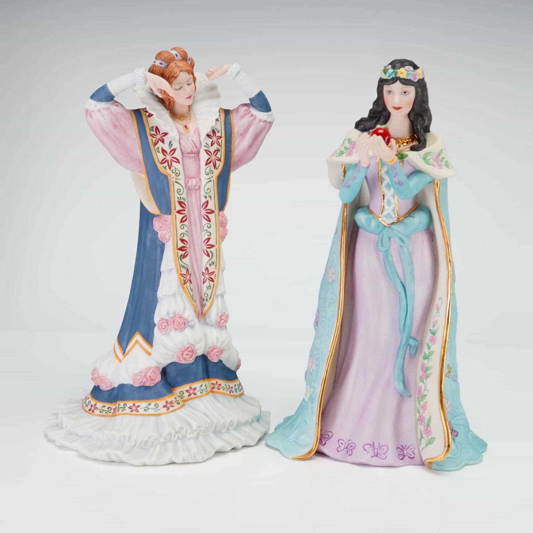 This lot features two fine porcelain figurines from the Lenox The Legendary Princesses collection, Sleeping Beauty and Snow White. Both pieces are crafted from fine porcelain with a matte bisque finish and hand-painted details. The Sleeping Beauty figurine is depicted with auburn hair and a tall, pleated white ruff collar. She wears a multi-colored gown in shades of blue, pink, and white, featuring red and green floral embroidery patterns and applied three-dimensional pink roses. The Snow White figurine is shown with black hair adorned with a floral crown, holding a high-gloss red apple. She wears a lavender and light blue gown under a pale blue cape decorated with butterfly and floral motifs and finished with a gold-gilded edge. Both marked Lenox and The Legendary Princess Figurines.