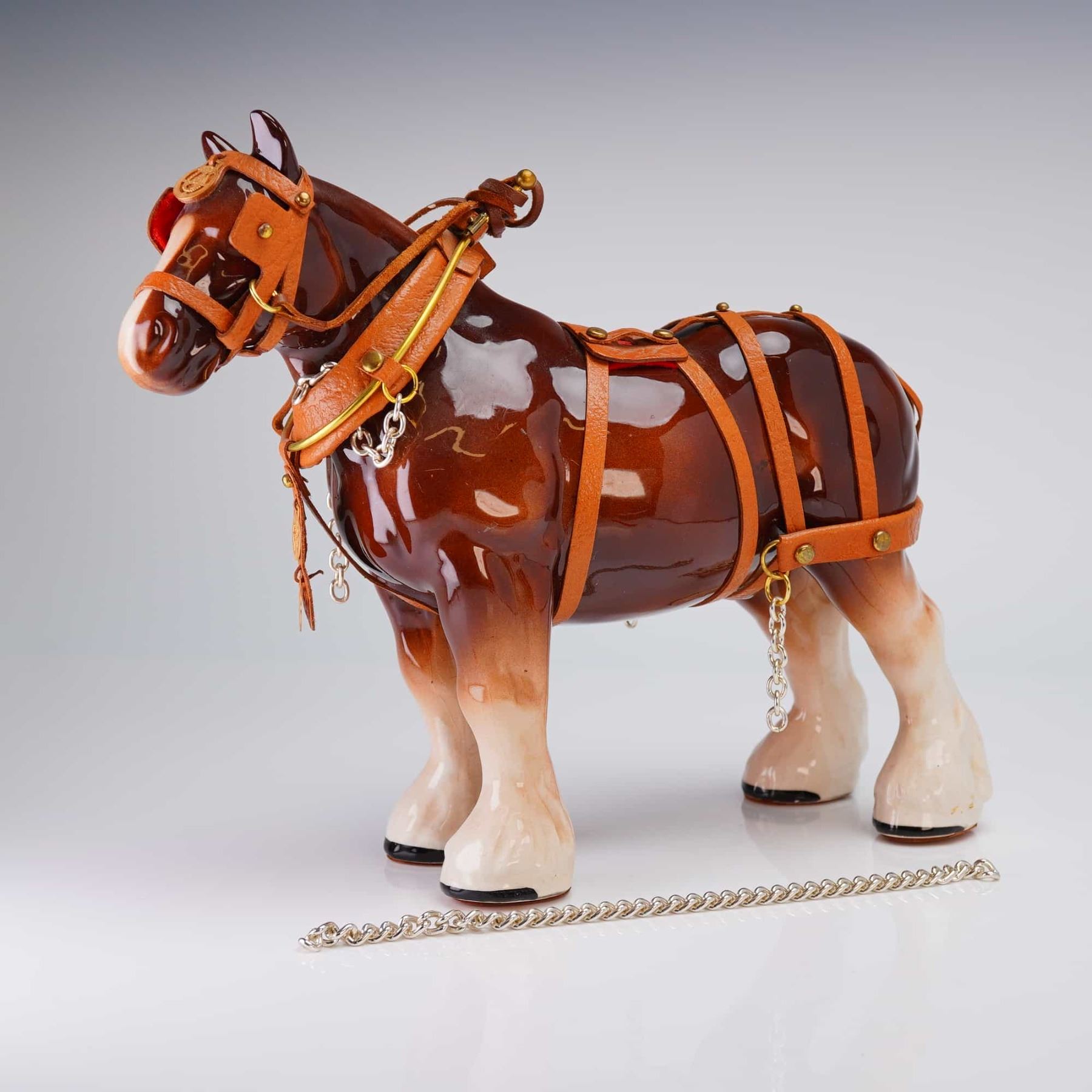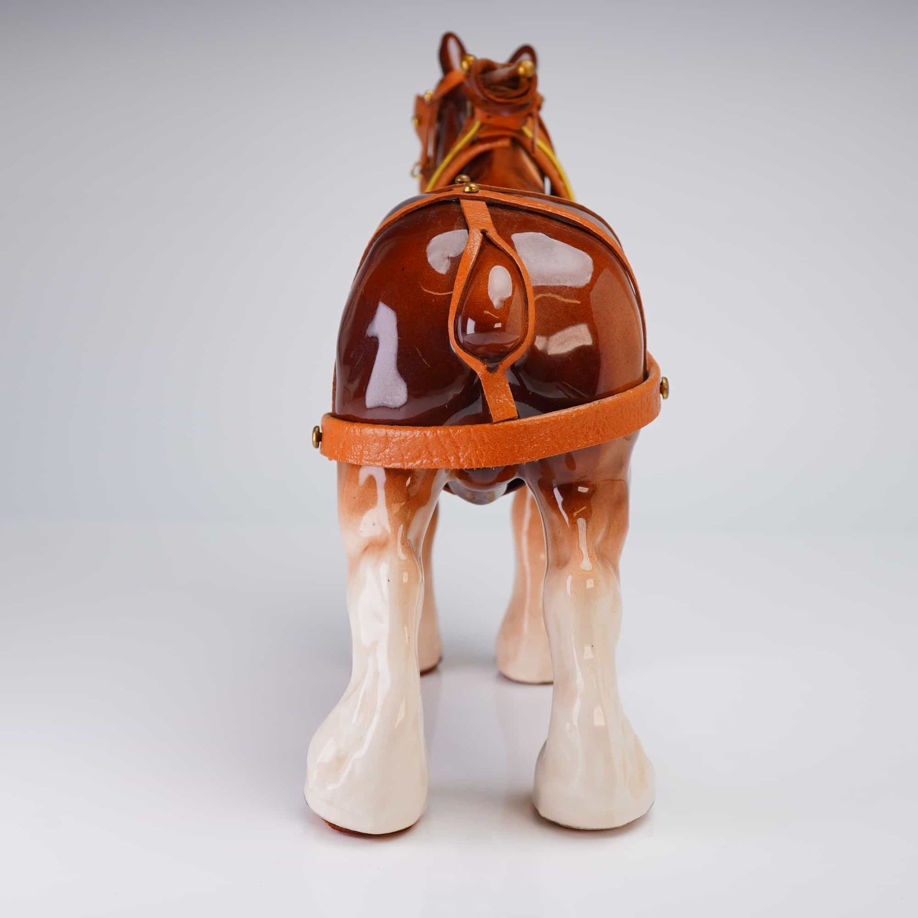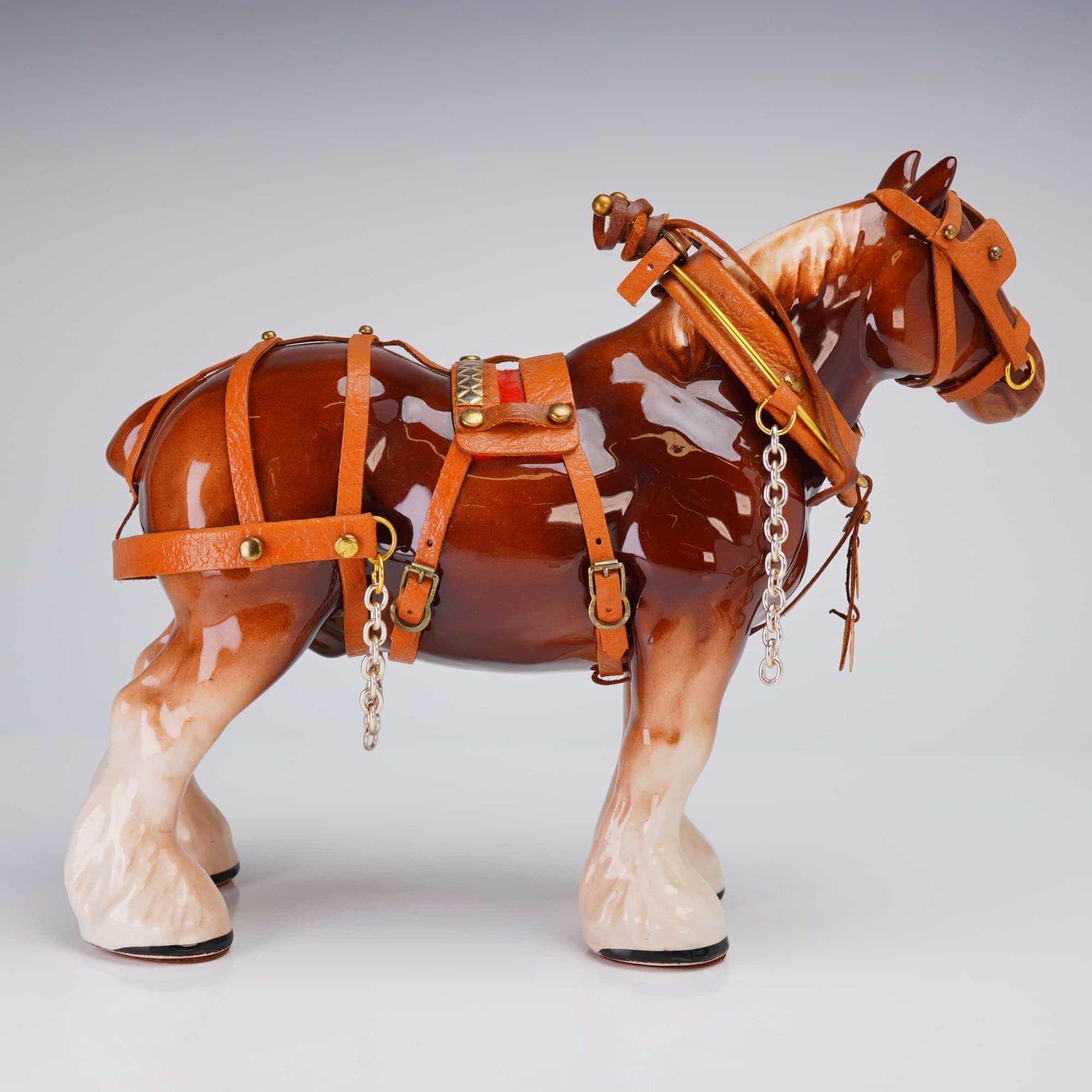 A single decorative ceramic figurine modeled as a harnessed draft horse, likely representing a Clydesdale breed. The figure is finished in a high-gloss brown glaze with white accents on the mane and lower legs. The horse is fitted with extensive, separately constructed tan leather harness gear, detailed with gold-toned metal buckles and hardware, and silver-toned chain accents. The underside of the belly bears a heavily blurred circular stamp, partially legible, suggesting a Staffordshire origin with visible fragments including STAFFOR[DSHIRE and [R]OYAL.