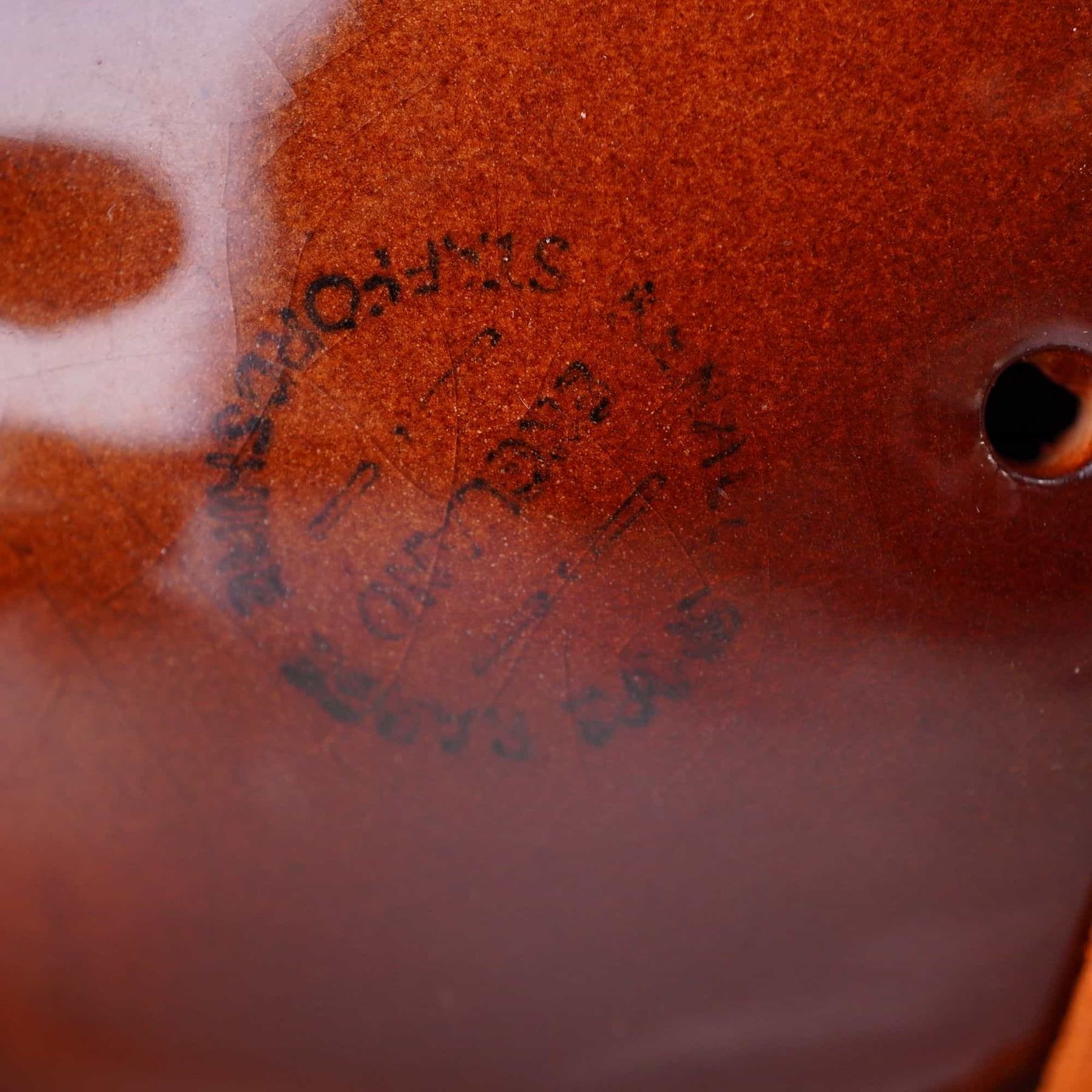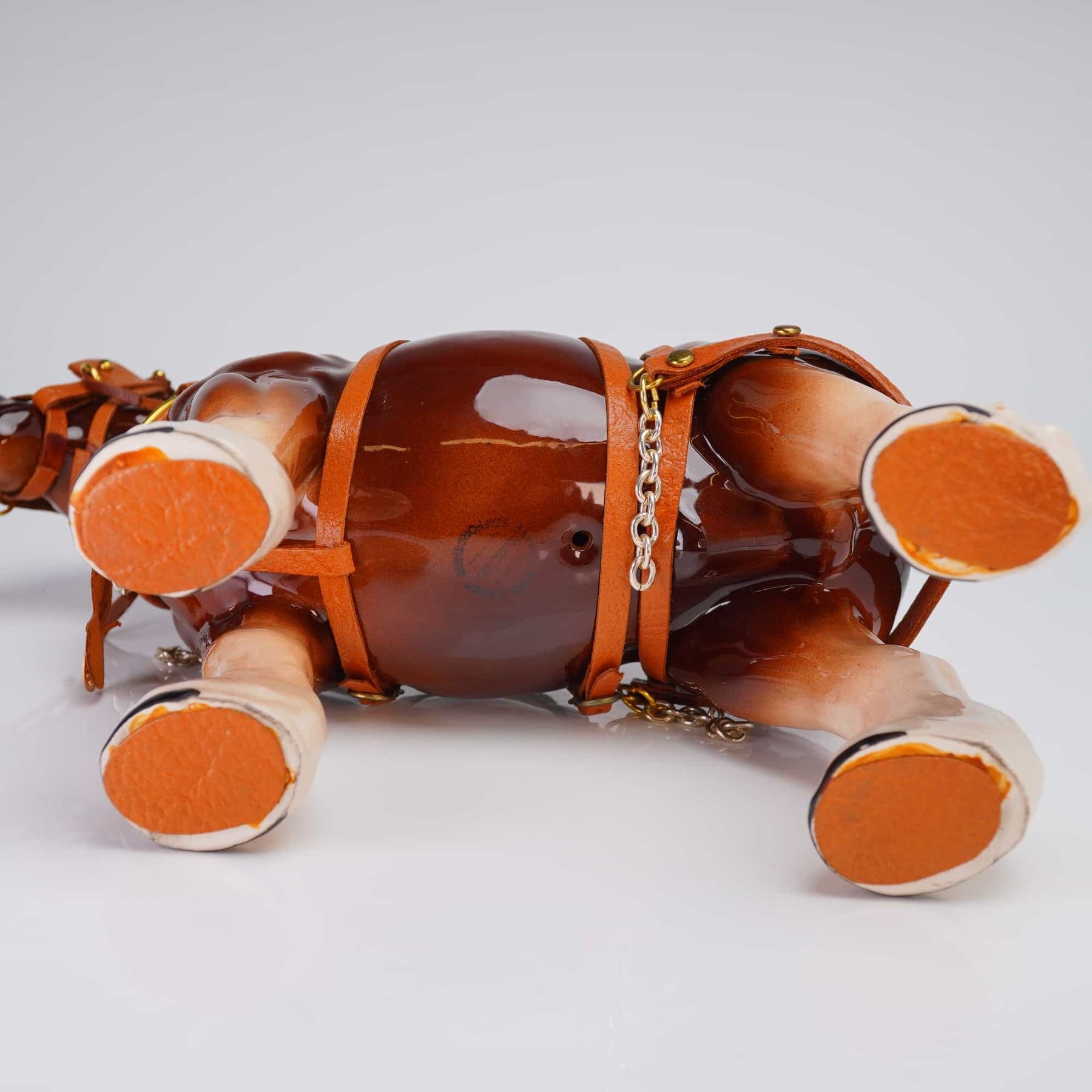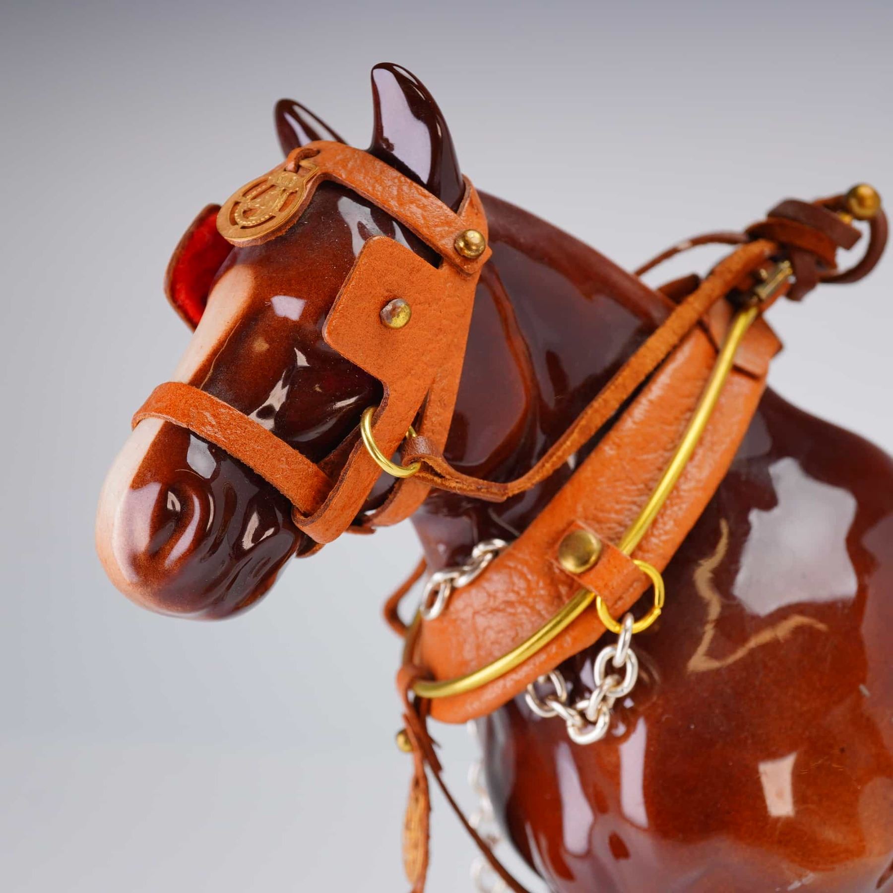 A single decorative ceramic figurine modeled as a harnessed draft horse, likely representing a Clydesdale breed. The figure is finished in a high-gloss brown glaze with white accents on the mane and lower legs. The horse is fitted with extensive, separately constructed tan leather harness gear, detailed with gold-toned metal buckles and hardware, and silver-toned chain accents. The underside of the belly bears a heavily blurred circular stamp, partially legible, suggesting a Staffordshire origin with visible fragments including STAFFOR[DSHIRE and [R]OYAL.