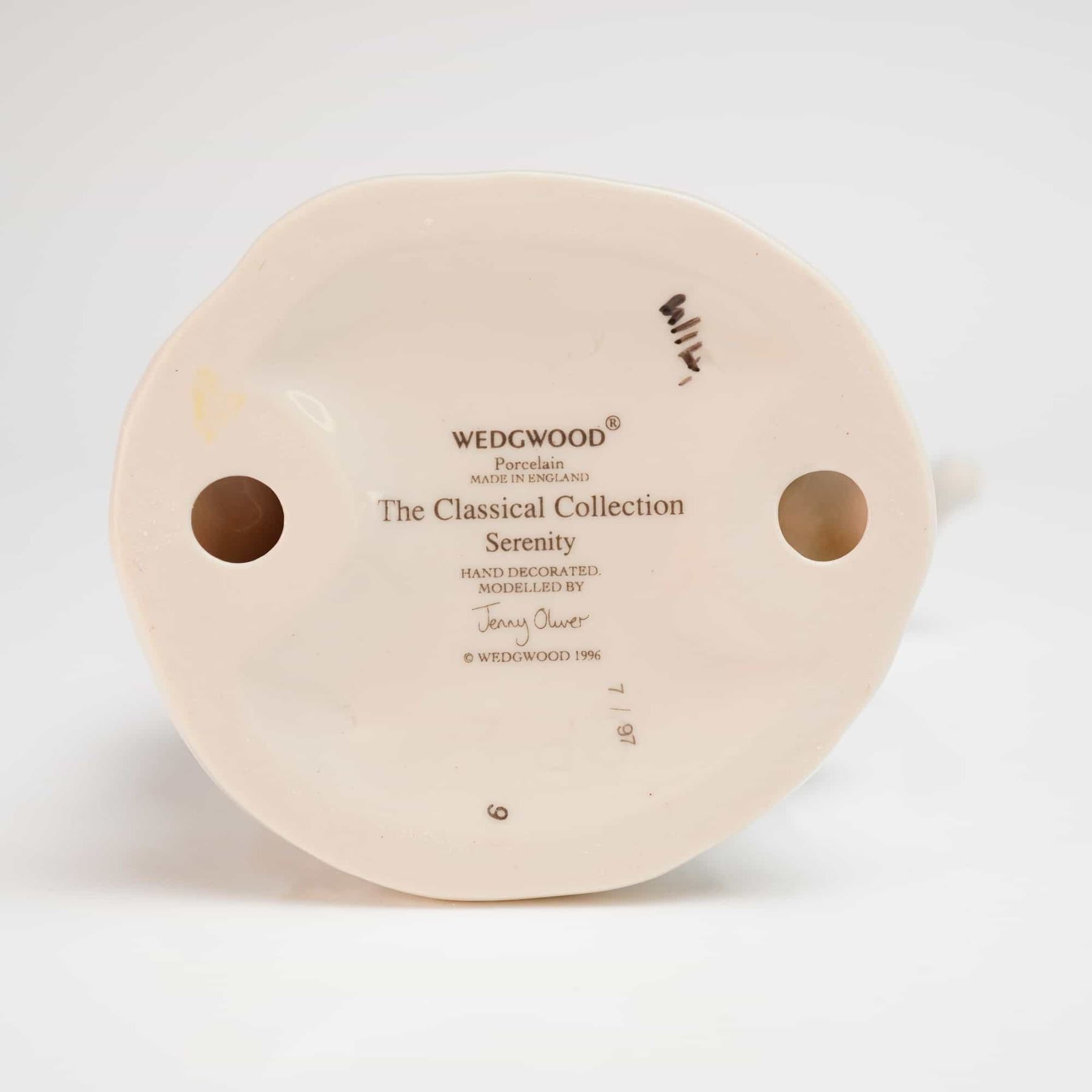A Wedgwood porcelain figurine titled Serenity from The Classical Collection. This hand-decorated figure was modeled by artist Jenny Oliver. The standing female figure is depicted in a classical style, wearing a light blue off-the-shoulder gown with draped folds. The waist and shoulder are accented with small blue and white floral details. The figure is positioned on a circular base with a light green textured surface. The underside of the base features a printed backstamp including the manufacturer mark WEDGWOOD Porcelain MADE IN ENGLAND, the collection and item titles, and the printed signature of the modeler. It also bears a copyright date of 1996 and the numerical markings 7 / 97.
