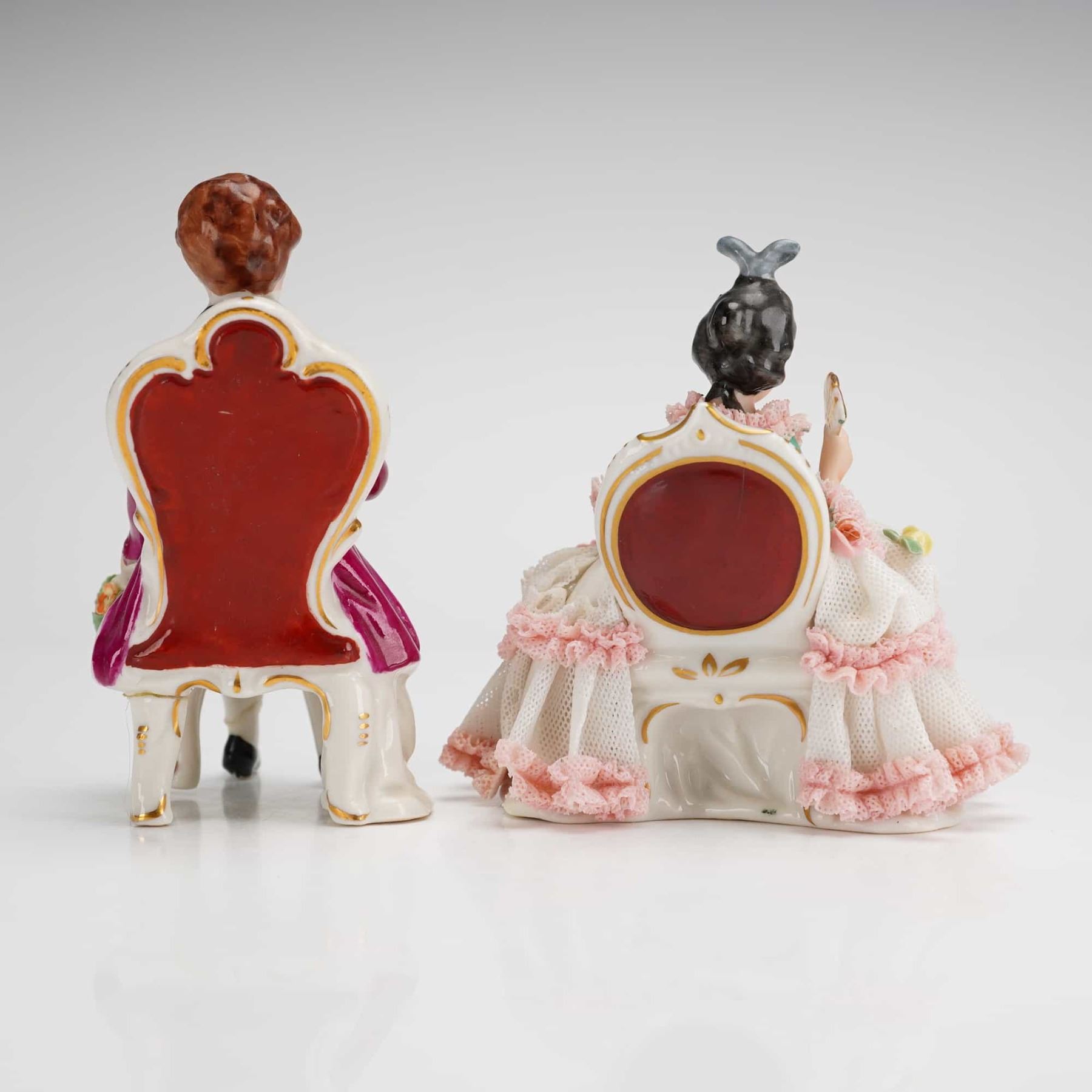 Porcelain lace figurines are hand-painted and feature intricate applied porcelain lace details. The male figure is depicted in a purple frock coat and green breeches, seated on a gilt-accented chair while holding a small bouquet of flowers. The female figure is seated in a voluminous white gown embellished with pink porcelain lace ruffles and holds a fan.