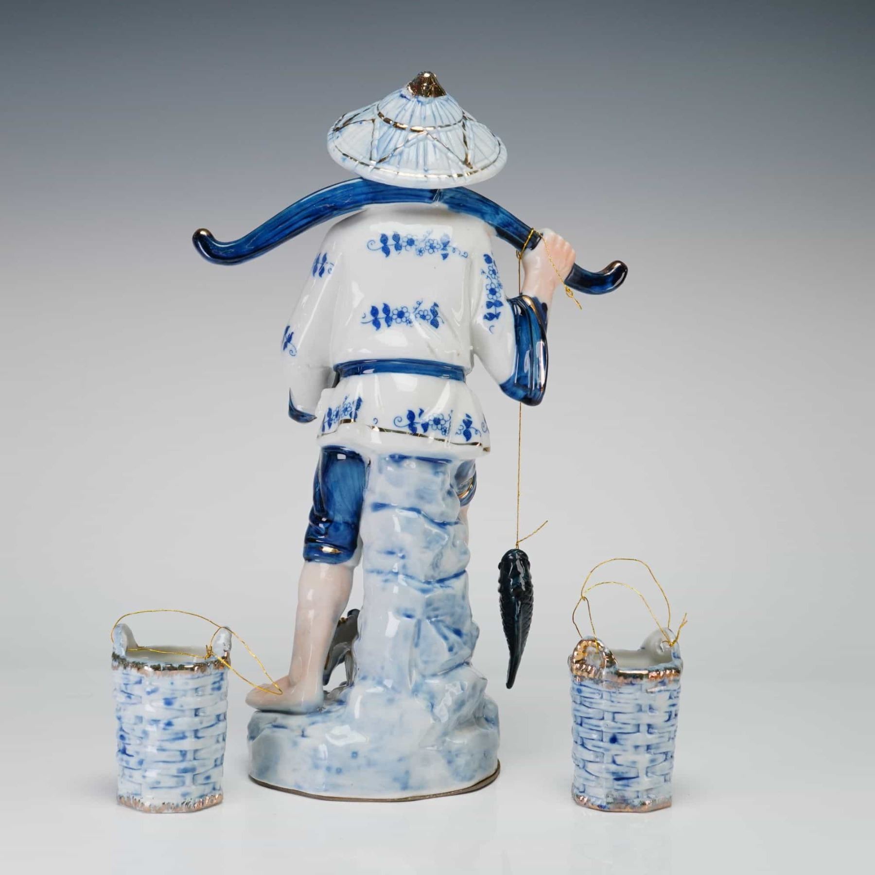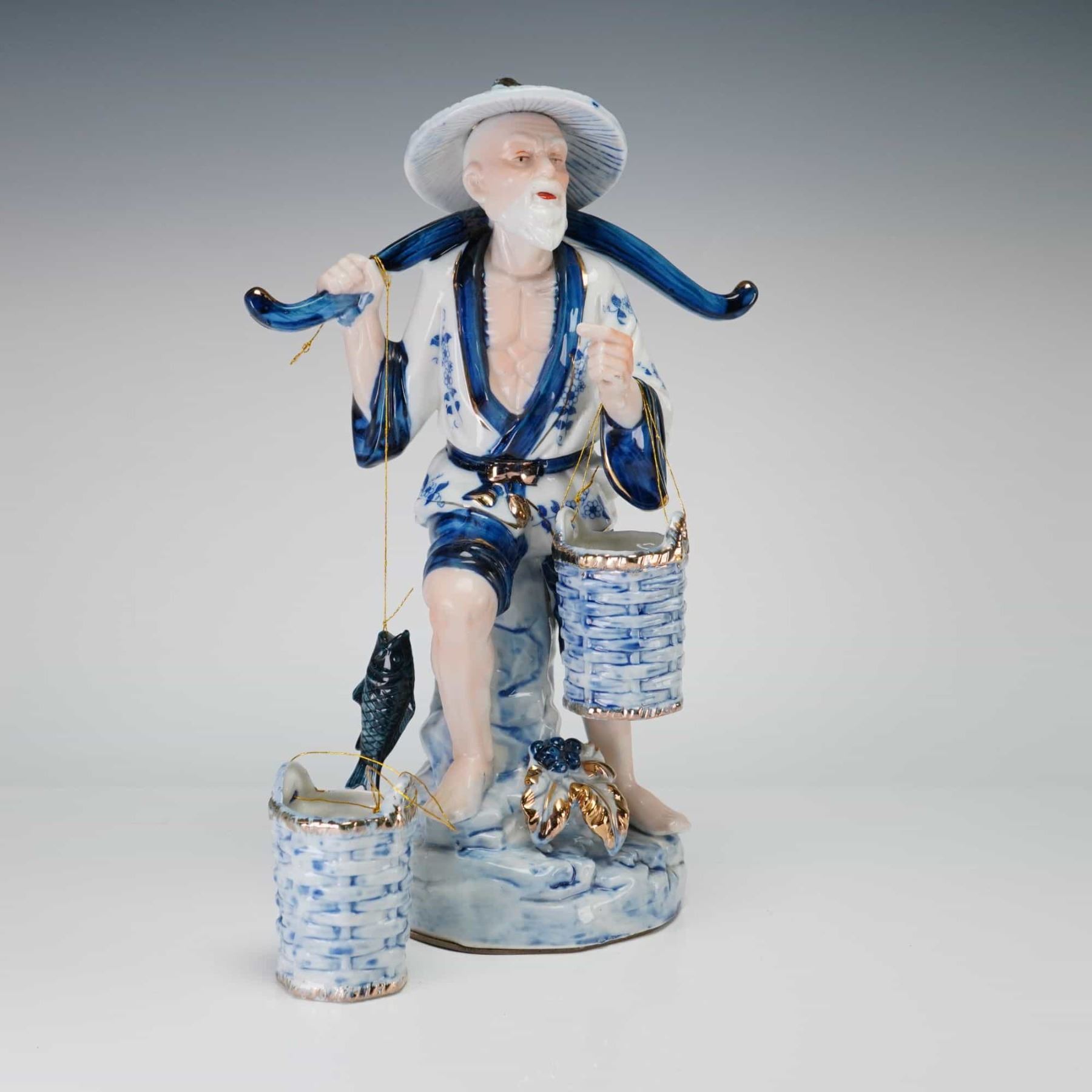 This four-piece glazed porcelain figurine set depicts an elderly fisherman with baskets and a fish. The central figure is modeled with a white beard and a wide-brimmed conical hat, dressed in a traditional robe and short trousers. The figure is decorated in a classic underglaze blue and white palette with extensive gilded highlights on the robe edges, hat, and baskets. The fisherman carries a curved blue-glazed yoke across his shoulders. The set includes two separate basket accessories featuring mottled blue sponged decoration and gilt-painted rims. A small dark-colored fish with a gold-tone wire is also included. This item is consistent with 20th-century decorative export porcelain produced in the Chinoiserie style.