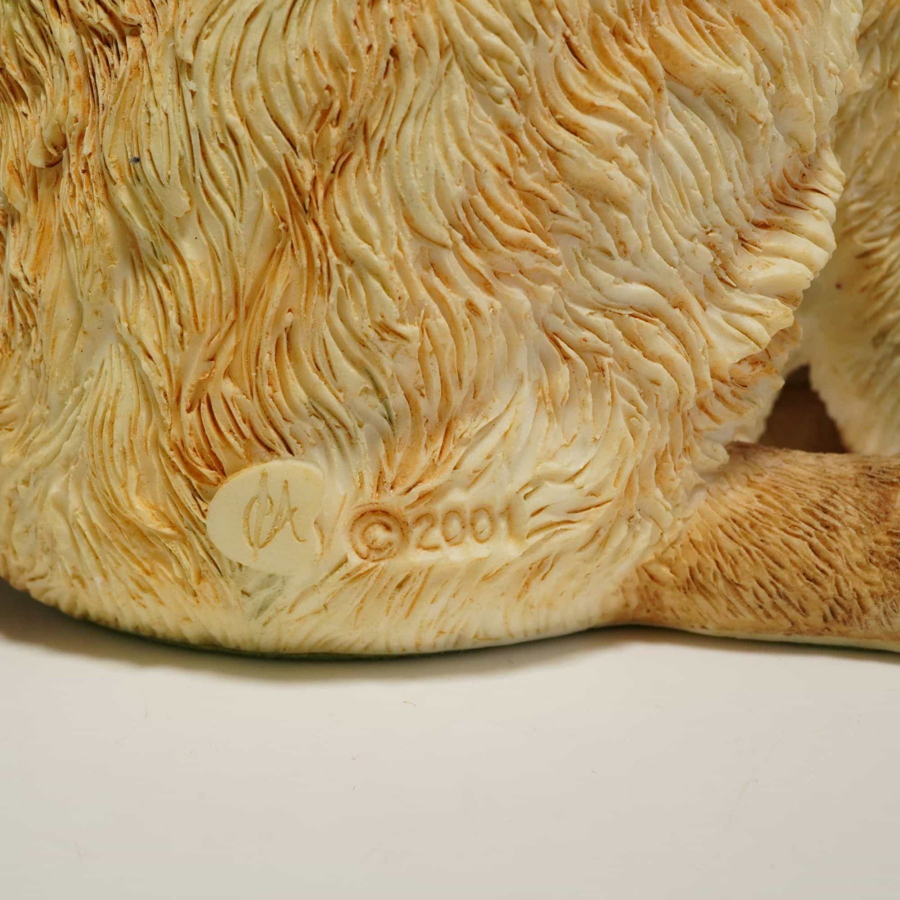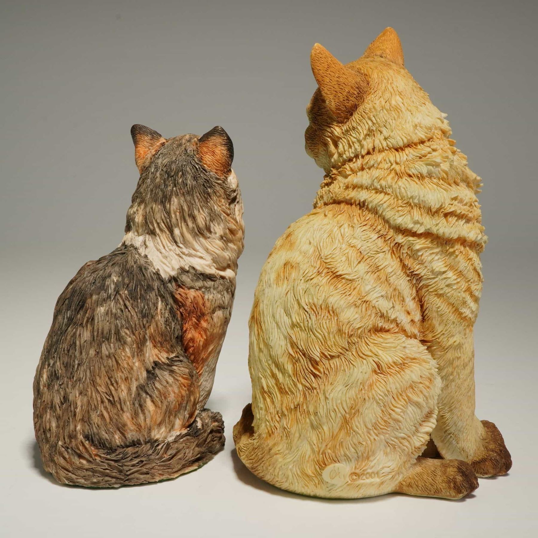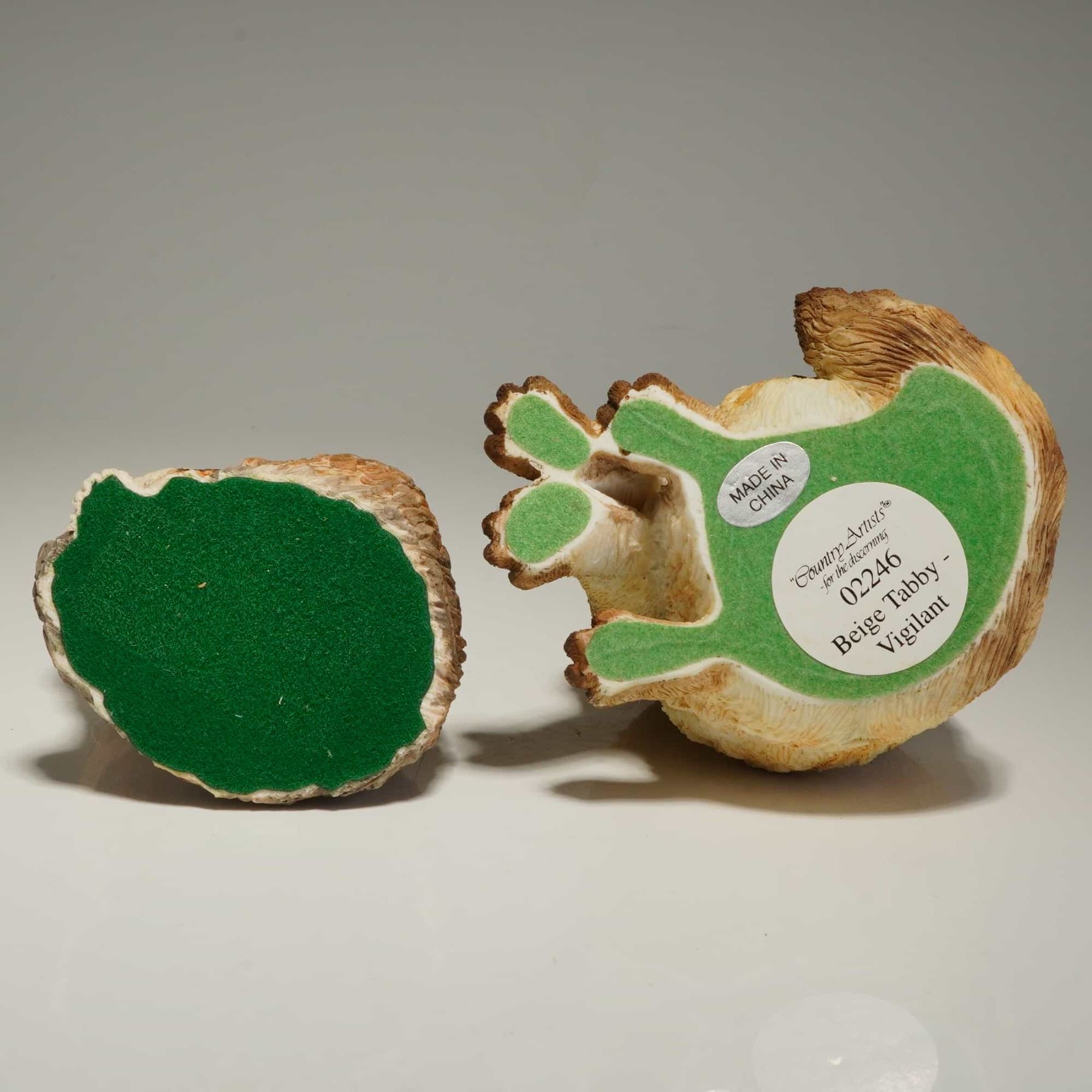 This lot features two collectible cat figurines, including the Country Artists model identified as Vigilant the Beige Tabby and a Border Fine Arts figurine of Agnetha the Long Haired Tabby. These cat figurines are produced in resin with hand-painted finishes and detailed, textured fur. The larger Country Artists figurine, model number 02246, is part of the For the Discerning collection and features an incised CA mark and a copyright date of 2001 on the rear. The second figurine, produced by Border Fine Arts, depicts the Agnetha model with a beautifully rendered calico-patterned coat. Both items are fitted with green felt pads on their bases, and the Vigilant figurine retains its original manufacturer's label.
