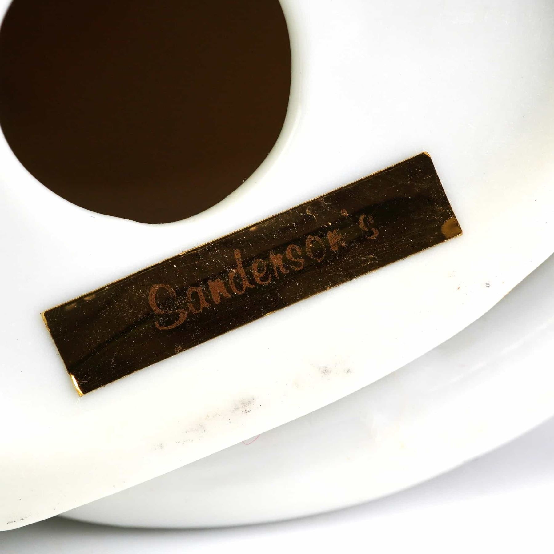 These stylized, seated cat figurines are designed in a mirrored fashion, featuring the sleek, elongated lines characteristic of mid-century modern design. The figures are crafted from white glazed porcelain with a high-gloss finish. The underside of one figurine retains a rectangular foil label for Sanderson's.