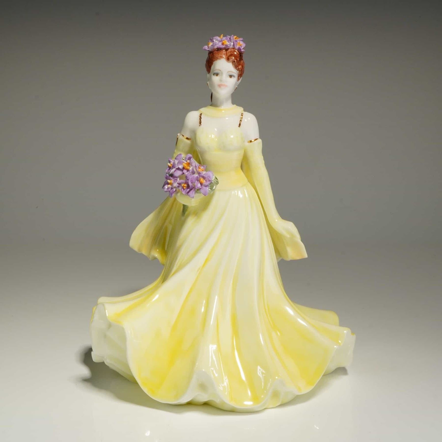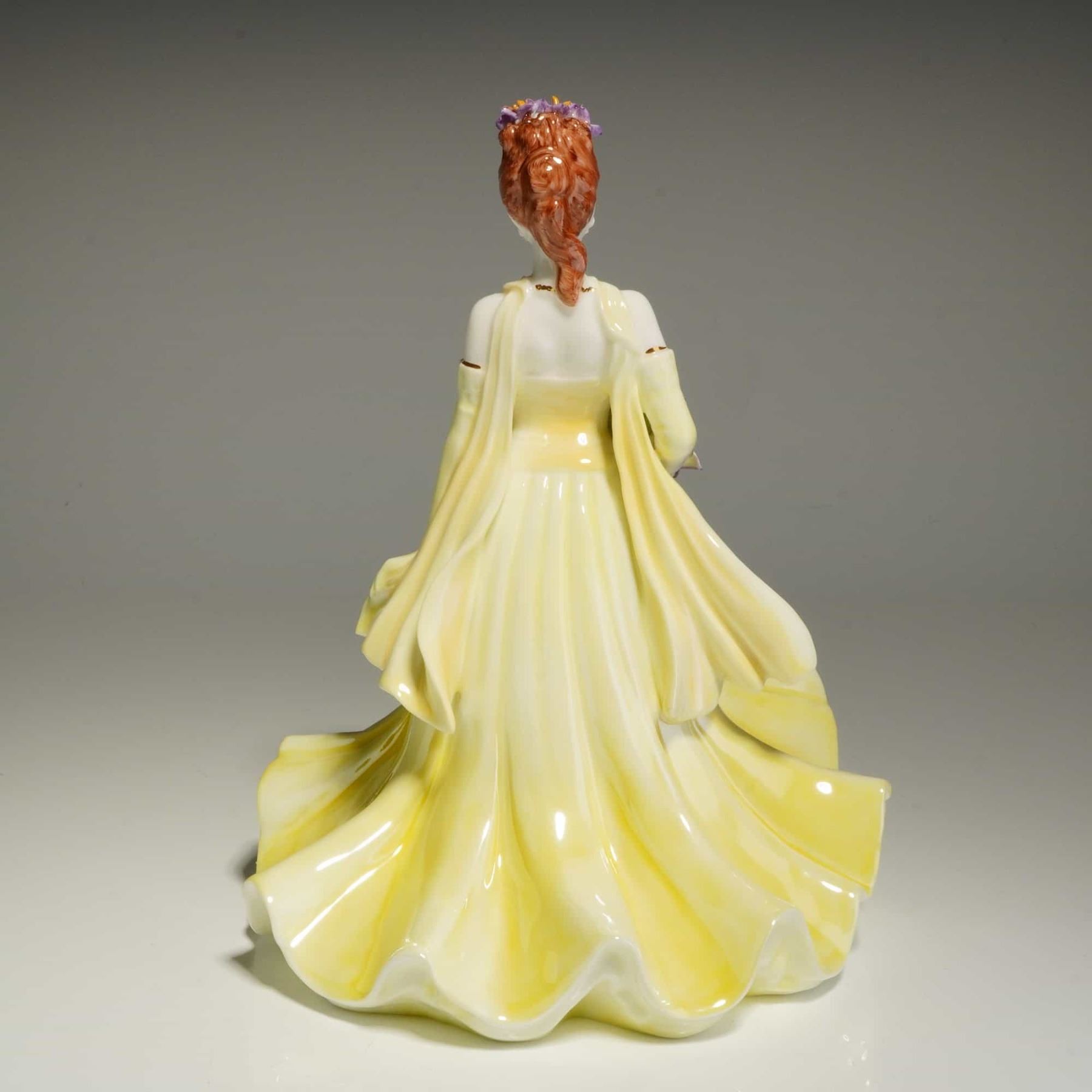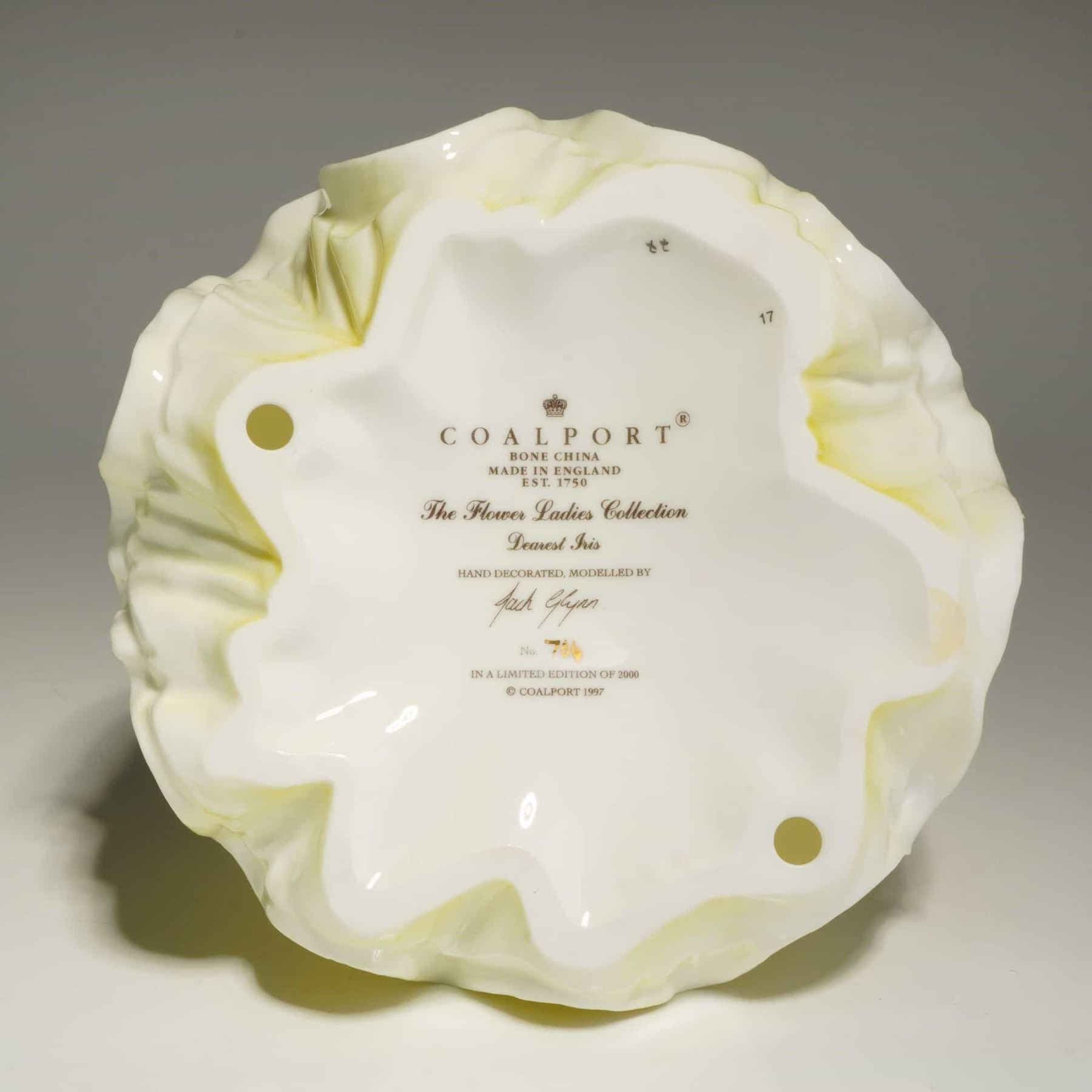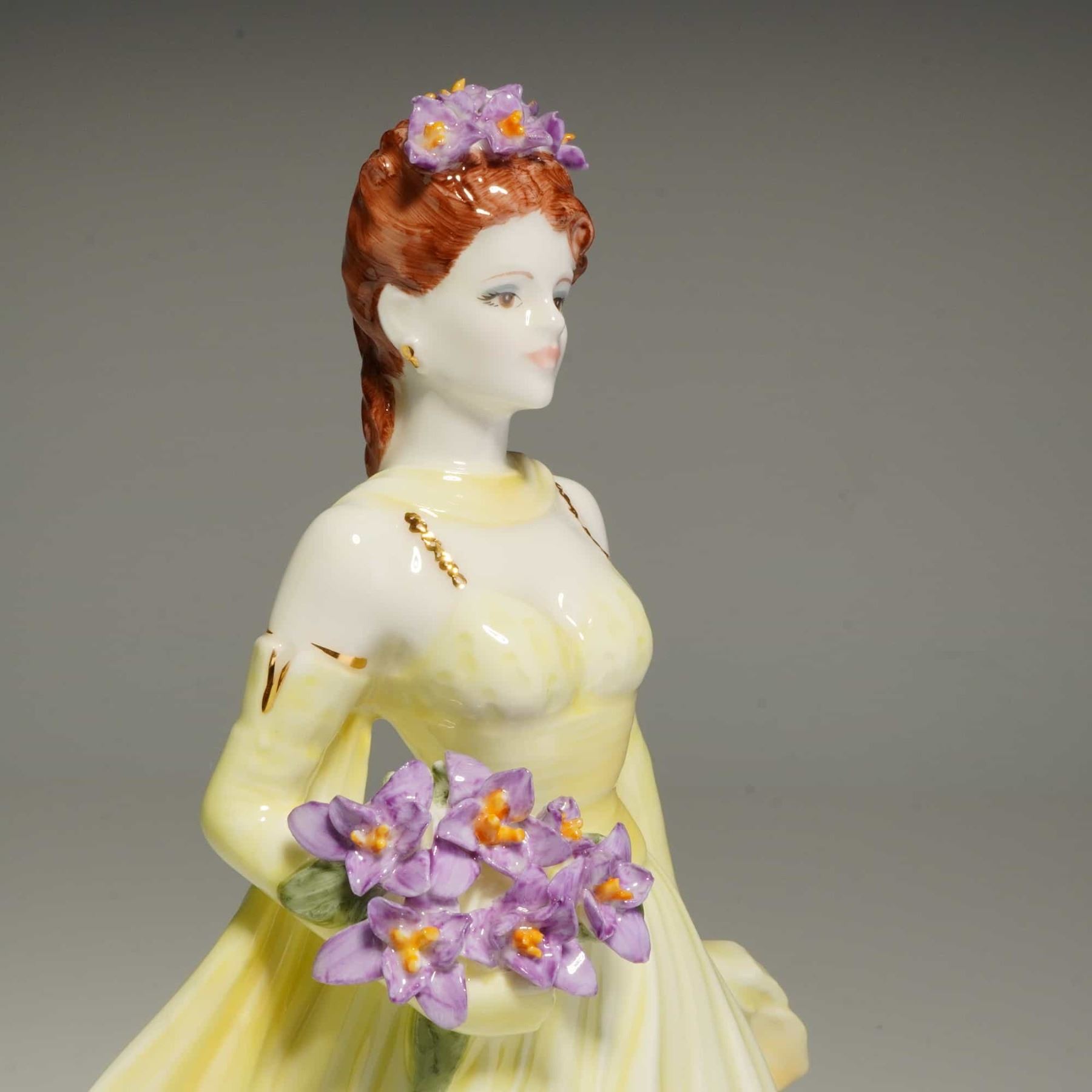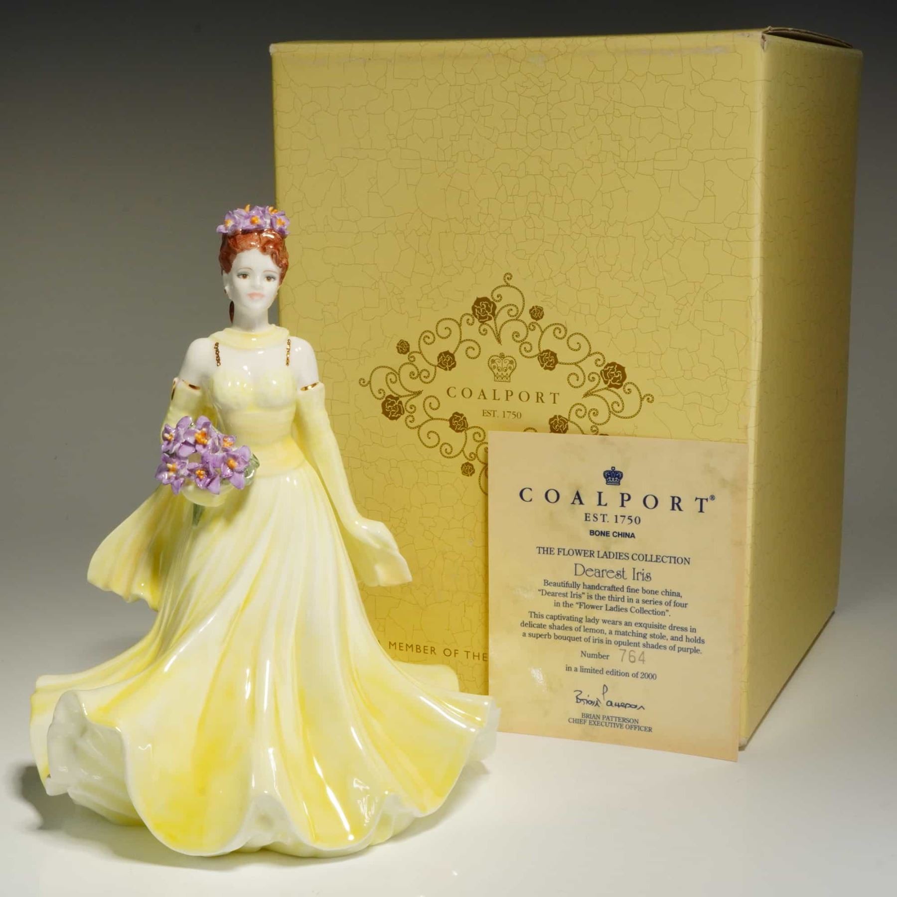 This hand-decorated figure depicts a woman with red hair wearing a pale yellow sleeveless gown and matching back stole. She is shown holding a bouquet of purple irises with a matching floral headpiece. The underside of the base bears the Coalport factory marks, the collection title, the model name, and the modeler's name, Jack Glynn. It is numbered 764 of a limited edition of 2,000 and is dated 1997. The lot includes the original box and a certificate of authenticity.
