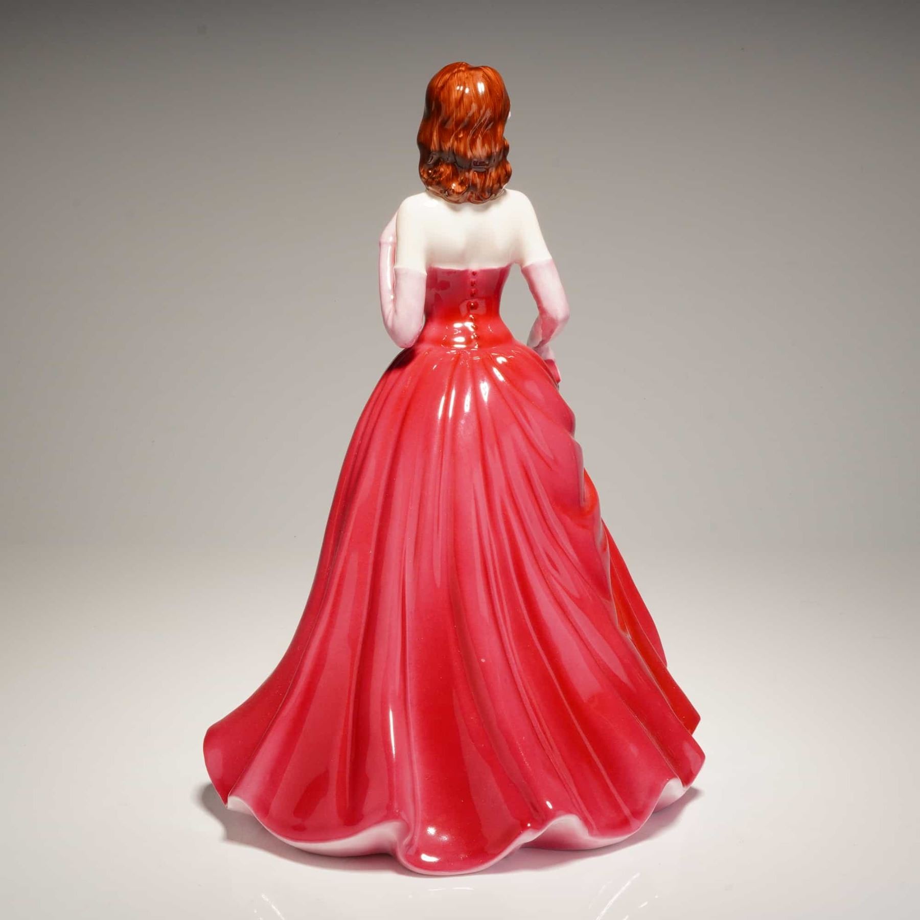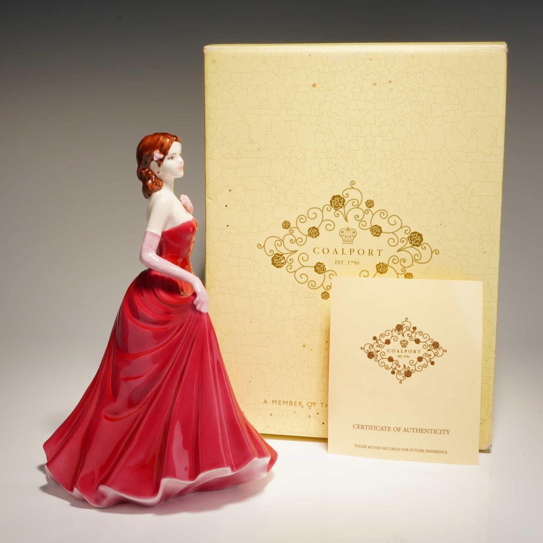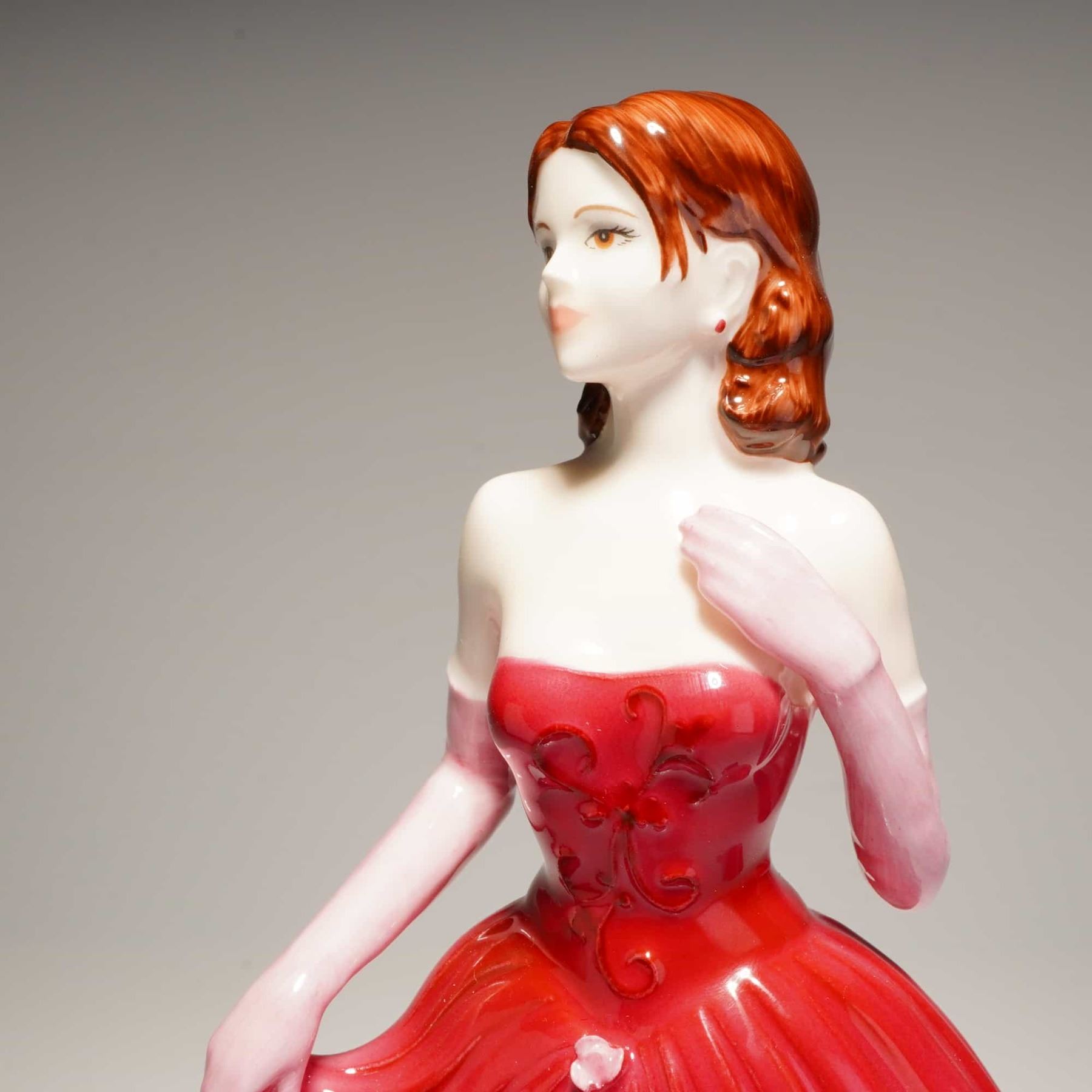 This hand-decorated piece was modeled by Jack Glynn and released as an exclusive for Collector's Choice members in 2002. The figurine depicts a woman in a flowing, strapless red evening gown featuring scrolled floral detailing, accessorized with long pale pink opera gloves and a small flower in her auburn hair. The underside bears the official Coalport factory marks, identifying the piece, the collection, the modeler, and the year 2002. This item has a Certificate of Authenticity and the original presentation box is included in weight.