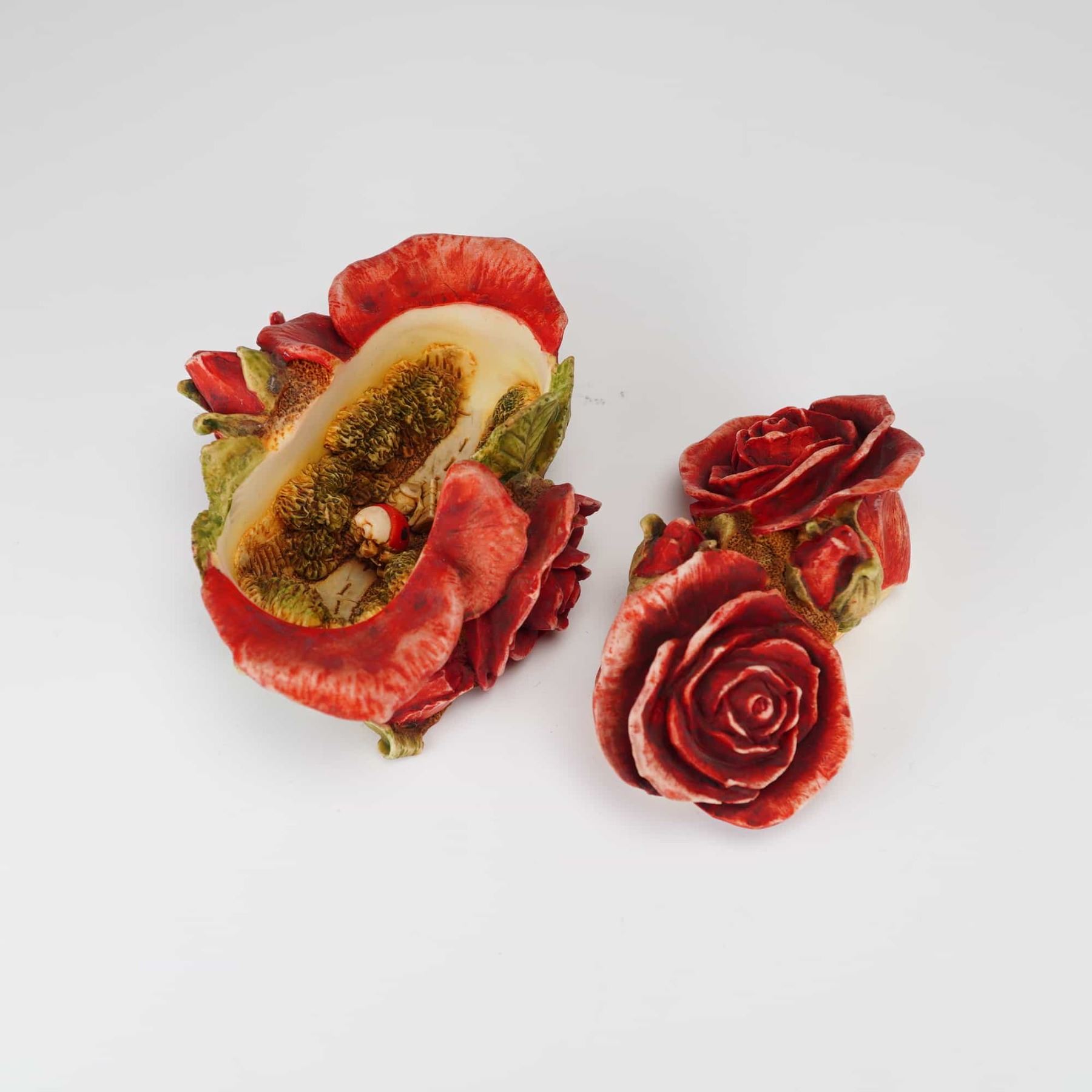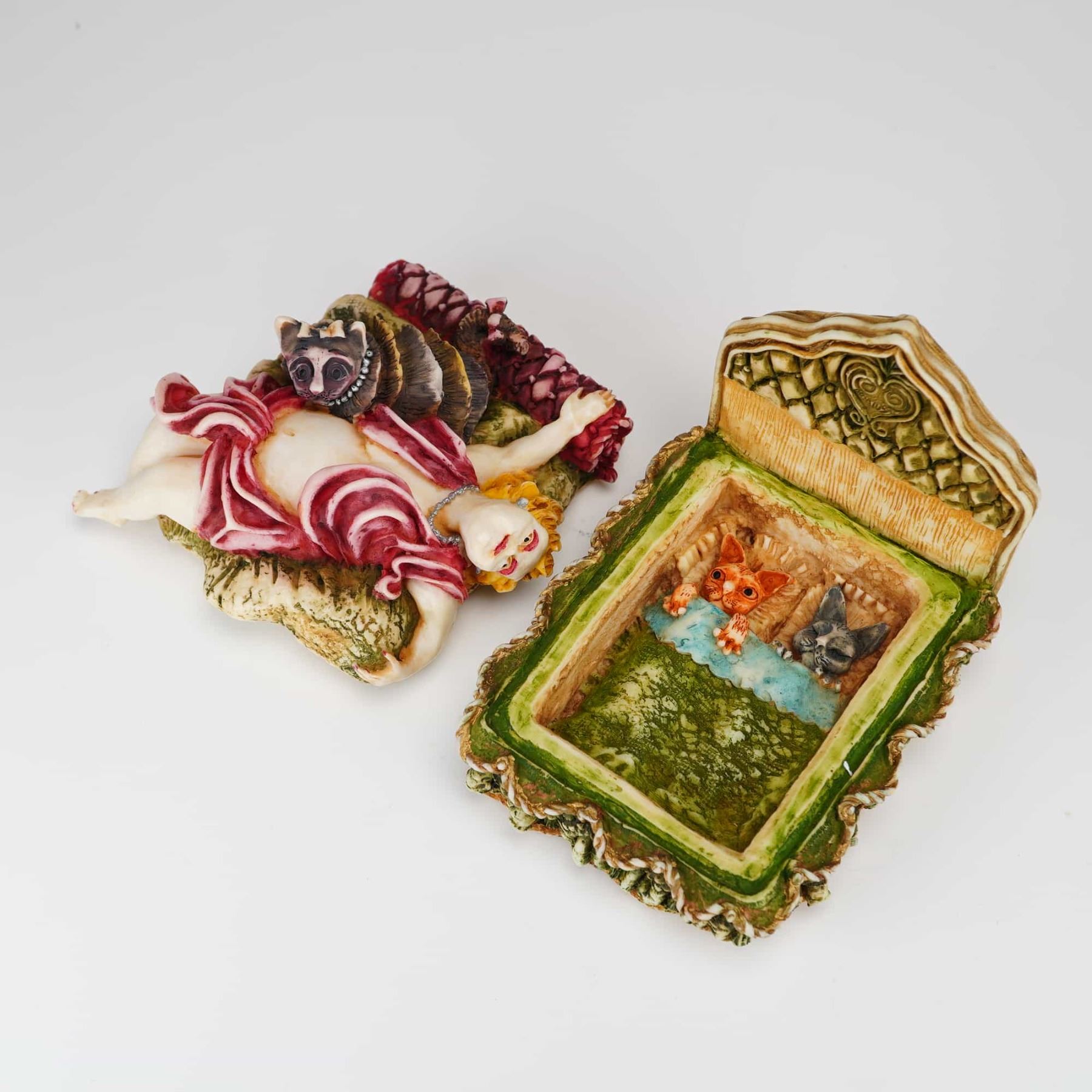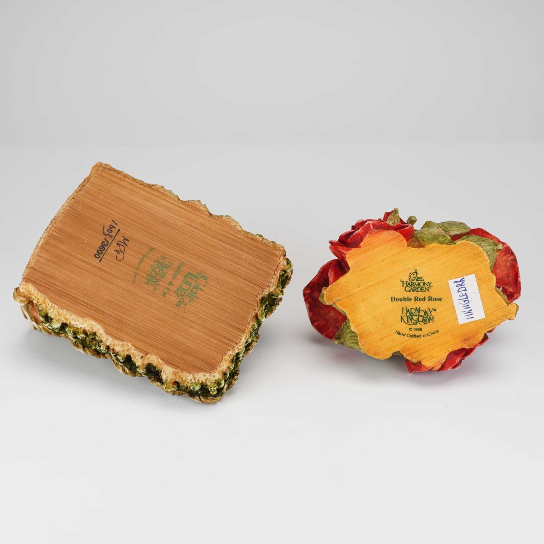 Two Harmony Kingdom cast resin jewelry boxes, including Justine and Cat from the Clair de Lune series and Double Red Rose from the Harmony Garden series. These items are constructed from hand-painted marble resin with a textured, matte finish. The Justine and Cat box depicts a reclining figure and a cat on a bed, with an interior surprise featuring two nested kittens. The base is marked with the Harmony Kingdom hallmark, the series title, the inscription Aurelie and Cat, and is hand-numbered 1603/3600. The Double Red Rose box is shaped as a cluster of roses and leaves, containing a small ladybug detail within the interior. The base is marked Harmony Garden, Double Red Rose, and dated 1998. Both pieces are marked Hand Crafted in China. Measurement is for largest item.