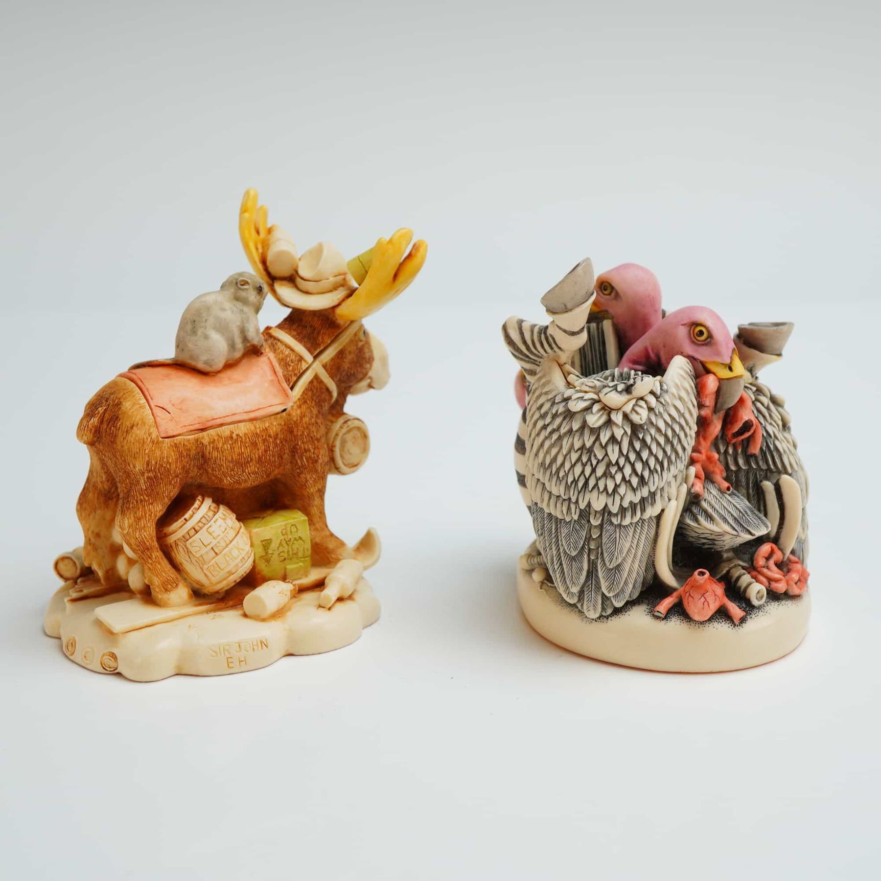 The first piece, titled Beer Nuts, features a moose on skis accompanied by beavers and brewery-themed accessories including a barrel labeled Sleeman and loose bottles. The second piece, titled Bum Wrap, is a limited edition from the Black Box series, featuring vultures surrounding a zebra-patterned form. Both pieces are designed as small boxes with removable tops that reveal intricate interior carvings. The model numbers are TJLECAN2 & TJBB02.The bases are marked with Harmony Kingdom labels and include the artist signatures and edition numbers where applicable.